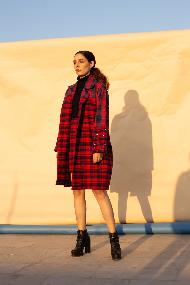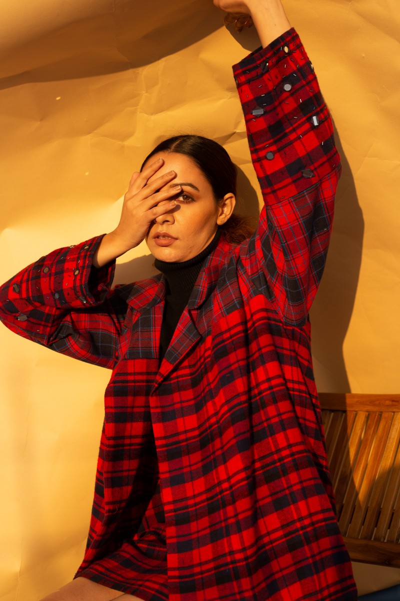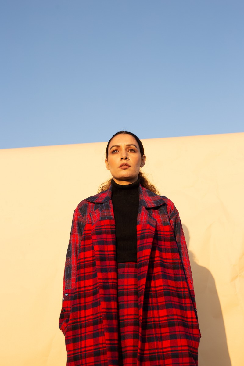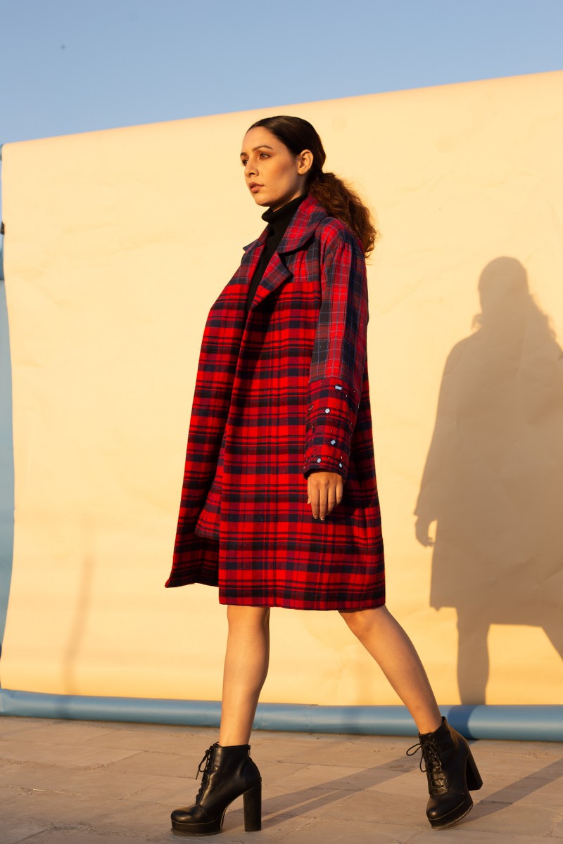 Swaroop Exclusive Design. The Oija is a marriage between Indian textile and modern silhouettes. The fabric of the coat is in brushed check which gives you warmth. Embellished with mirrors, sequin and pipe work using traditional Aari work techniques done by our in-house karigar, Munim Ji.