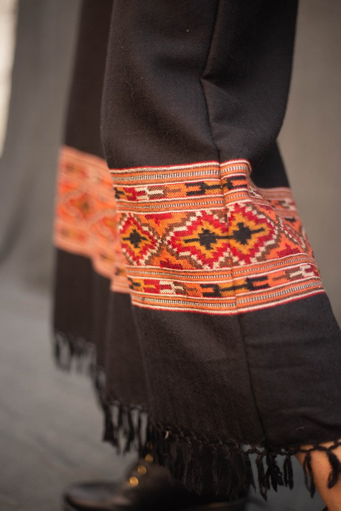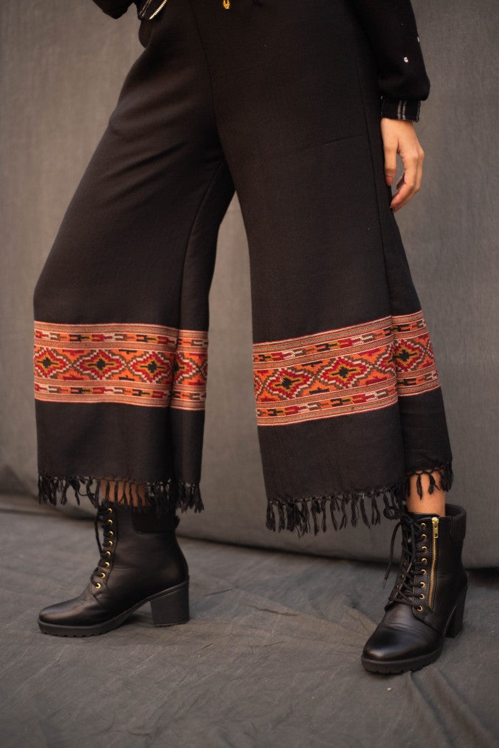 Swaroop Exclusive Design. The Tribal plazzo is a flared pant made of pure wool which is very warm and thick, handwoven by the weavers of Kullu using their traditional techniques. The pants are enhanced by tribal Kullu borders and fringes. Detailed with high waist side zipper for fastening.