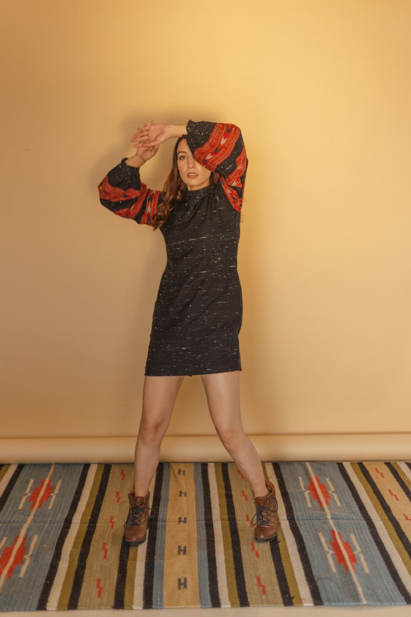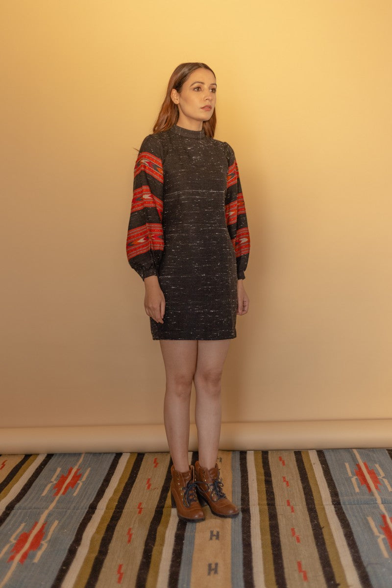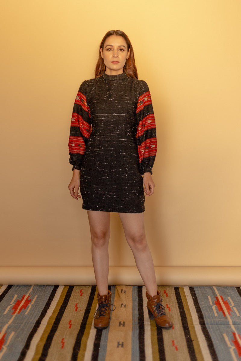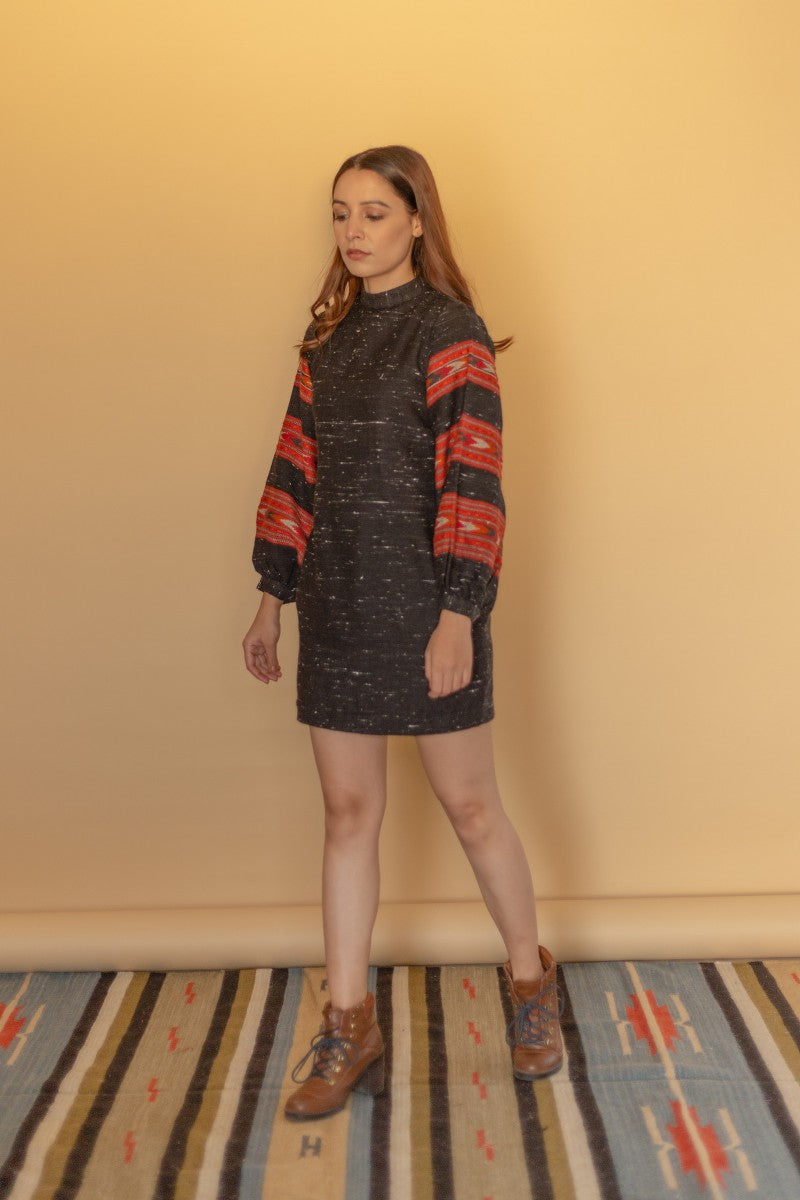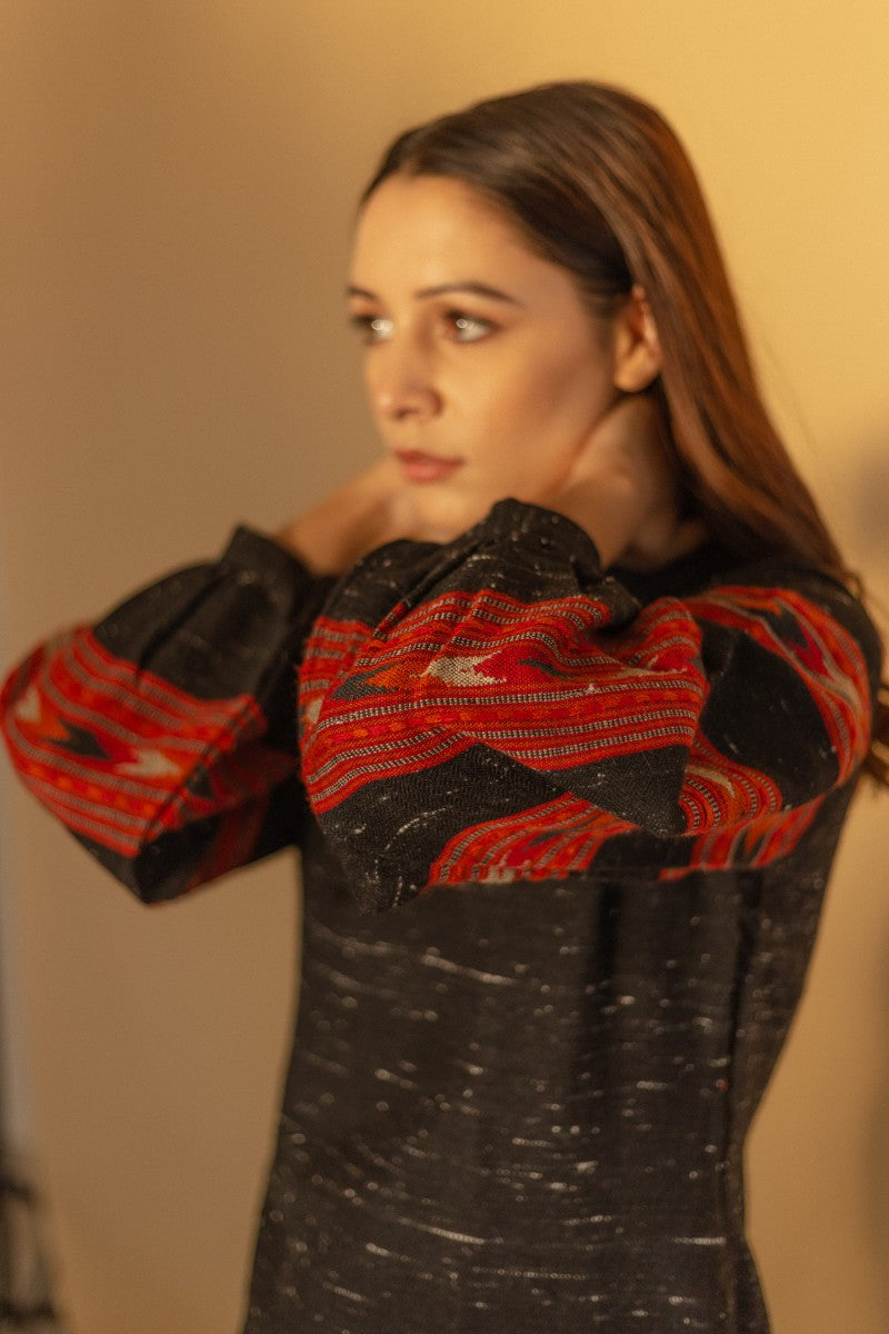 Swaroop Exclusive Design. The Tribal dress is a fusion of Indian tradition and western wear. The fabric of the dress is hand spun by the weavers of Kullu, Himachal Pradesh. It keeps you warm throughout the day. Emphasized with tribal kullu borders on balloon sleeves and features high neckline and straight hem.