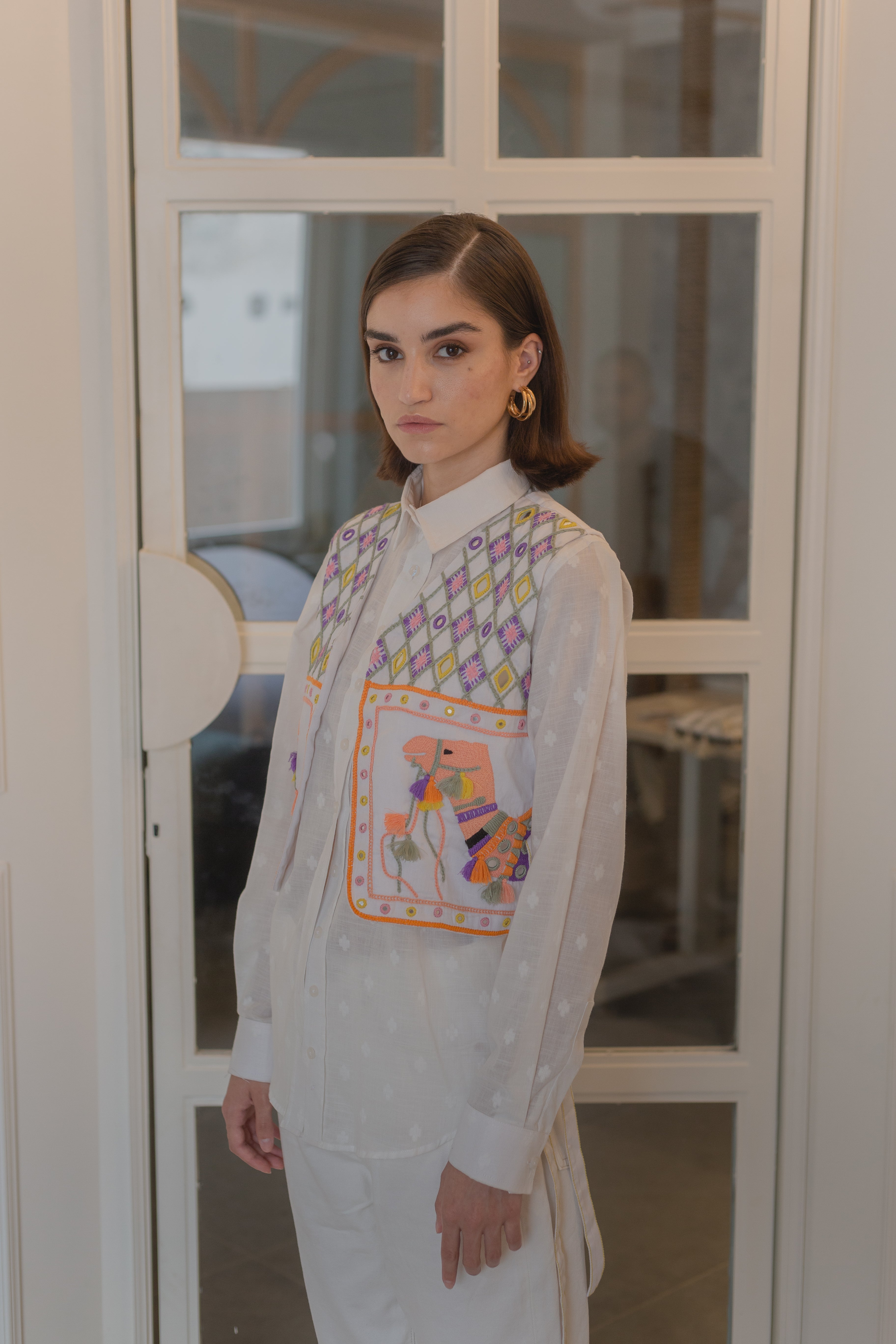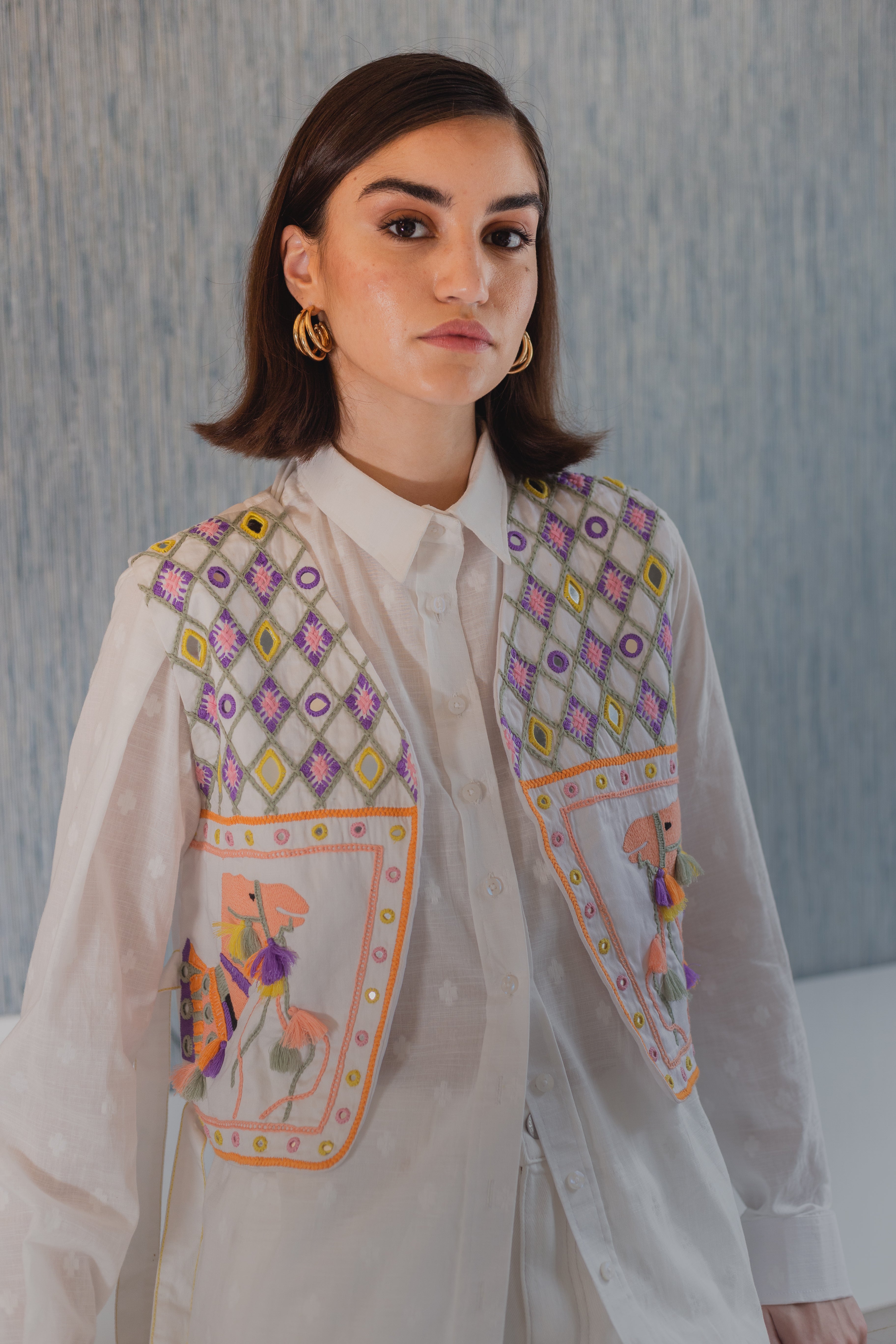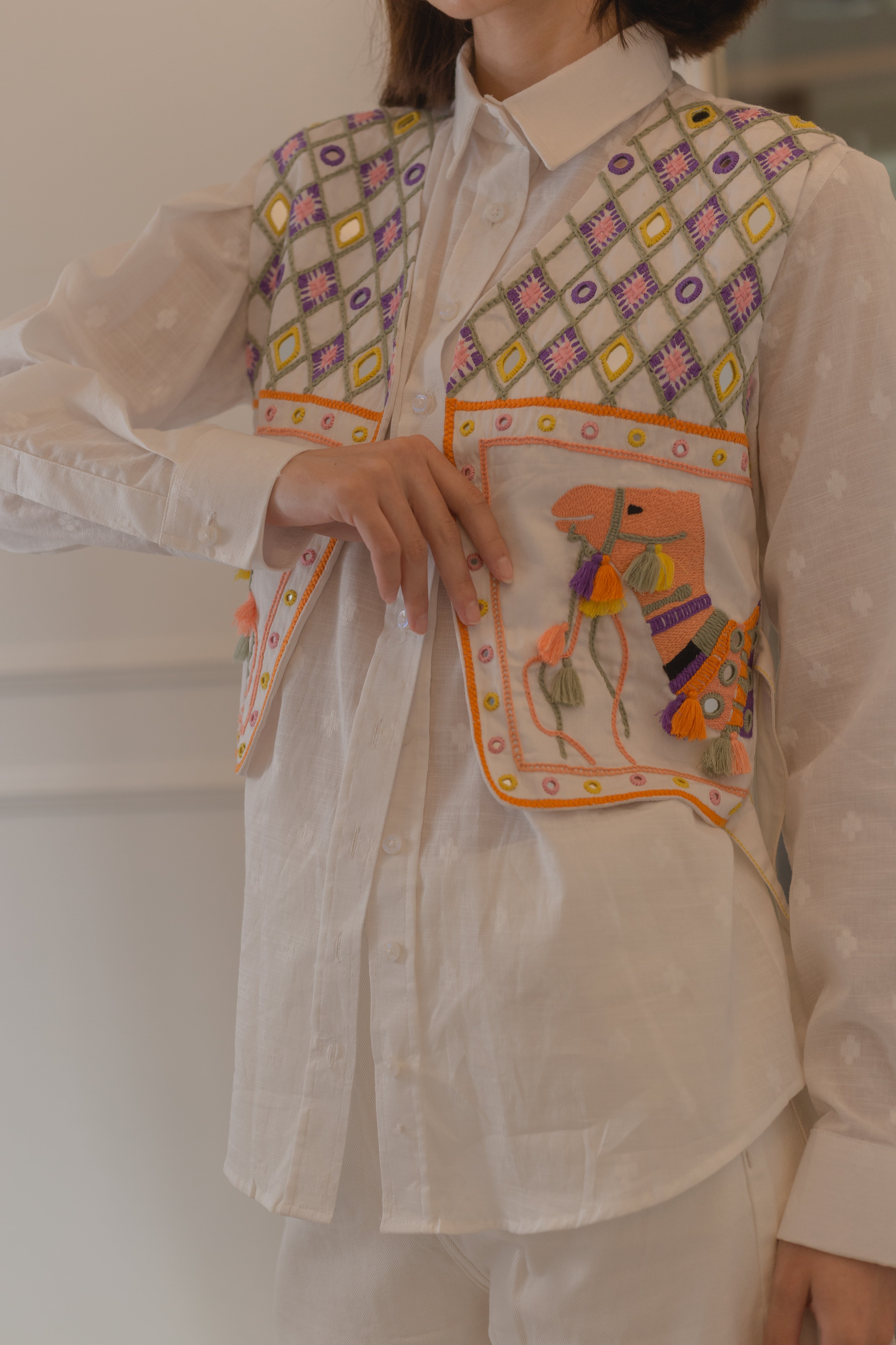 Swaroop Exclusive Design. This Festive season flaunt this "Bohemian Camel Jacket" with hand embroidered mirror - work inspired from Kutch, Gujarat. Pair this Jacket with a classic white kurta for an Indie look or with a plain white shirt for casual outings.