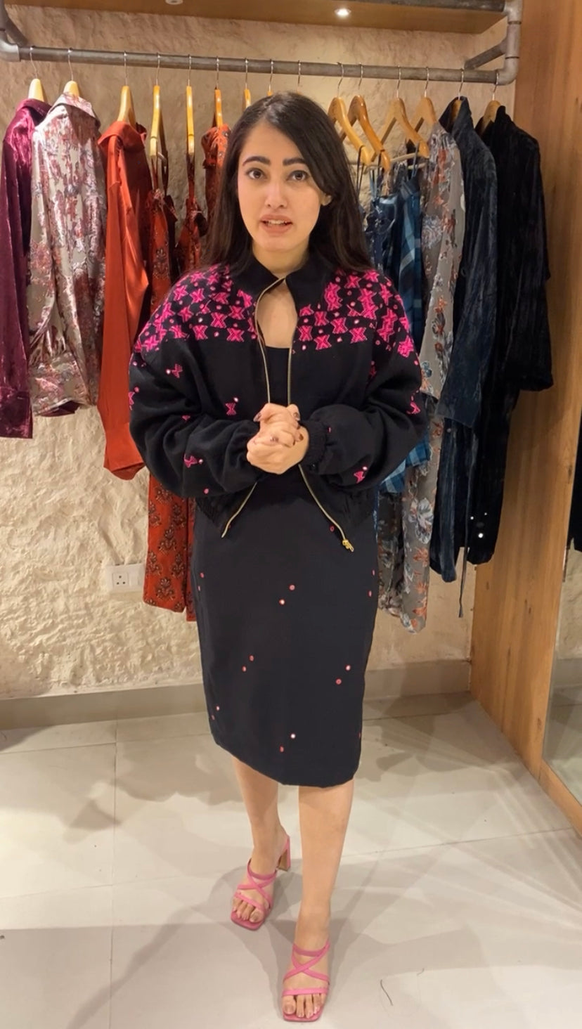 Swaroop Exclusive Designs. Featuring High-waist midi length skirt with invisible side zip fastening. Enhanced with hand-embroidered mirror work all over. Pair it with our Gulabo bomber jacket for that perfect winter look.