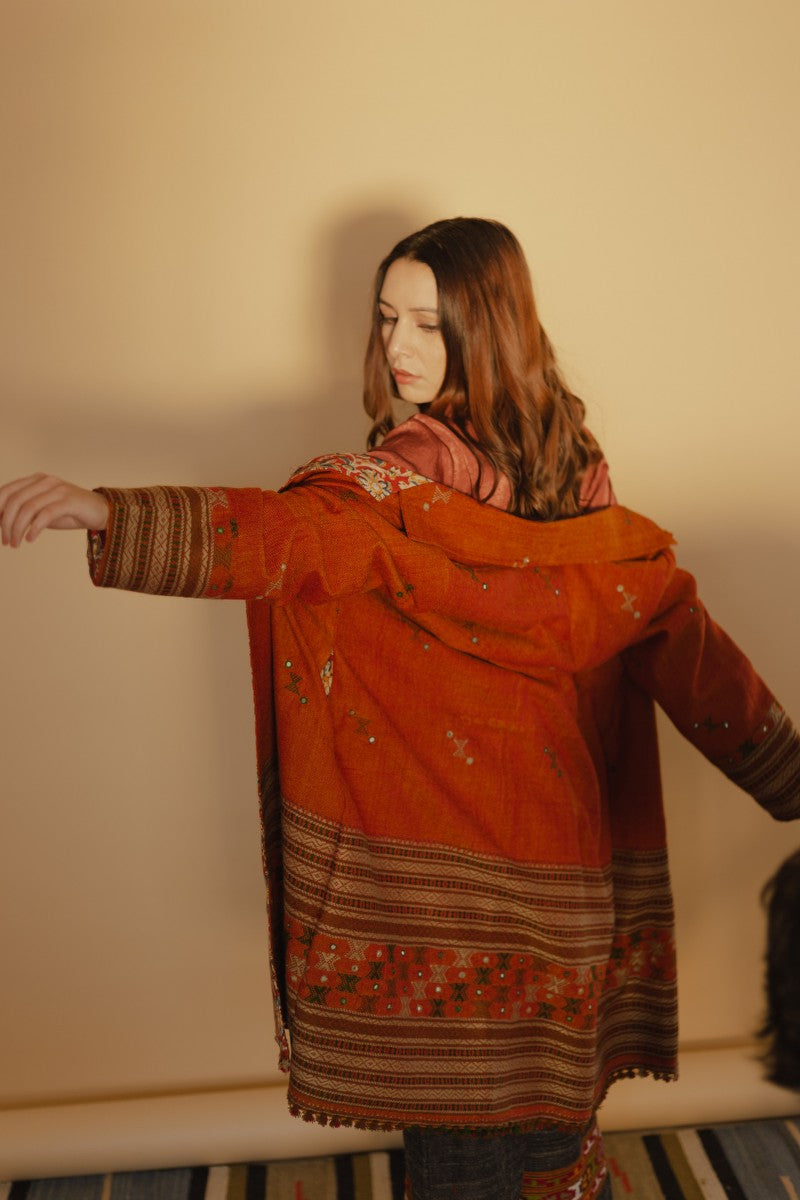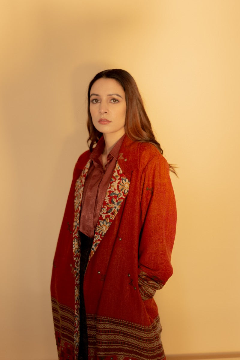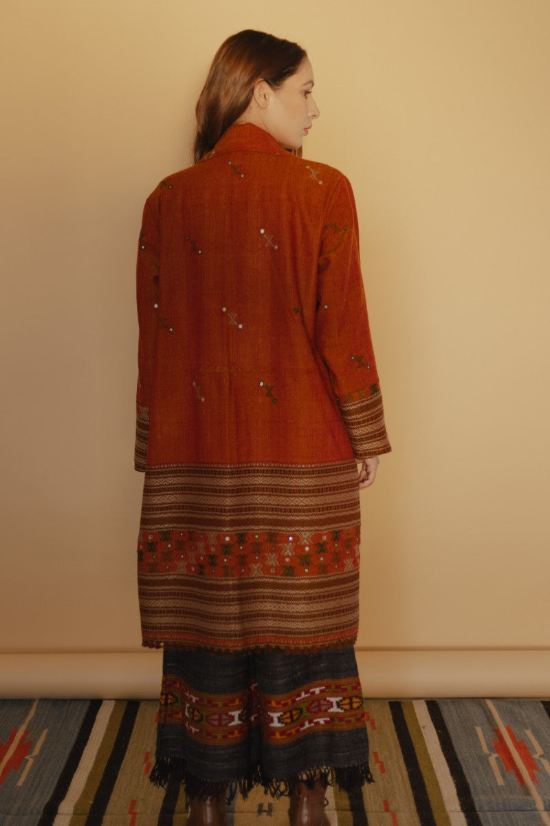 Swaroop Exclusive Design. “BEN Jacket” is a marriage between Indian textile and modern silhouette. The fabric of the jacket is handcrafted by weavers of Bhujodi, Gujarat using traditional techniques passed down from generation to generation. Its front & back panel is embellished with mirror work and the design is elevated by block printed kalamkari lining in organic cotton base.