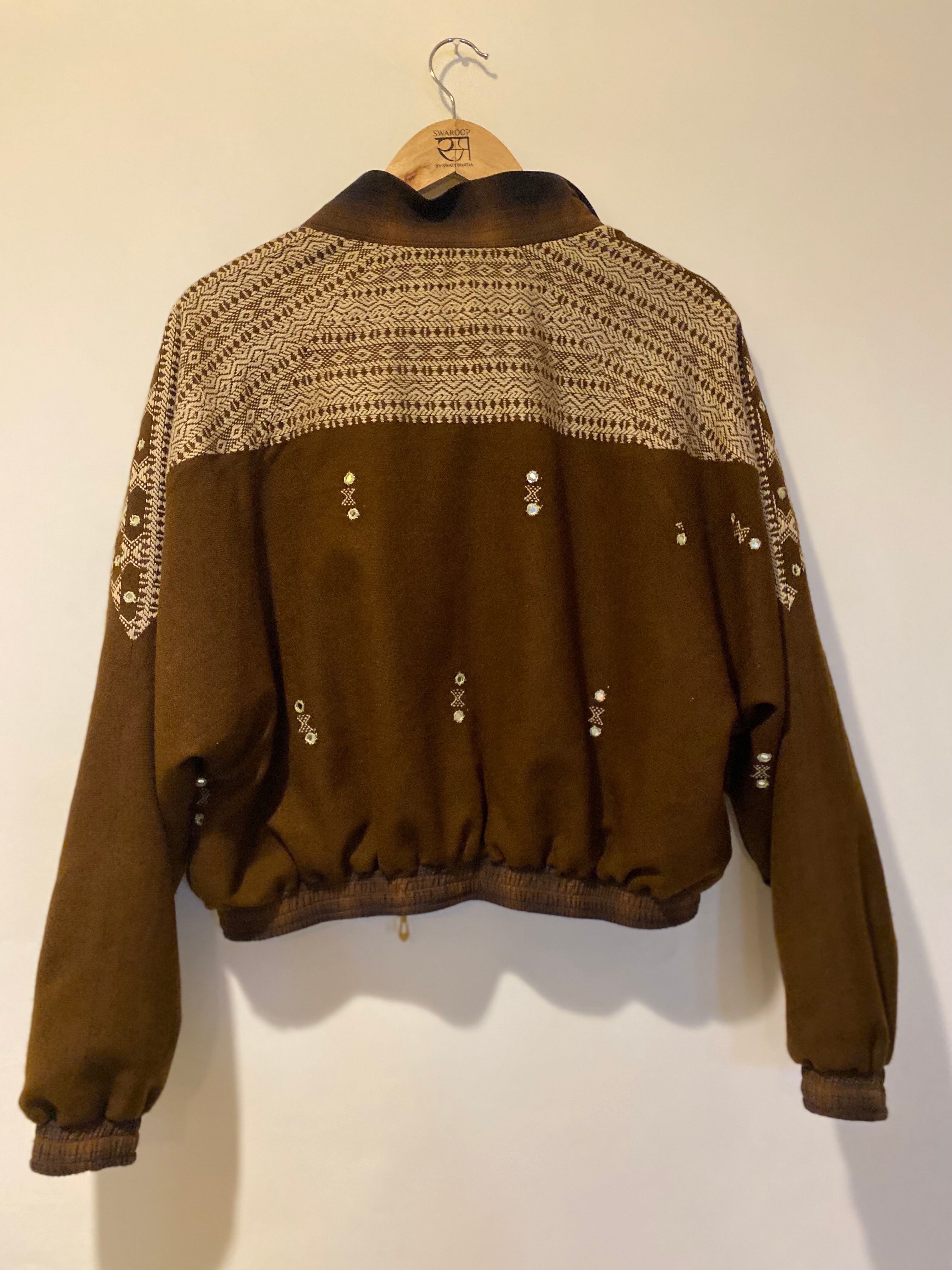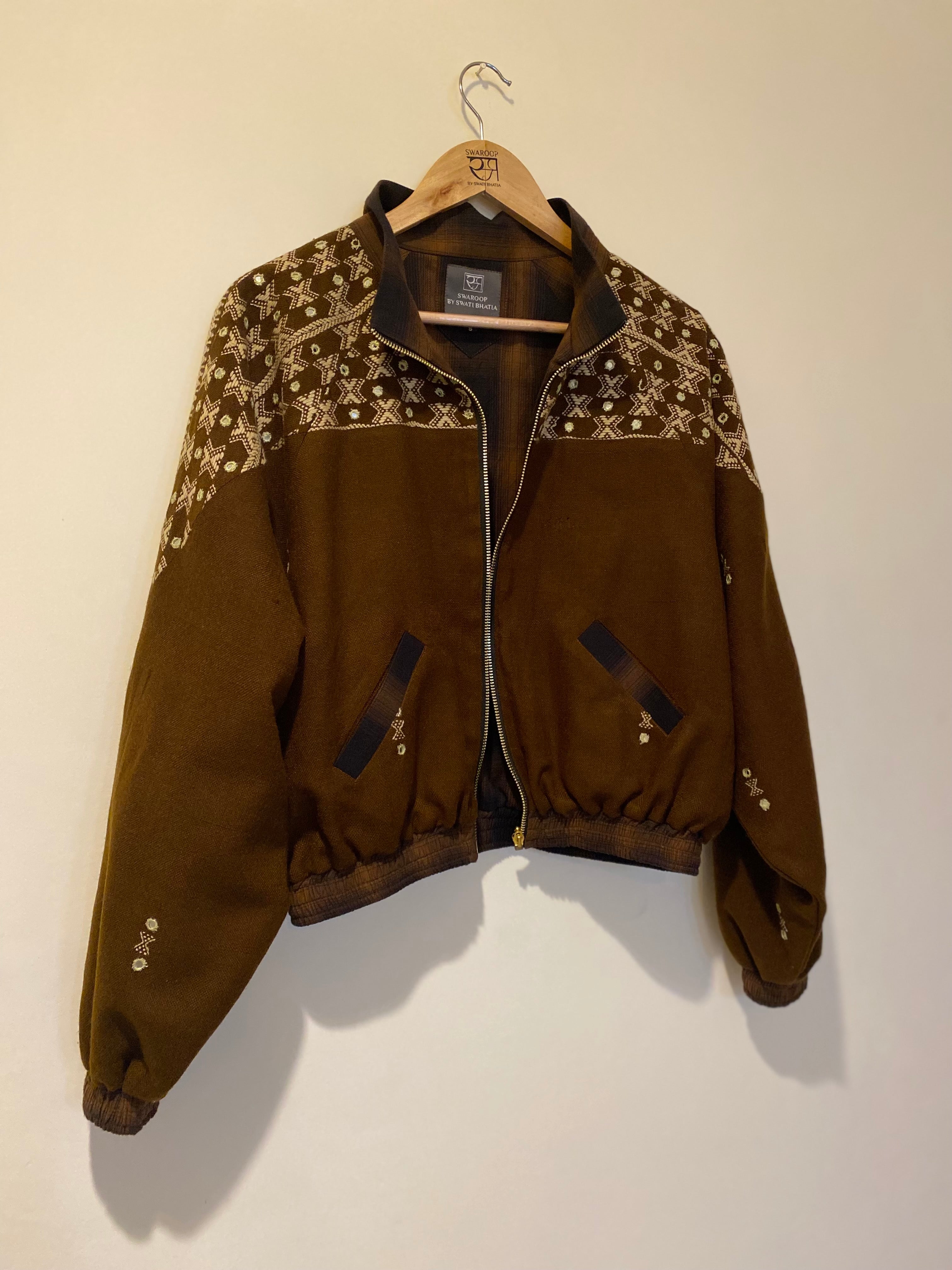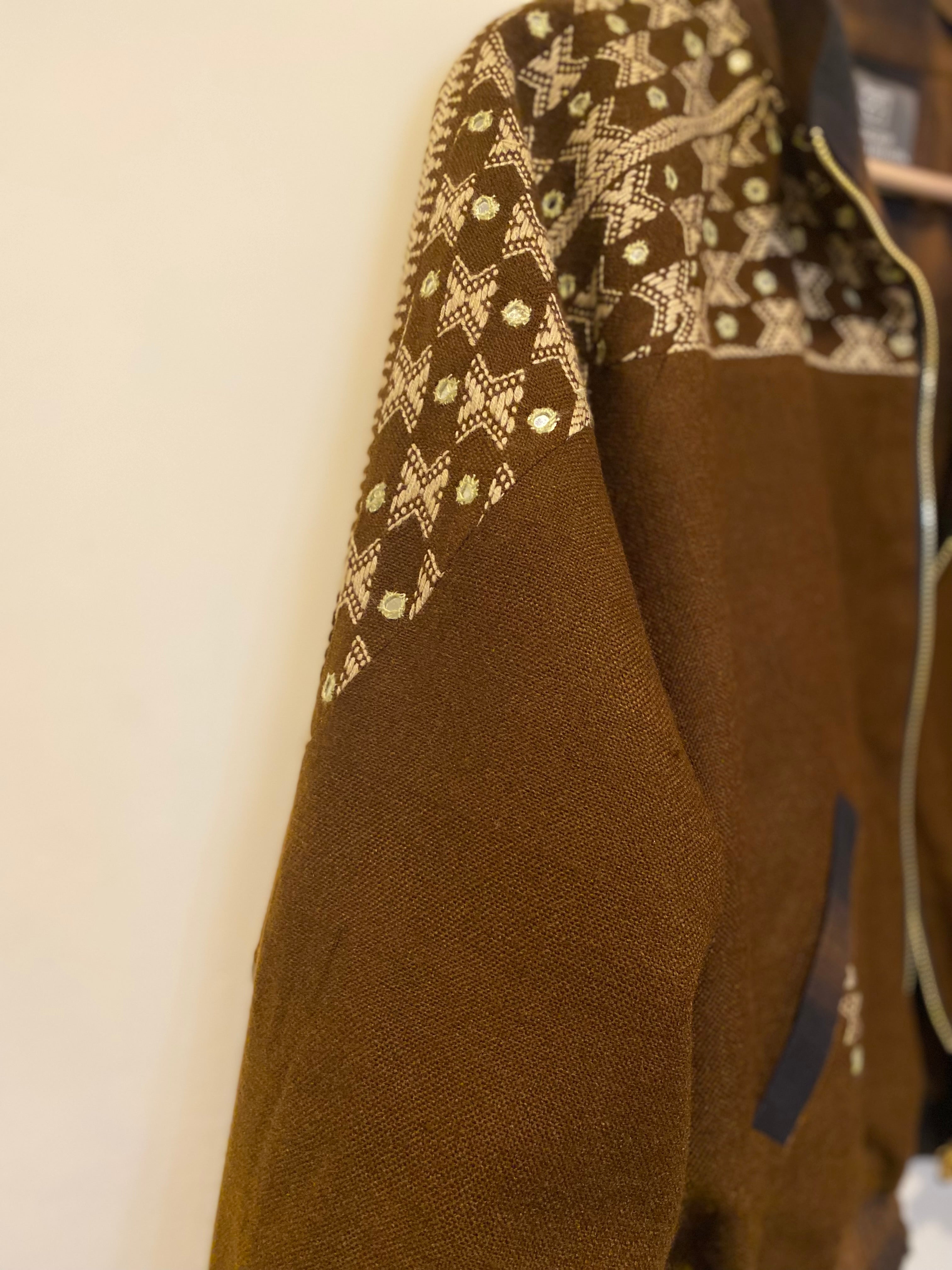Swaroop Exclusive Design. “The Dusty Brown Jacket” is a marriage between Indian textile and modern silhouette. The fabric of the jacket is handcrafted by weavers of Bhujodi, Gujarat using traditional techniques passed down from generation to generation. Its front panel is embellished with mirror work and the design is elevated by check lining in organic cotton base.