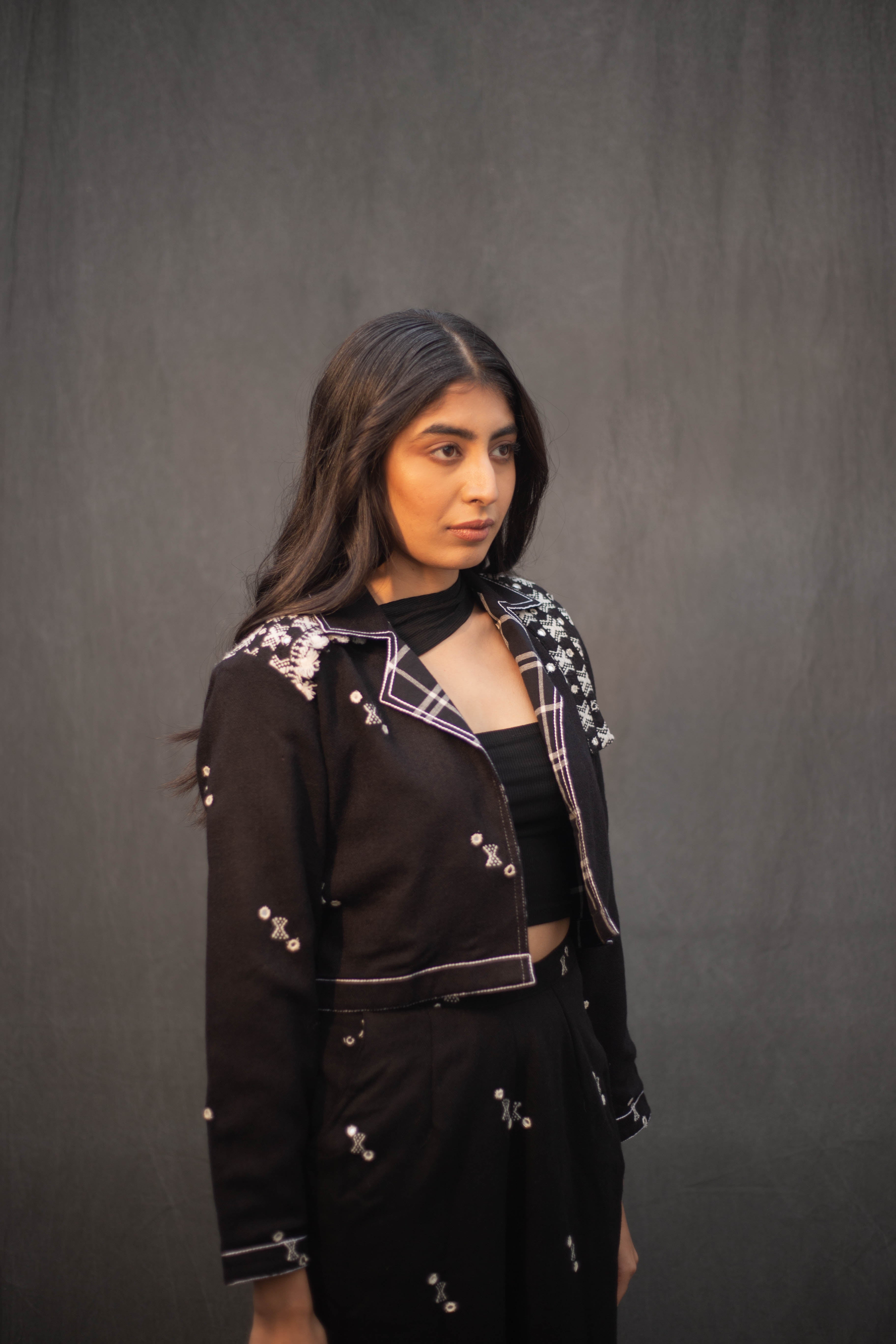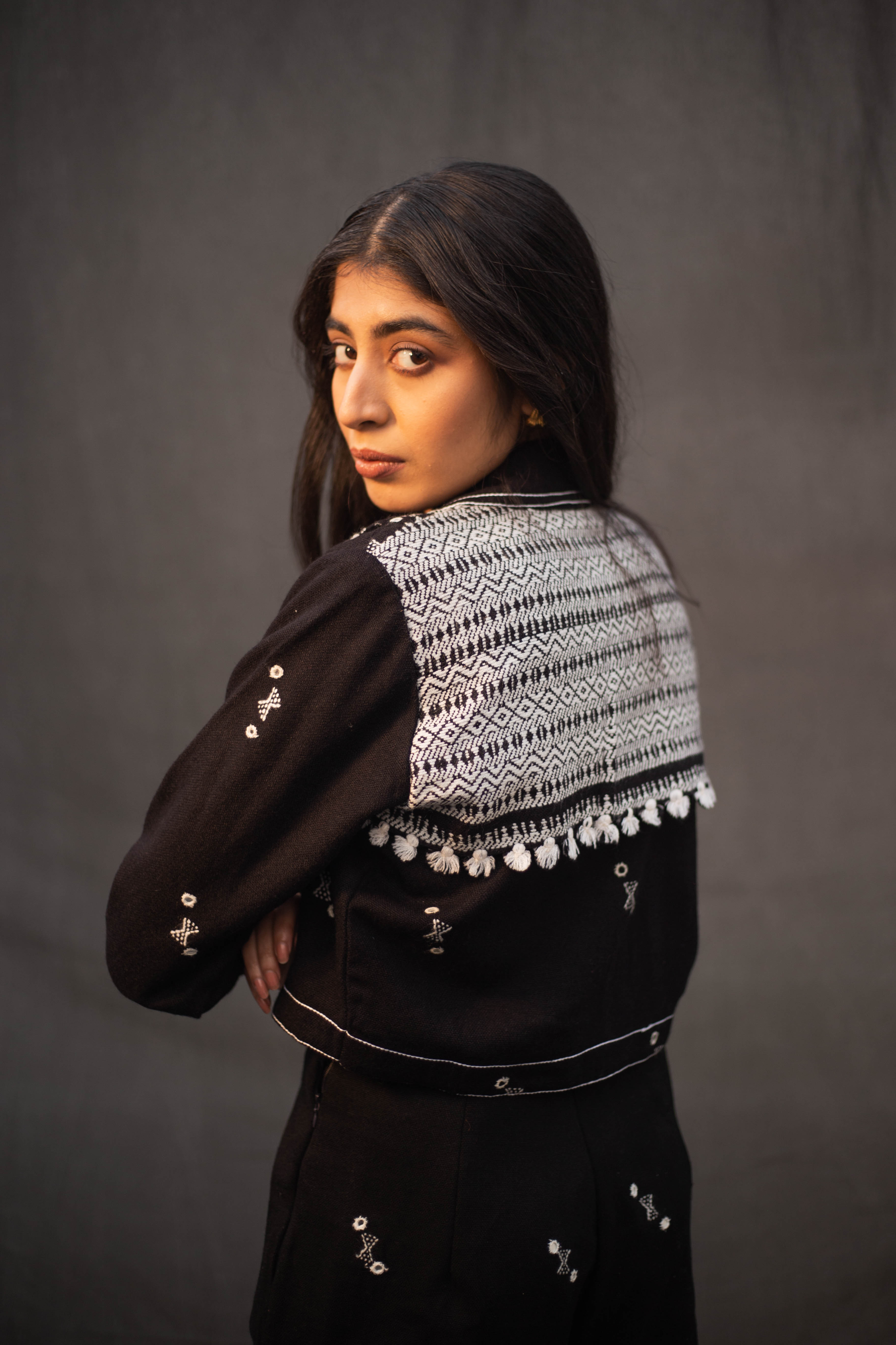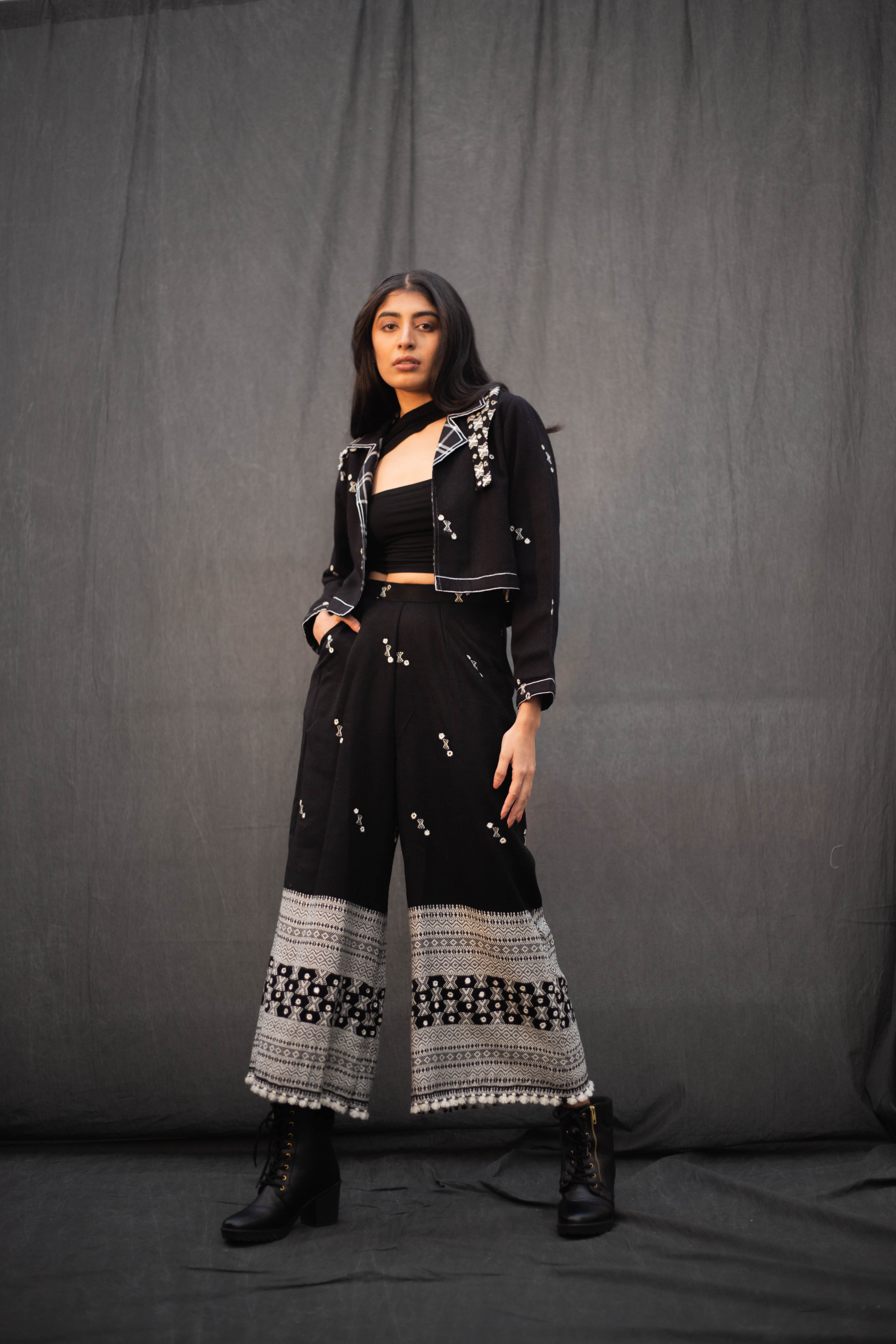 Swaroop Exclusive Designs. “The Majama Co-ord Set” is a marriage between Indian textile and modern silhouette. The fabric is handcrafted by the weavers of Bhujodi, Gujarat using traditional techniques passed down from generation to generation. The jacket is a crop jacket with its front panel embellished with mirror work. Paired with flared pant detailed with high waist side zipper for fastening.