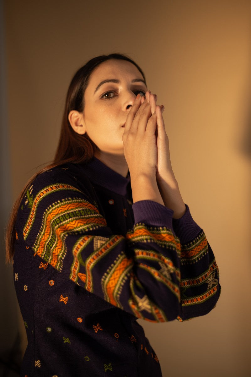 Swaroop Exclusive Design. “NELI SHESHA DRESS” is a marriage between Indian textile and modern silhouette. The fabric of the dress is handcrafted by weavers of Bhujodi, Gujarat using traditional techniques passed down from generation to generation. Its front & back panel is embellished with mirror work and the sleeve design is elevated by handwoven geometric motifs.
