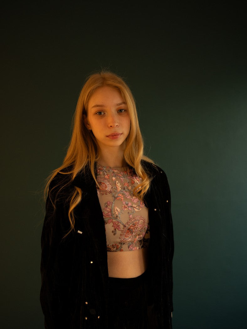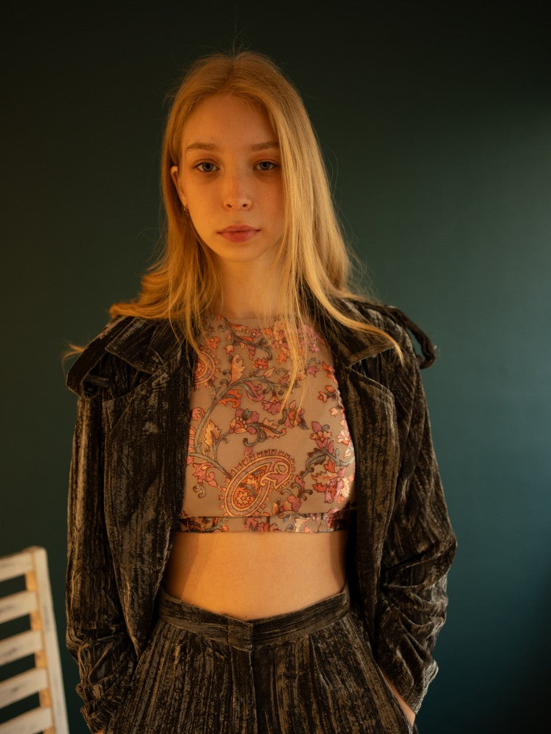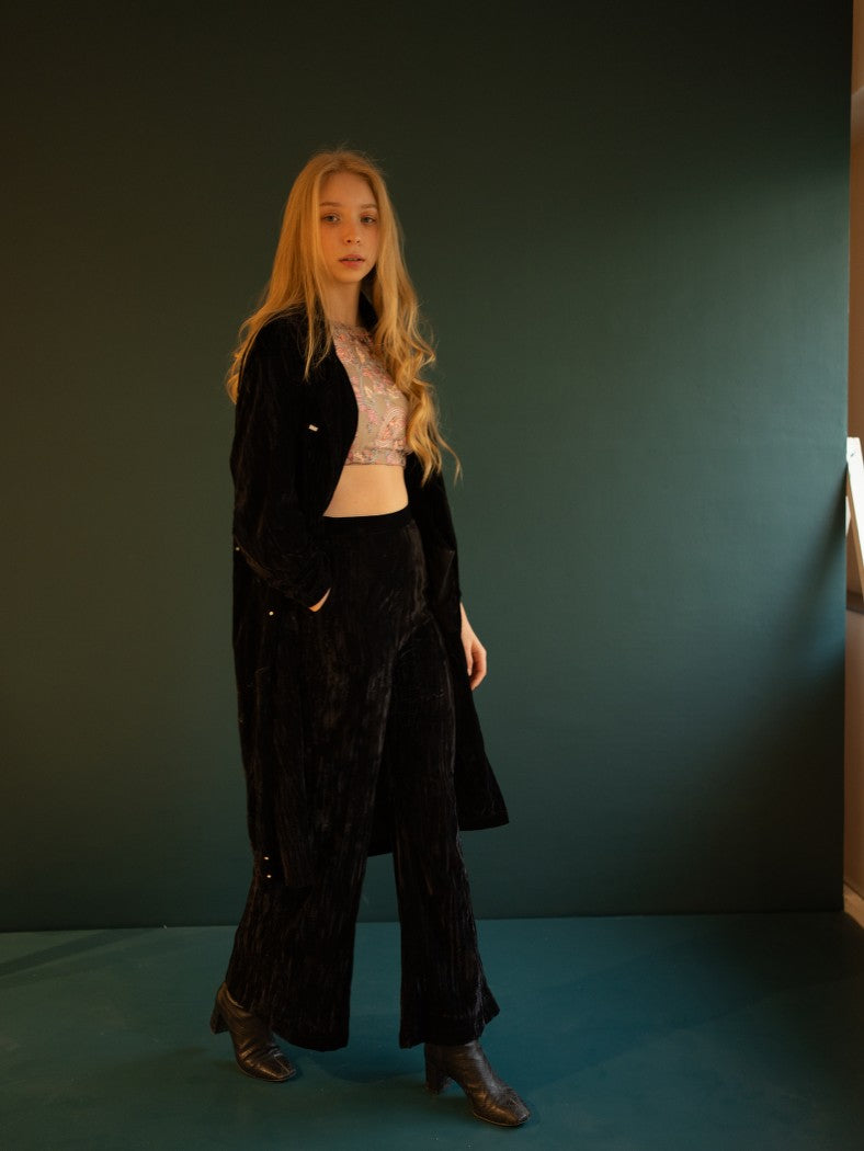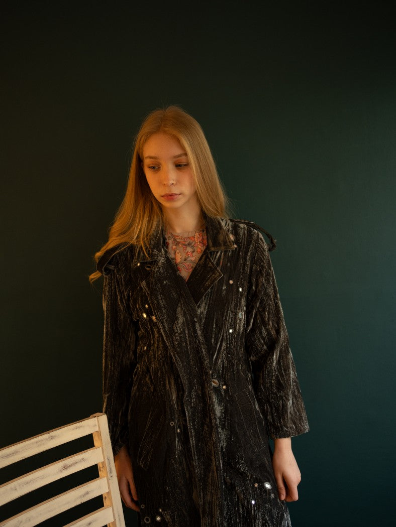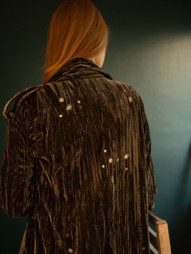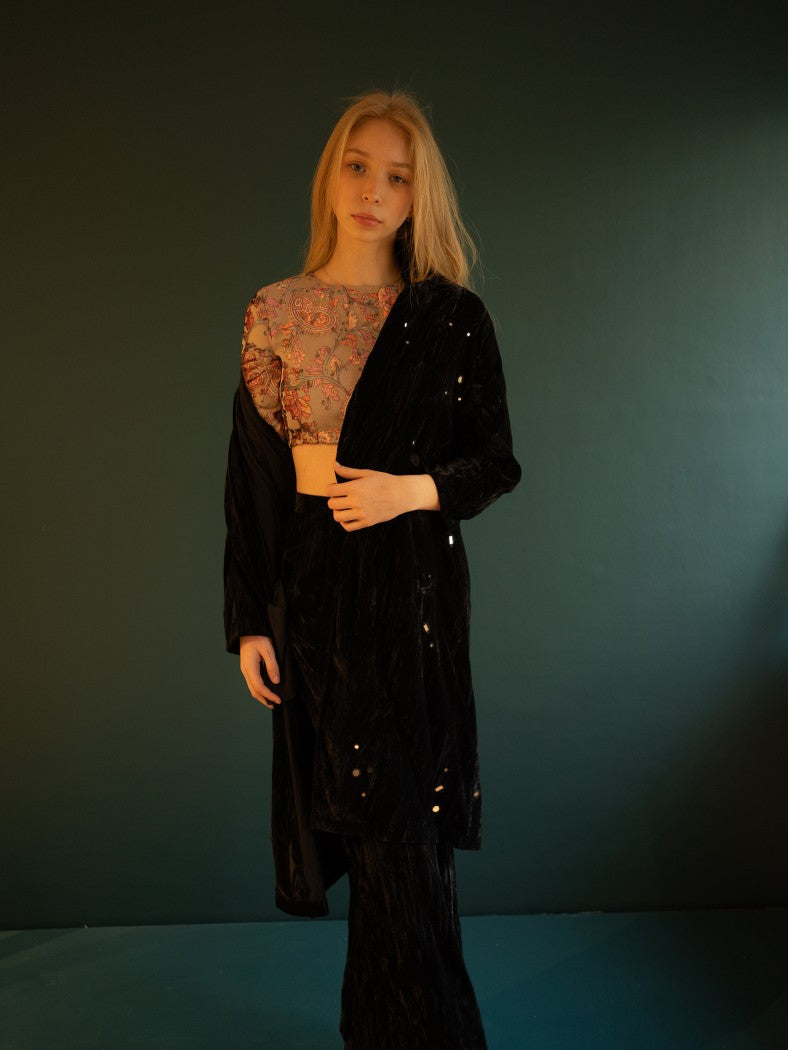 Swaroop Exclusive Design. Featuring "Velvet Trench Coat" embellished with mirror work hand-embroidery all over by our in-house karigar. Comes with velvet belt.