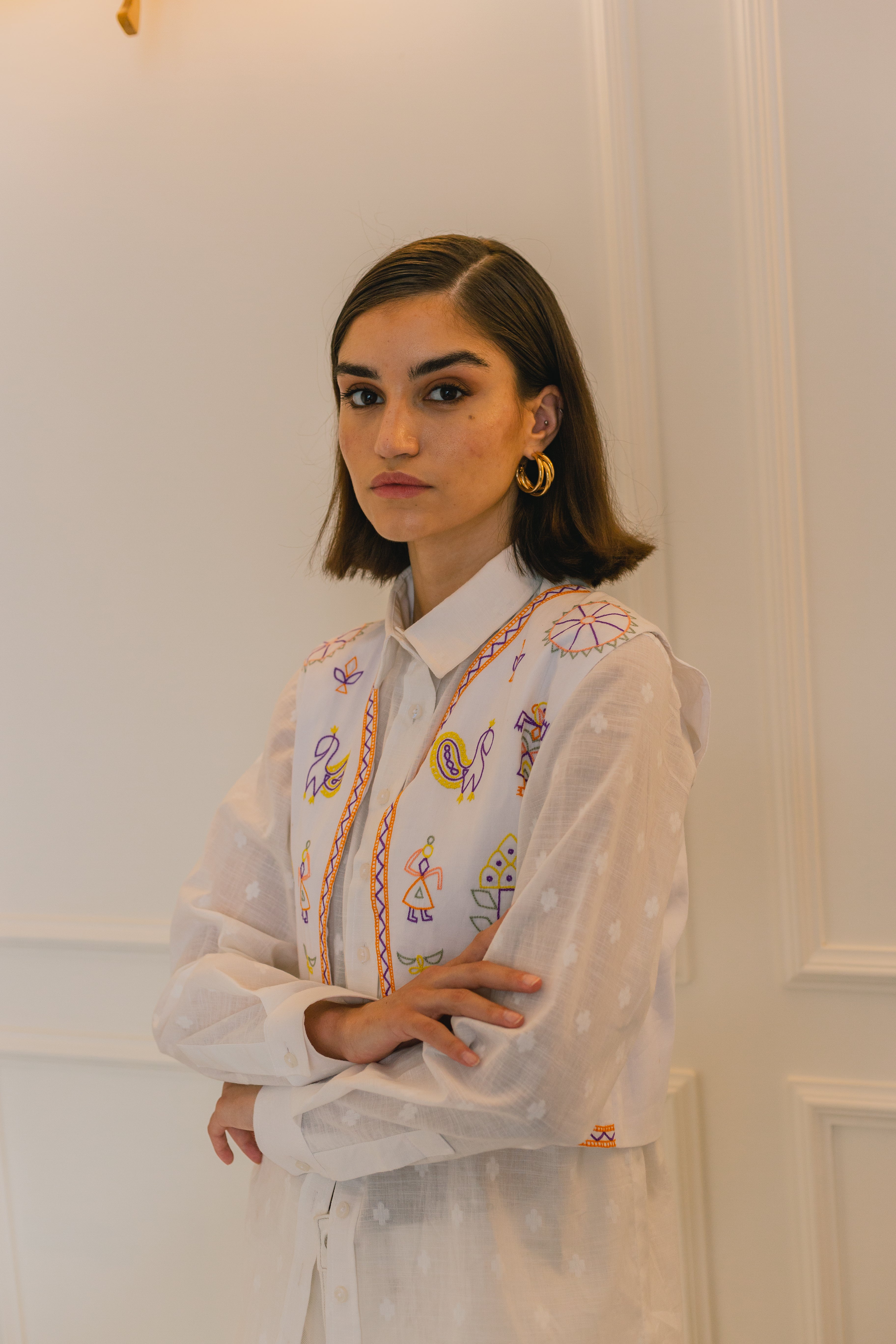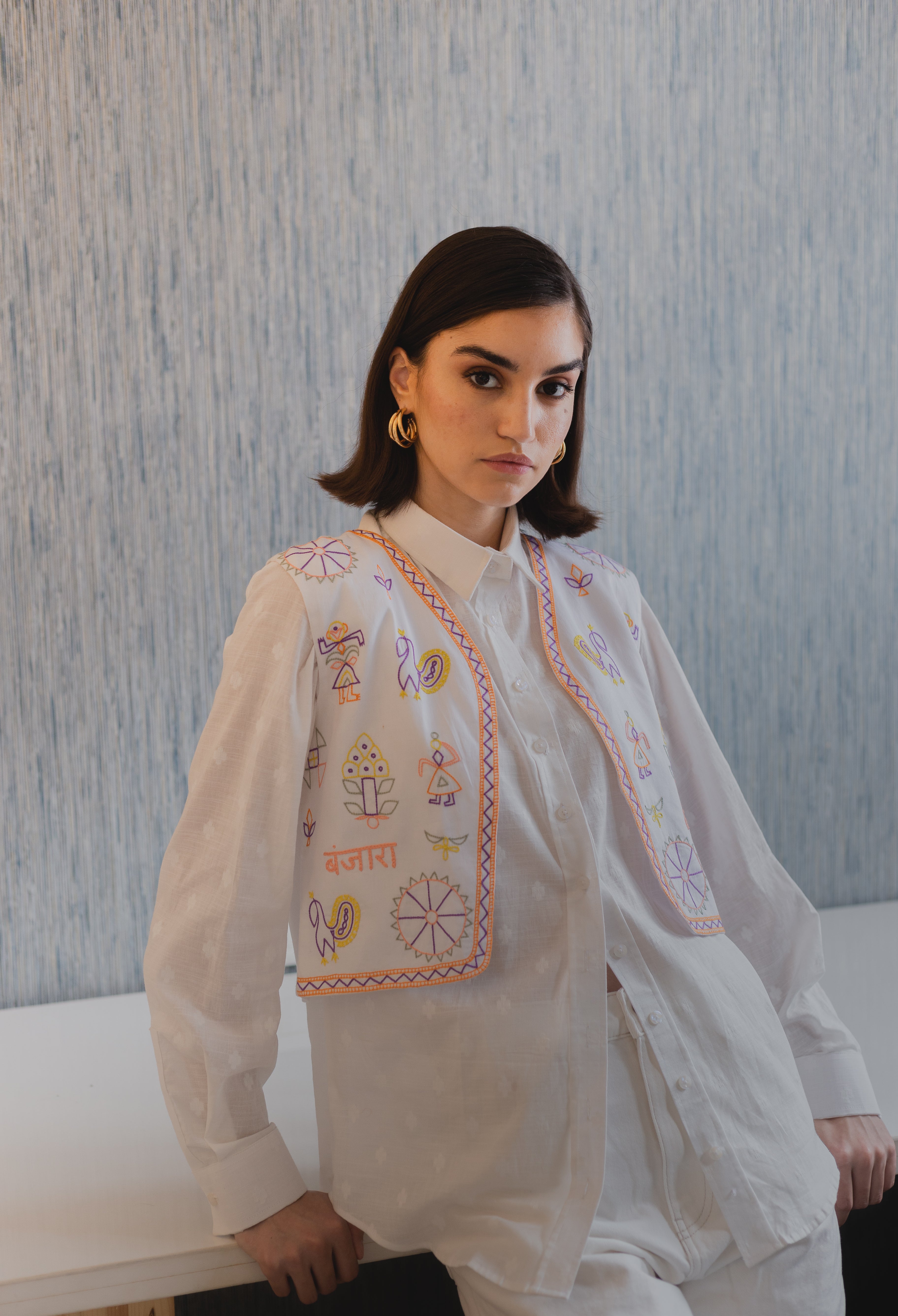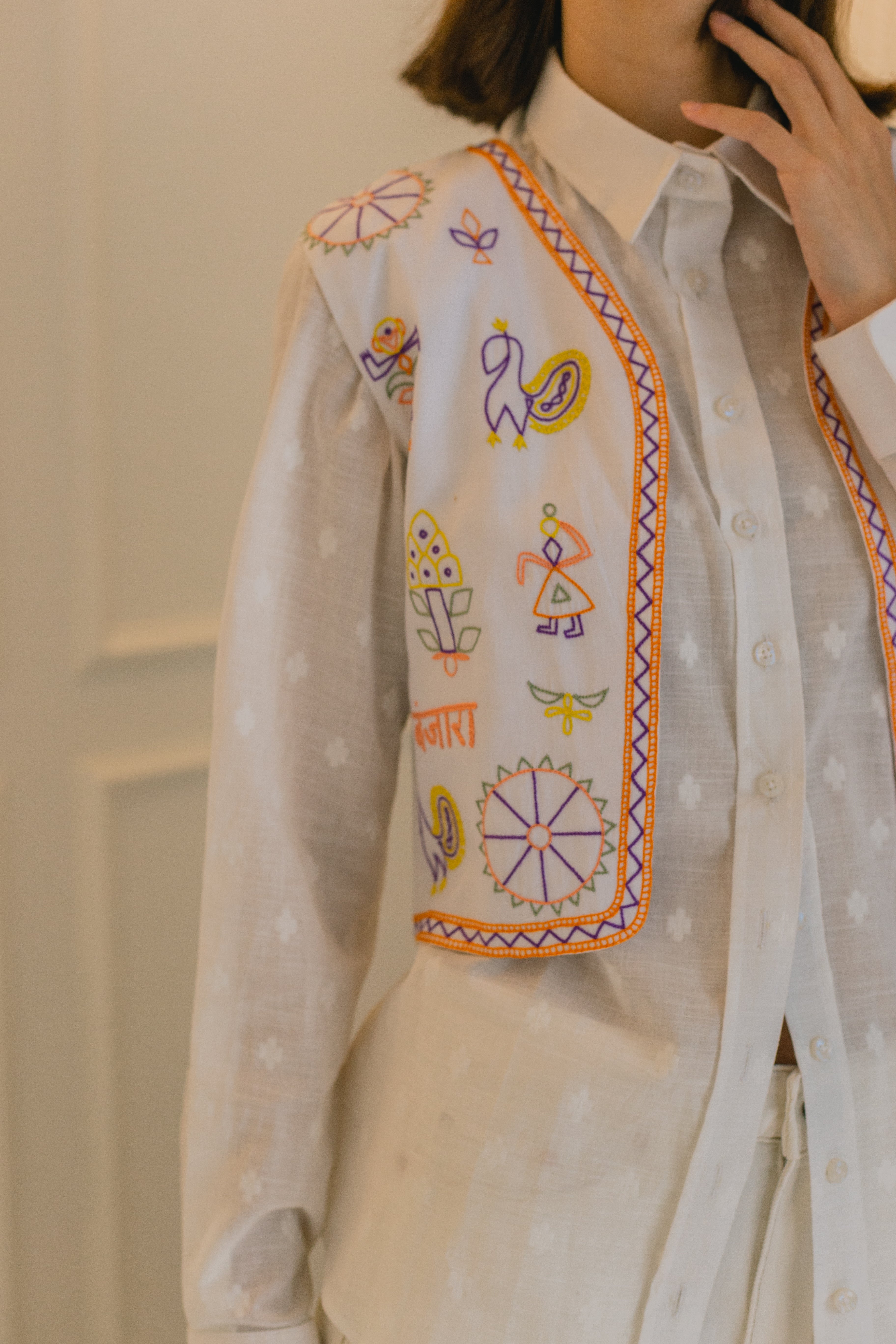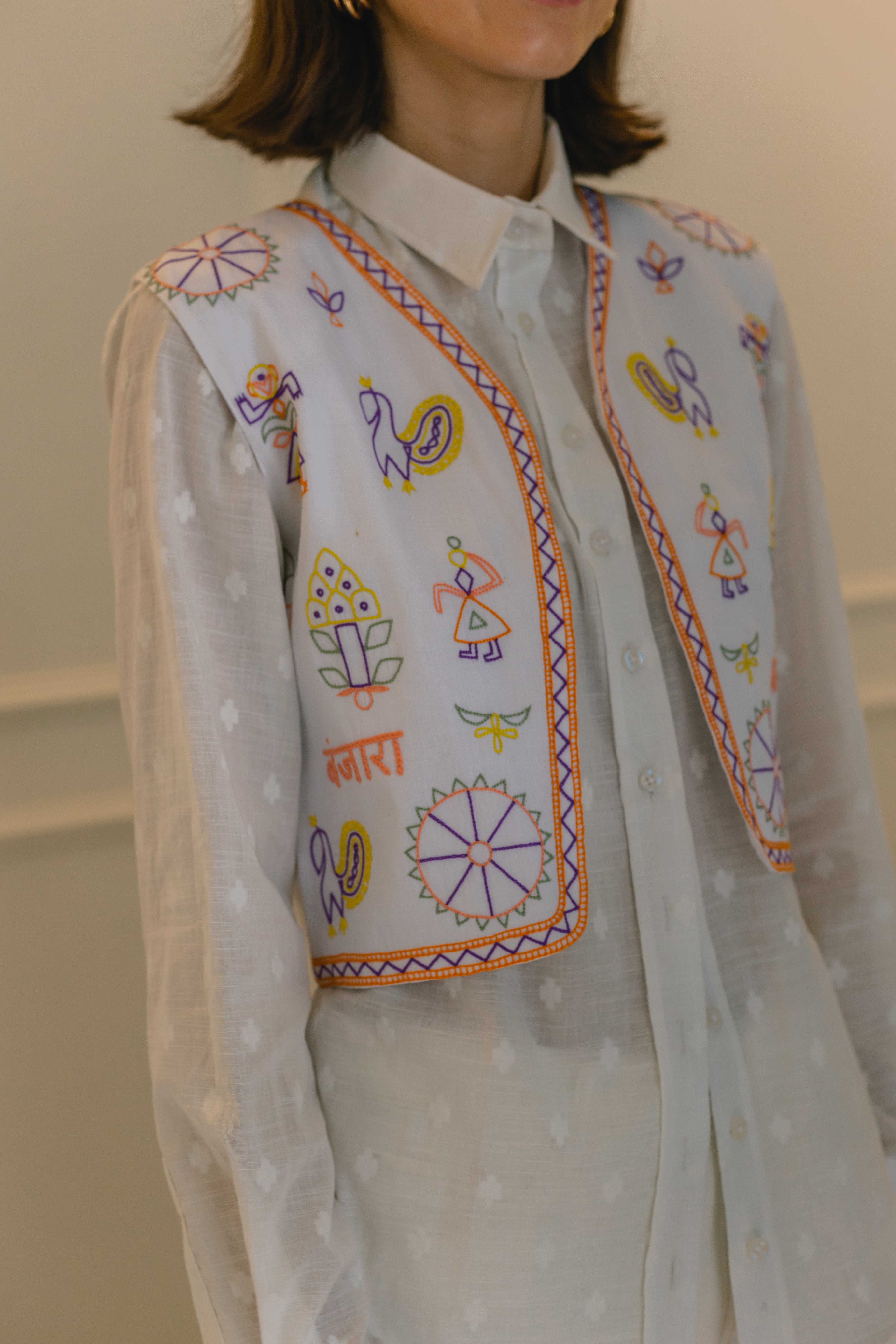 Swaroop Exclusive Design. This Festive season flaunt this "Banjara Jacket" with hand embroidered mirror - work inspired from Kutch, Gujarat. Pair this Jacket with a classic white kurta for an Indie look or with a plain white shirt for casual outings.