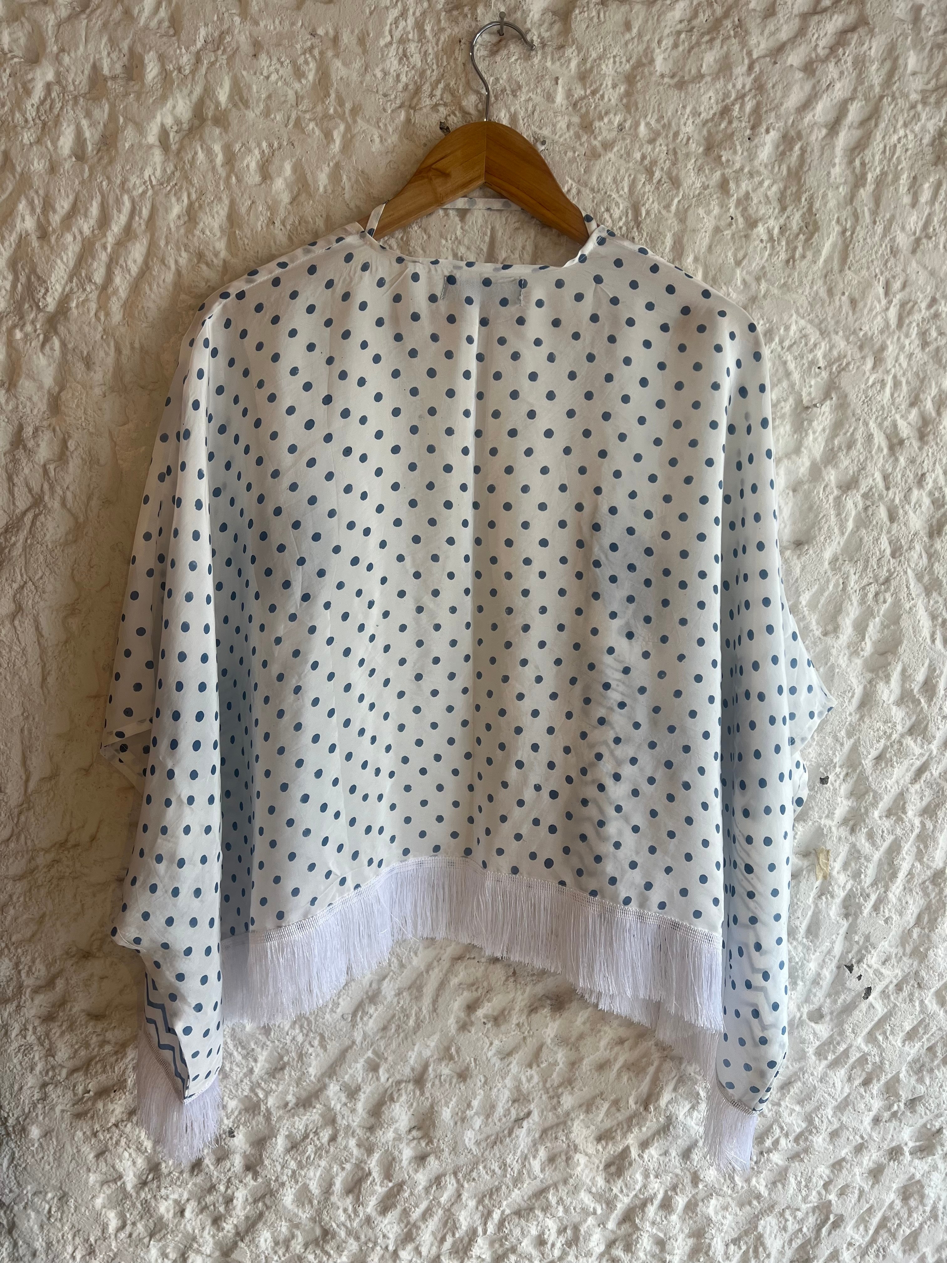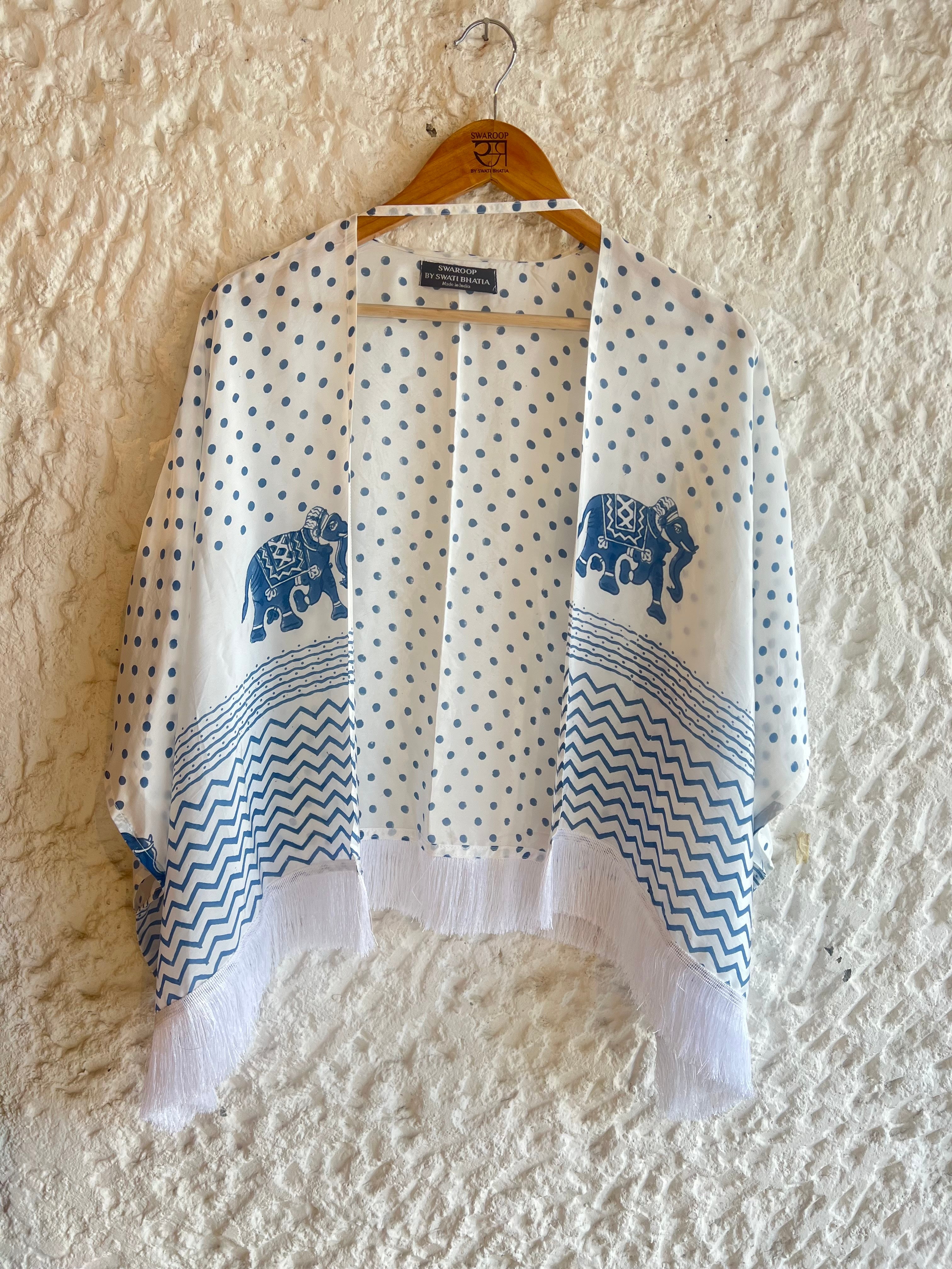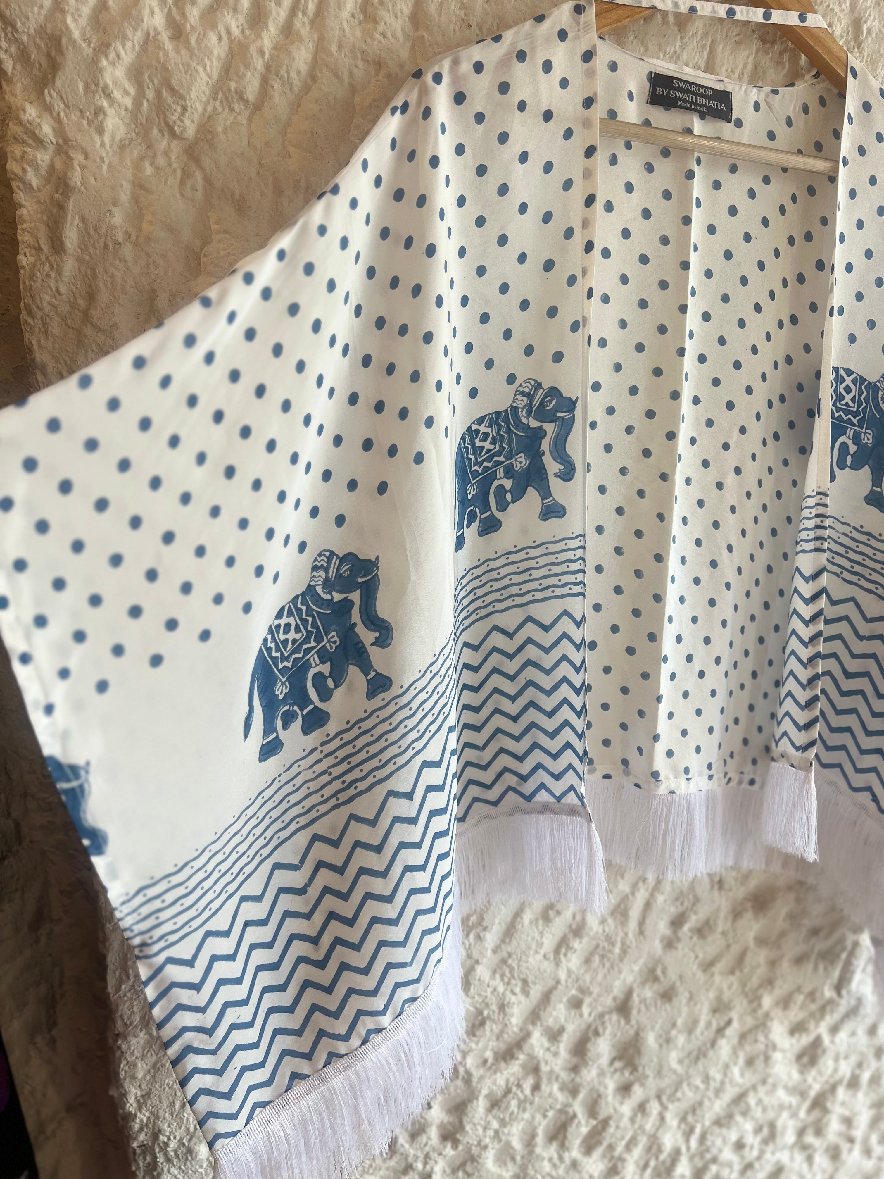 Swaroop Exclusive design. Hathi Cape is a fusion between Indian craft and modern silhouettes. The cape is elevated with hand-block printing. Enhanced with tassel detailing at the hemline. Its easy fit makes you feel comfortable.