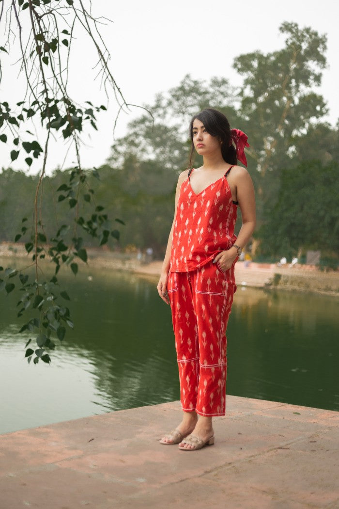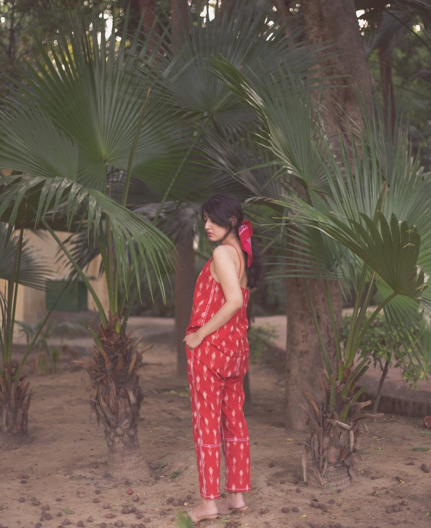 Swaroop Exclusive Design. The Ikat Pant is a mom’s fit pants in cotton handloom Ikat. The fabric is woven by the weavers of Andhra Pradesh and keeps you cool in summers. The pants have elasticated waist with intricate chain stitch and side pockets.