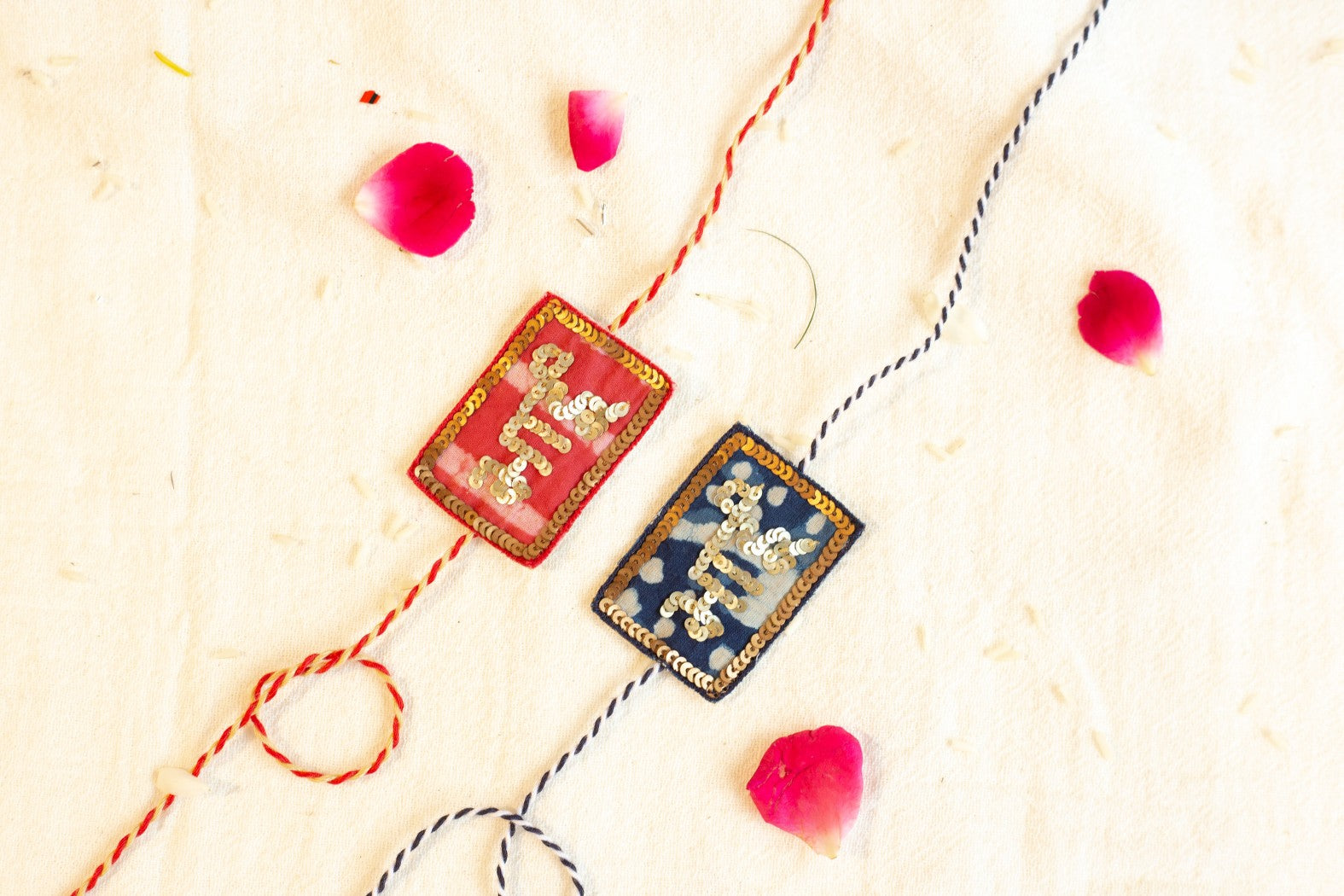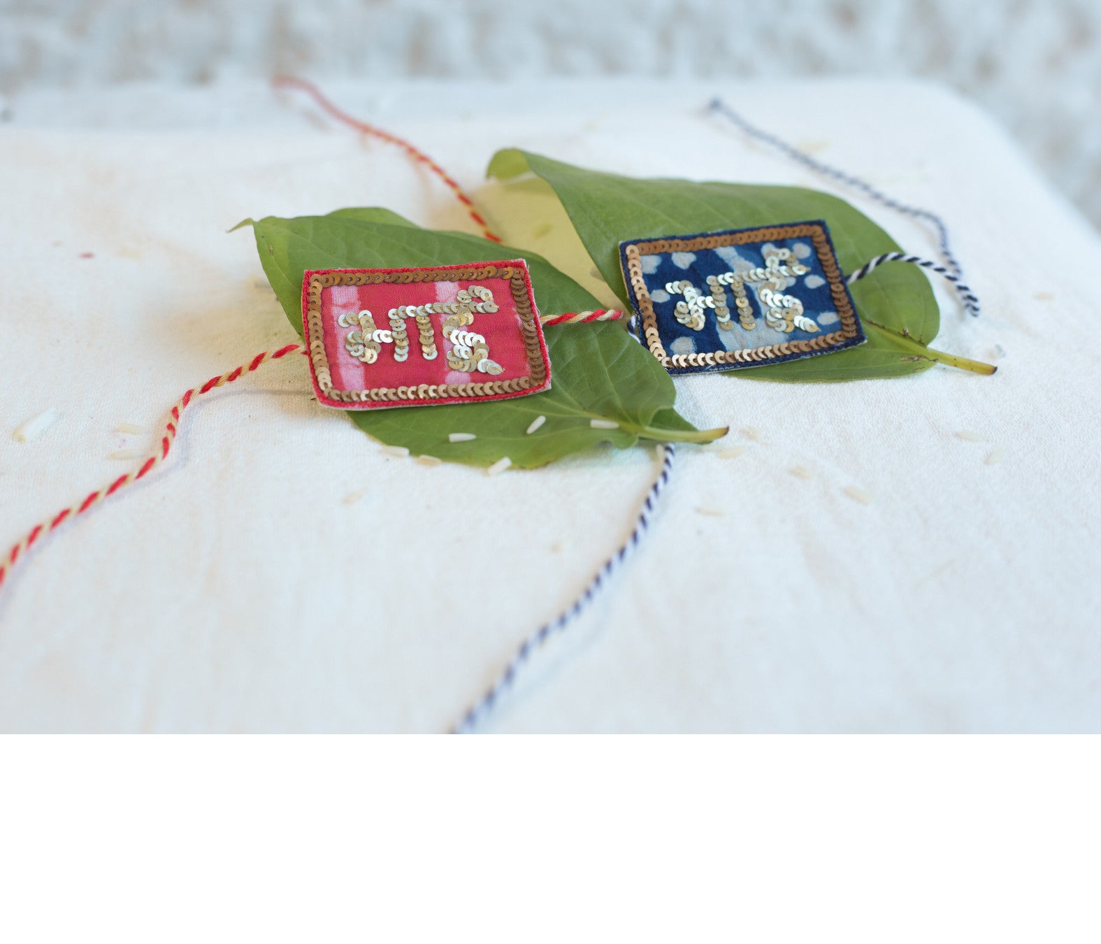 This Bhai rakhi is in Indigo base enhanced by sequence embroidery.