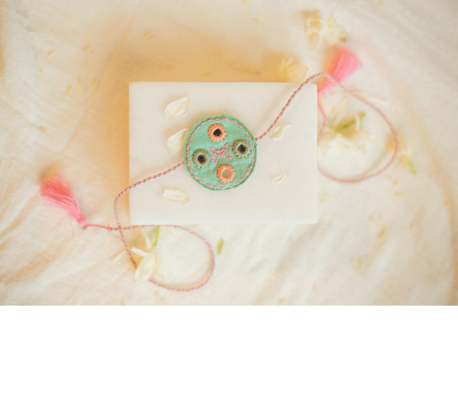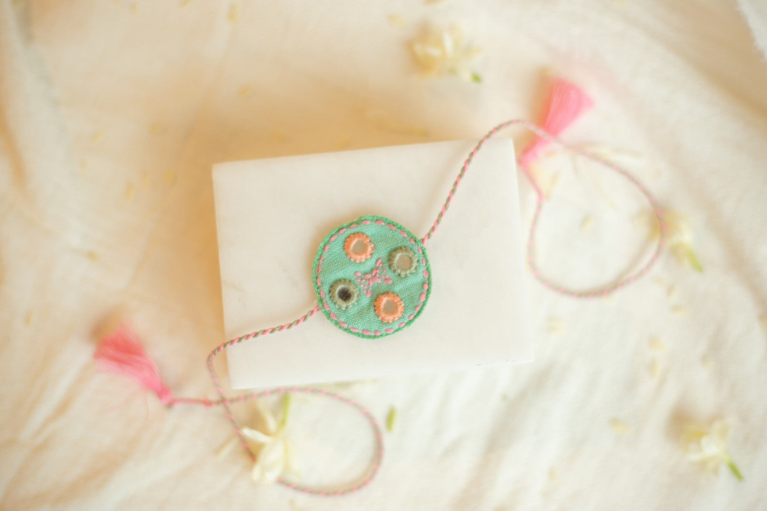 SWAROOP Exclusive Design.This Rakhi is inspired by mirror work of Kutch embroidery and handcrafted by skilled artisans.