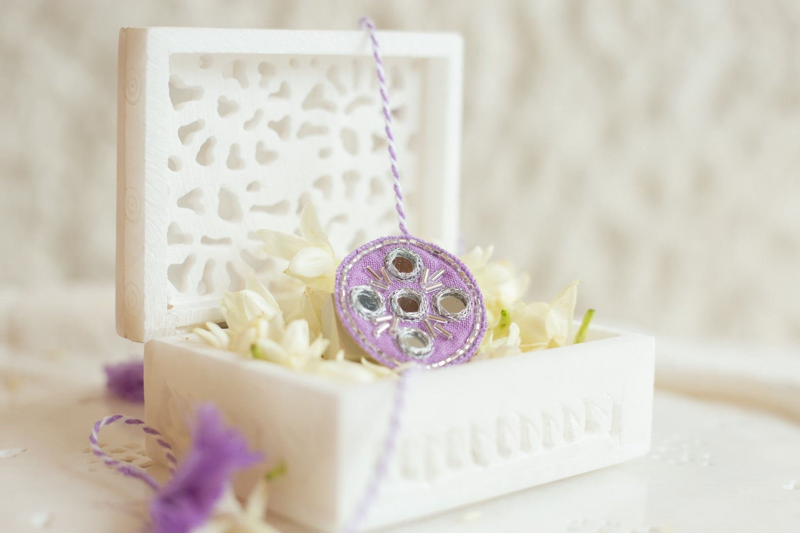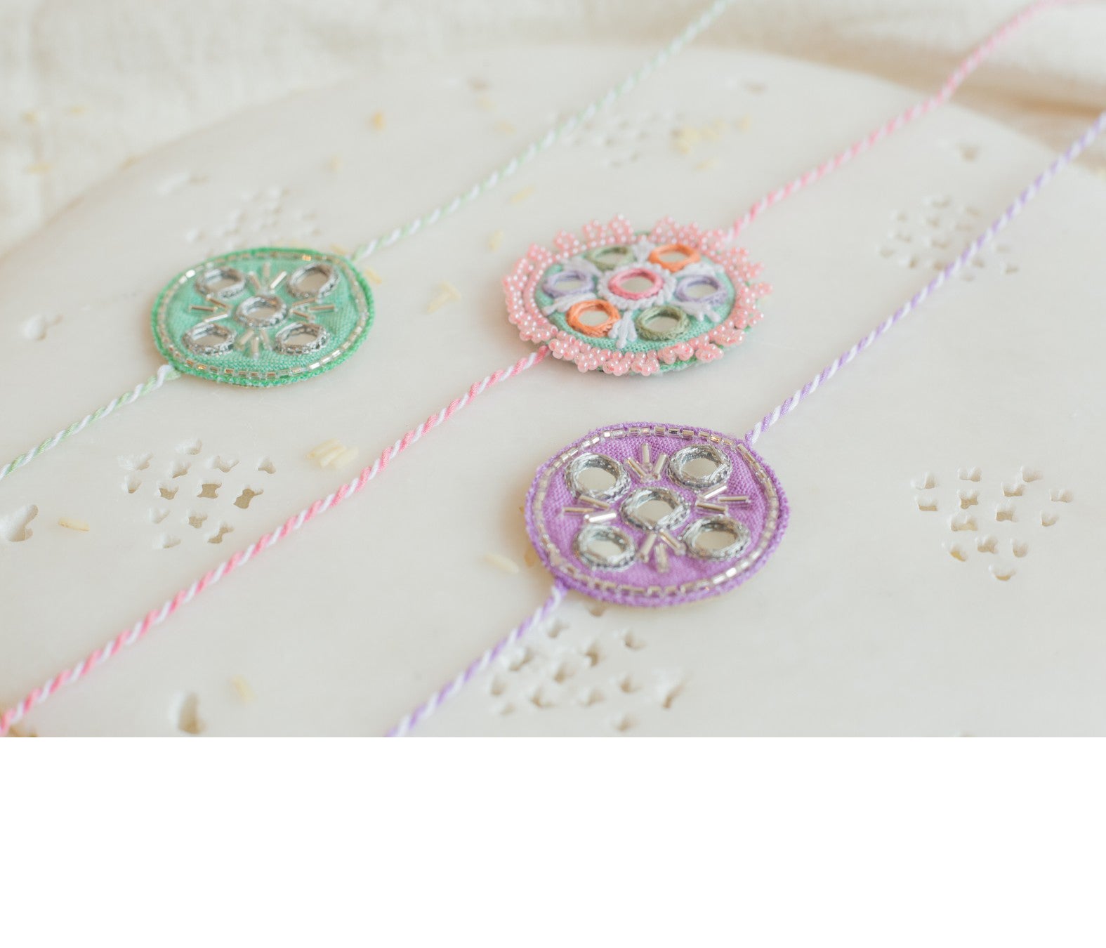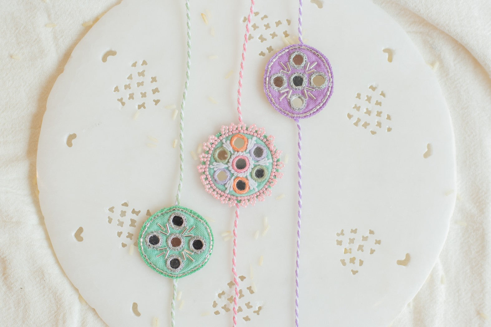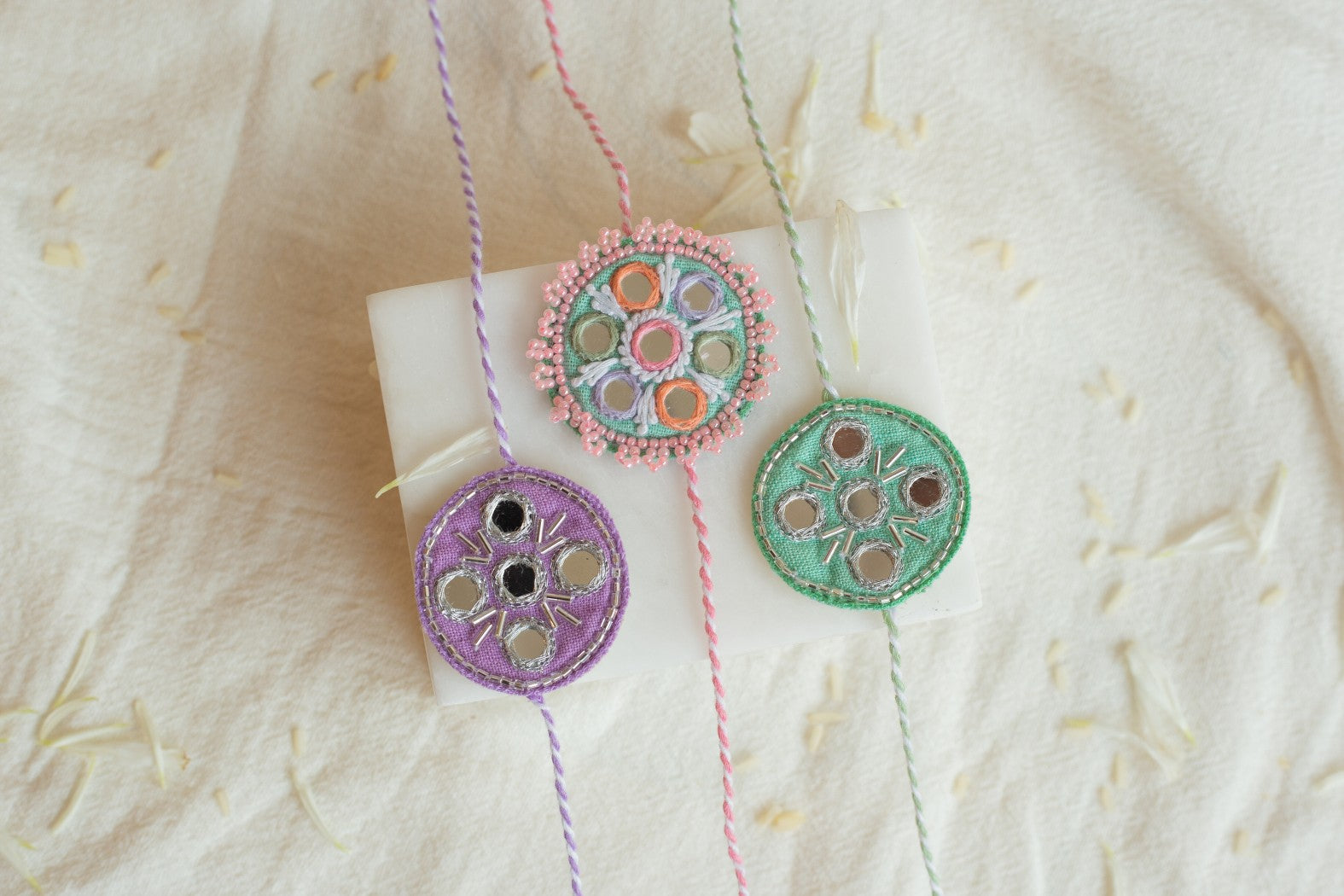 SWAROOP Exclusive Design.This Rakhi is inspired by mirror work of Kutch embroidery and handcrafted by skilled artisans. The set has 3 different mirror work Rakhi.