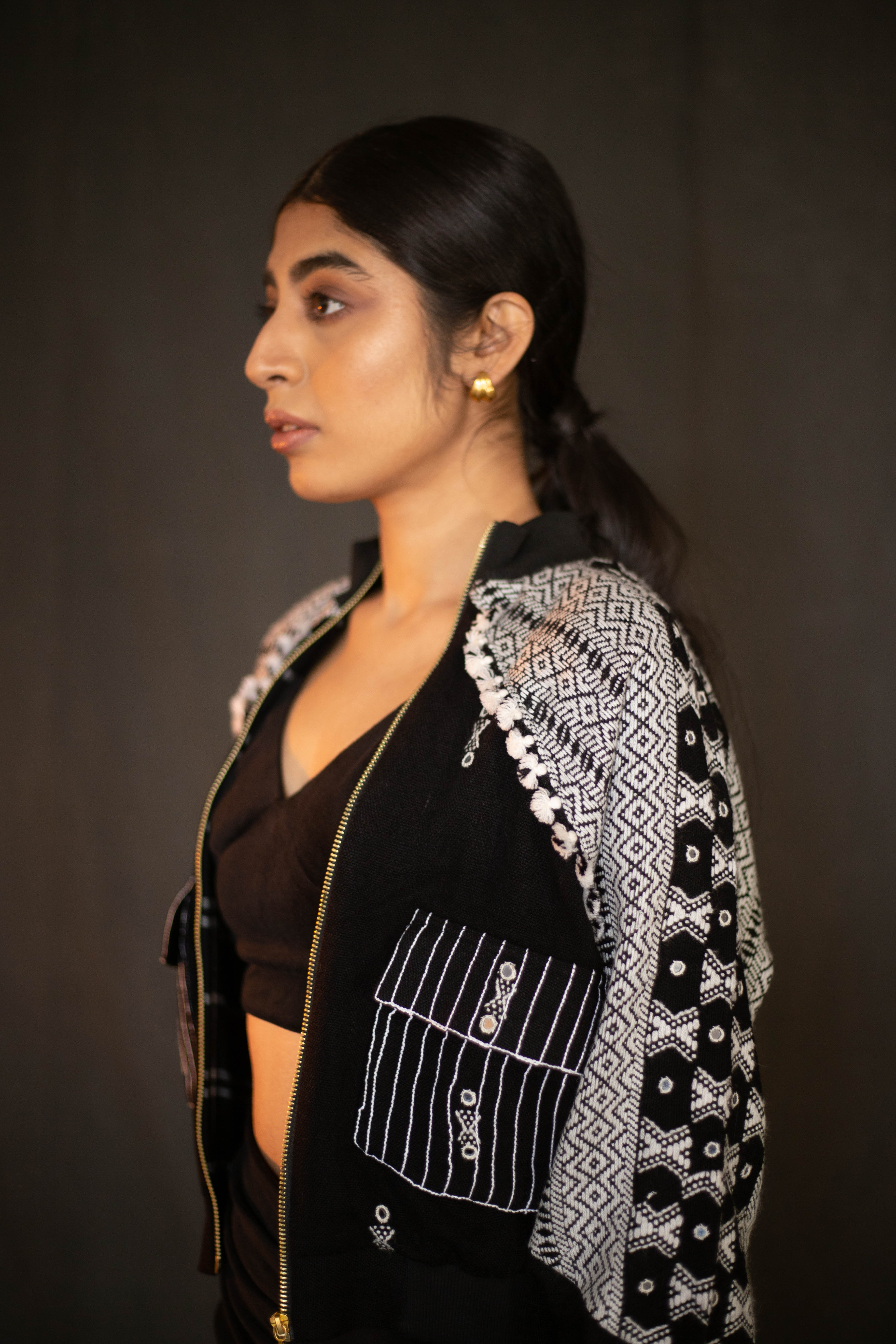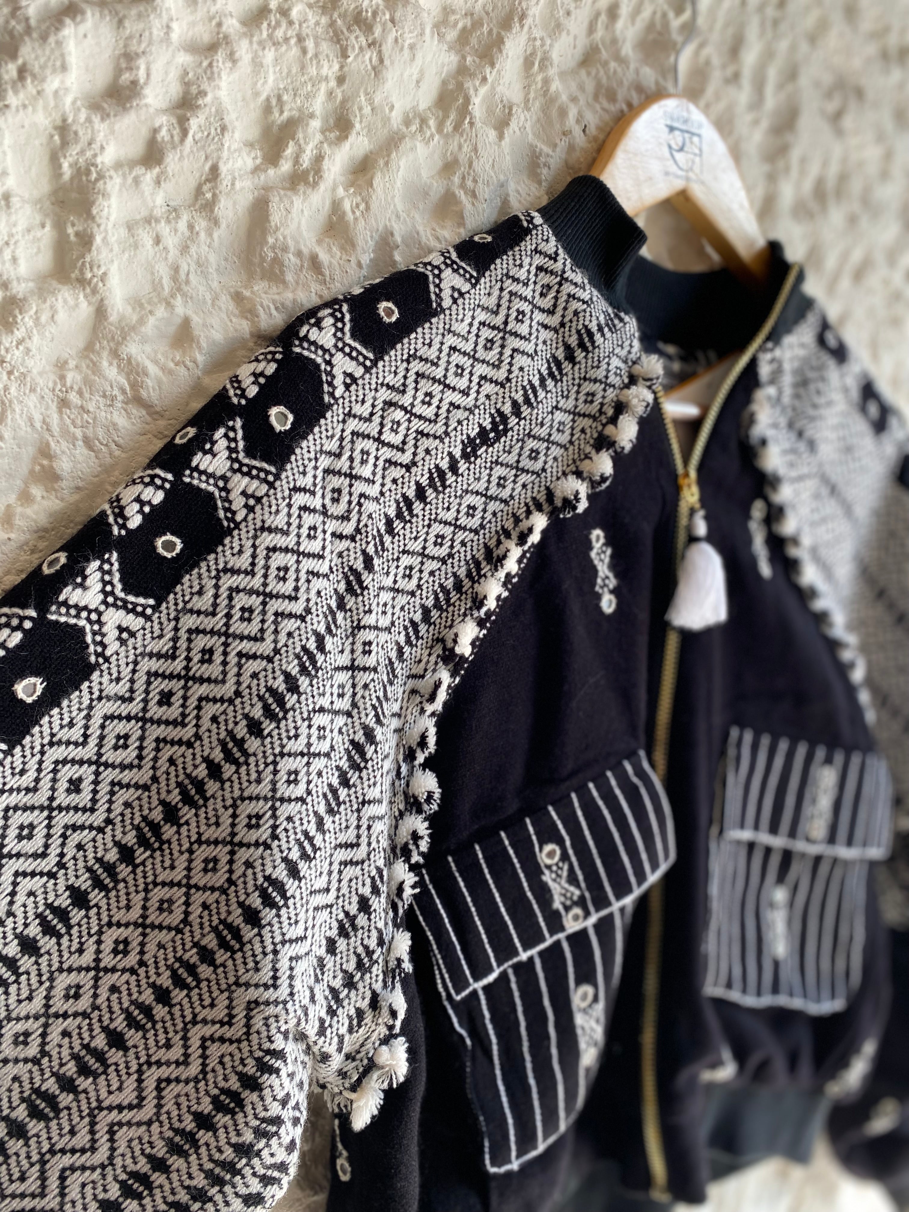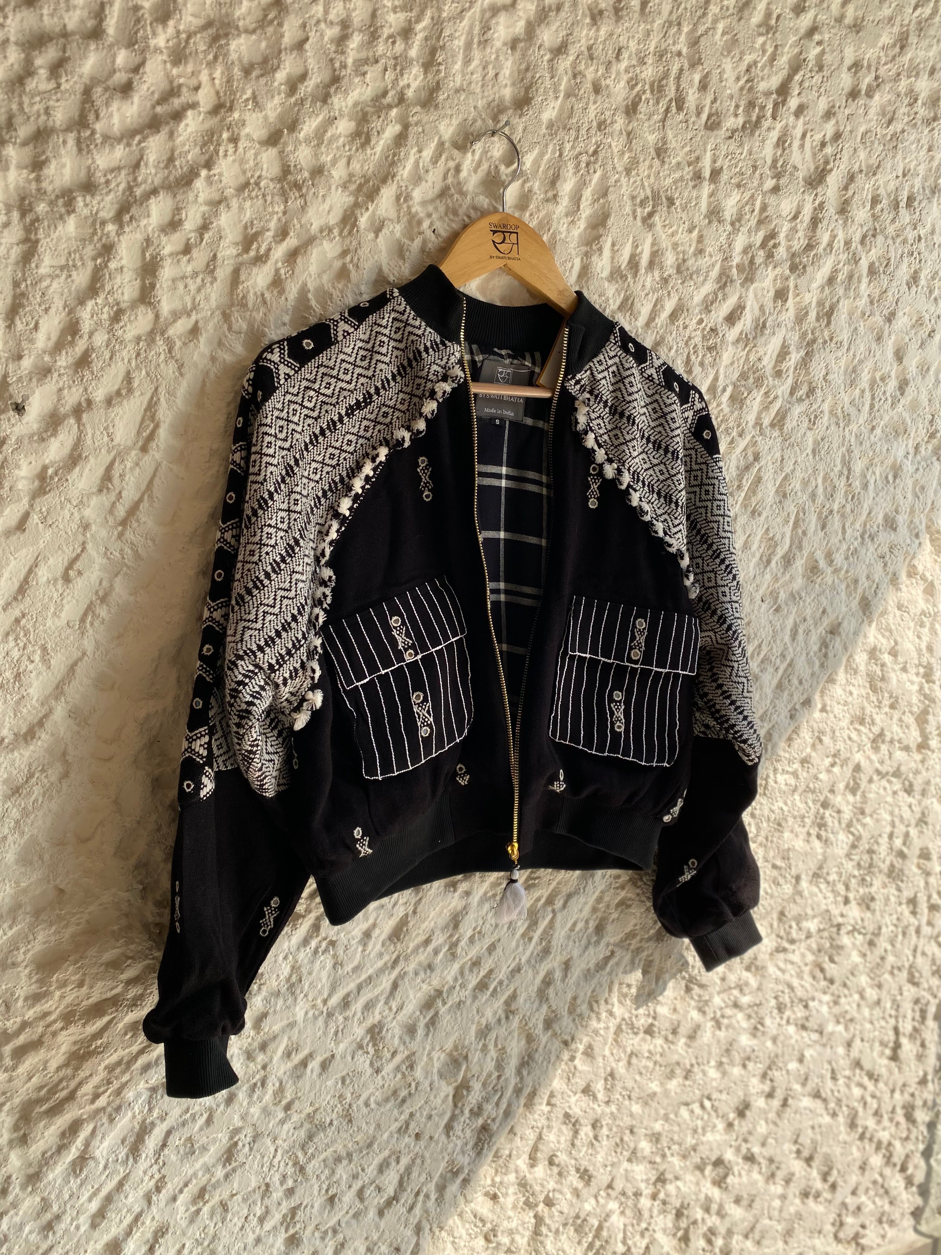 Swaroop Exclusive Design. “The Kutchii Jacket” is a marriage between Indian textile and modern silhouette. The fabric of the jacket is handcrafted by weavers of Bhujodi, Gujarat using traditional techniques passed down from generation to generation. Its front panel is embellished with mirror work and the design is elevated by check lining in organic cotton base.