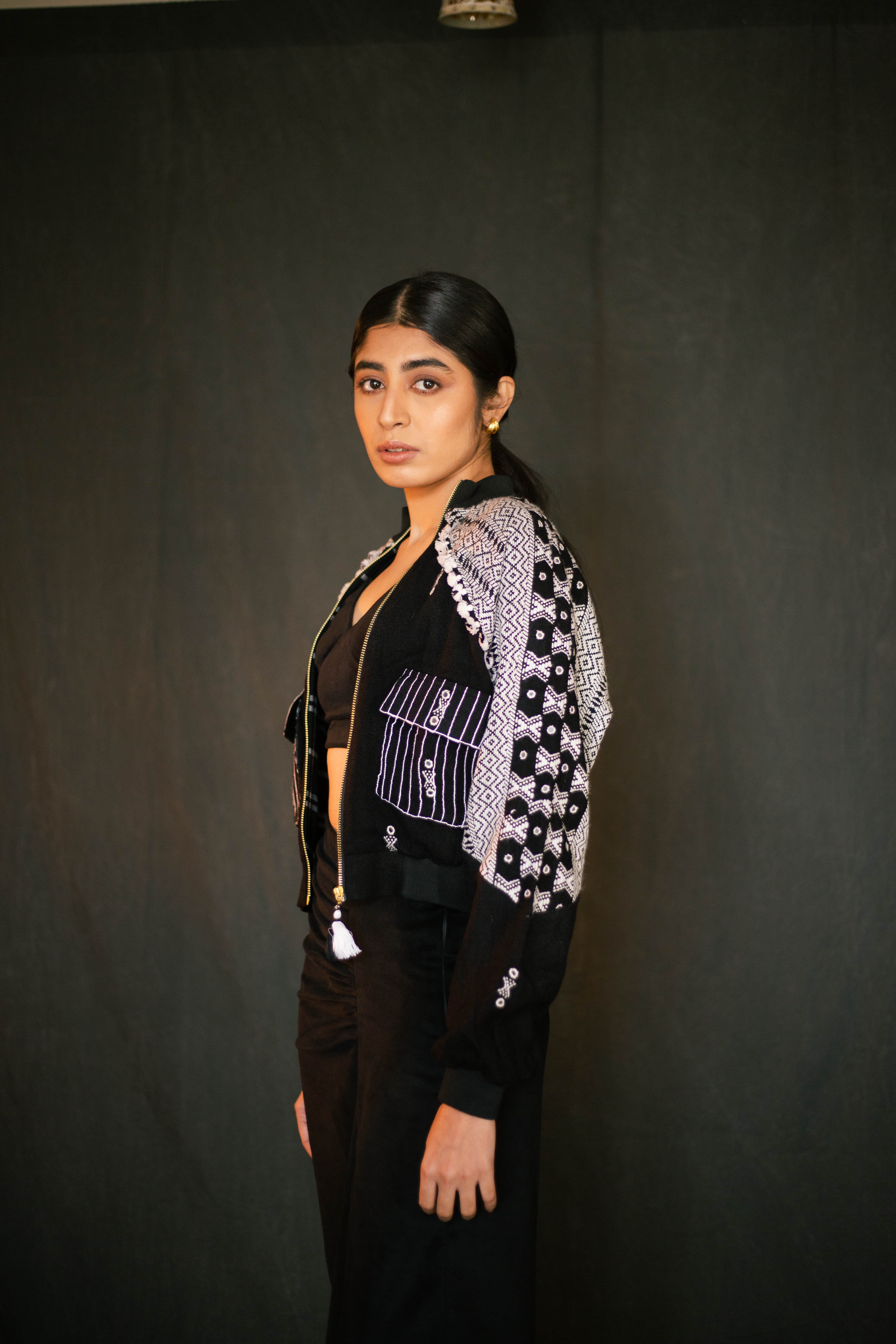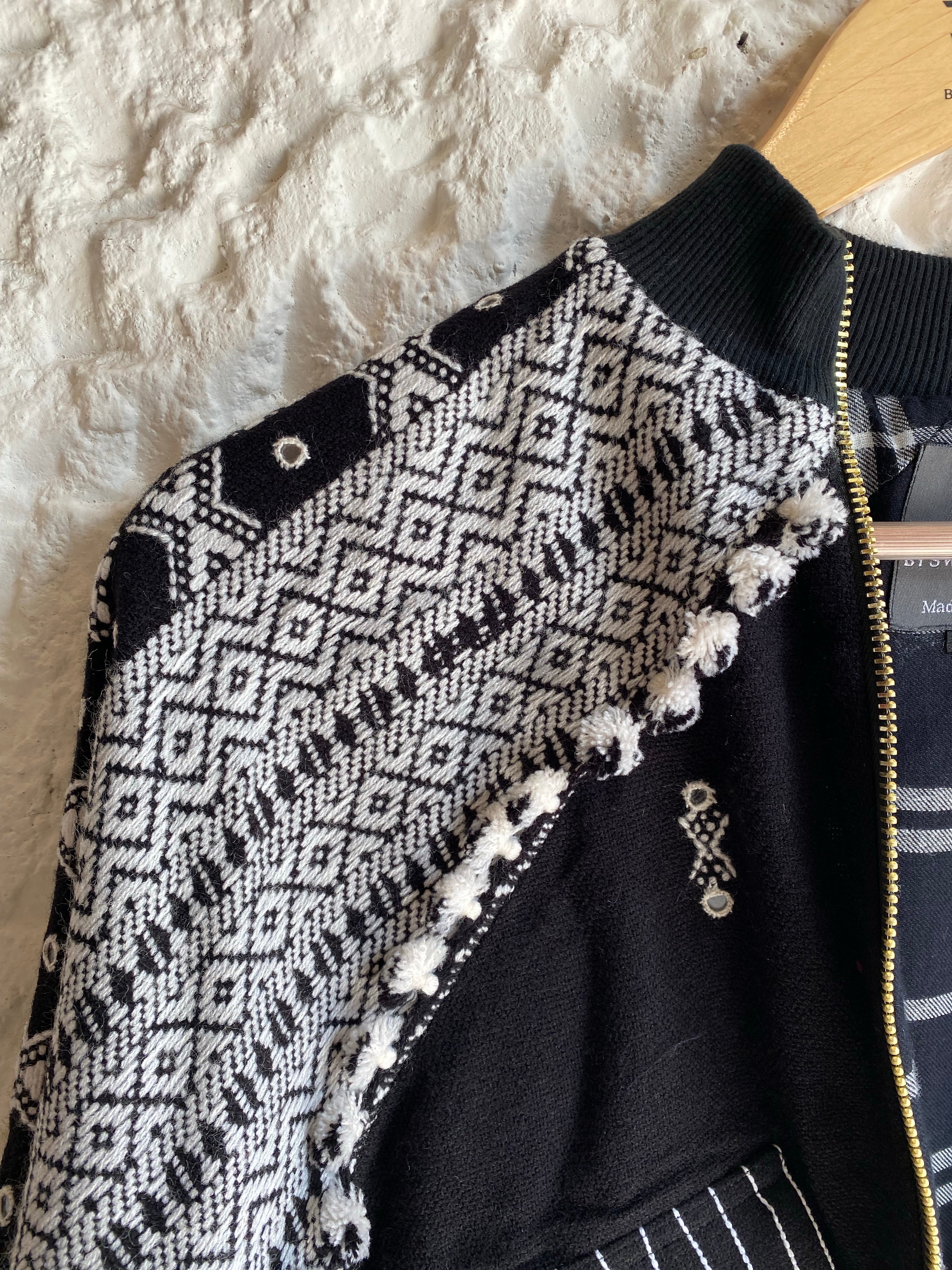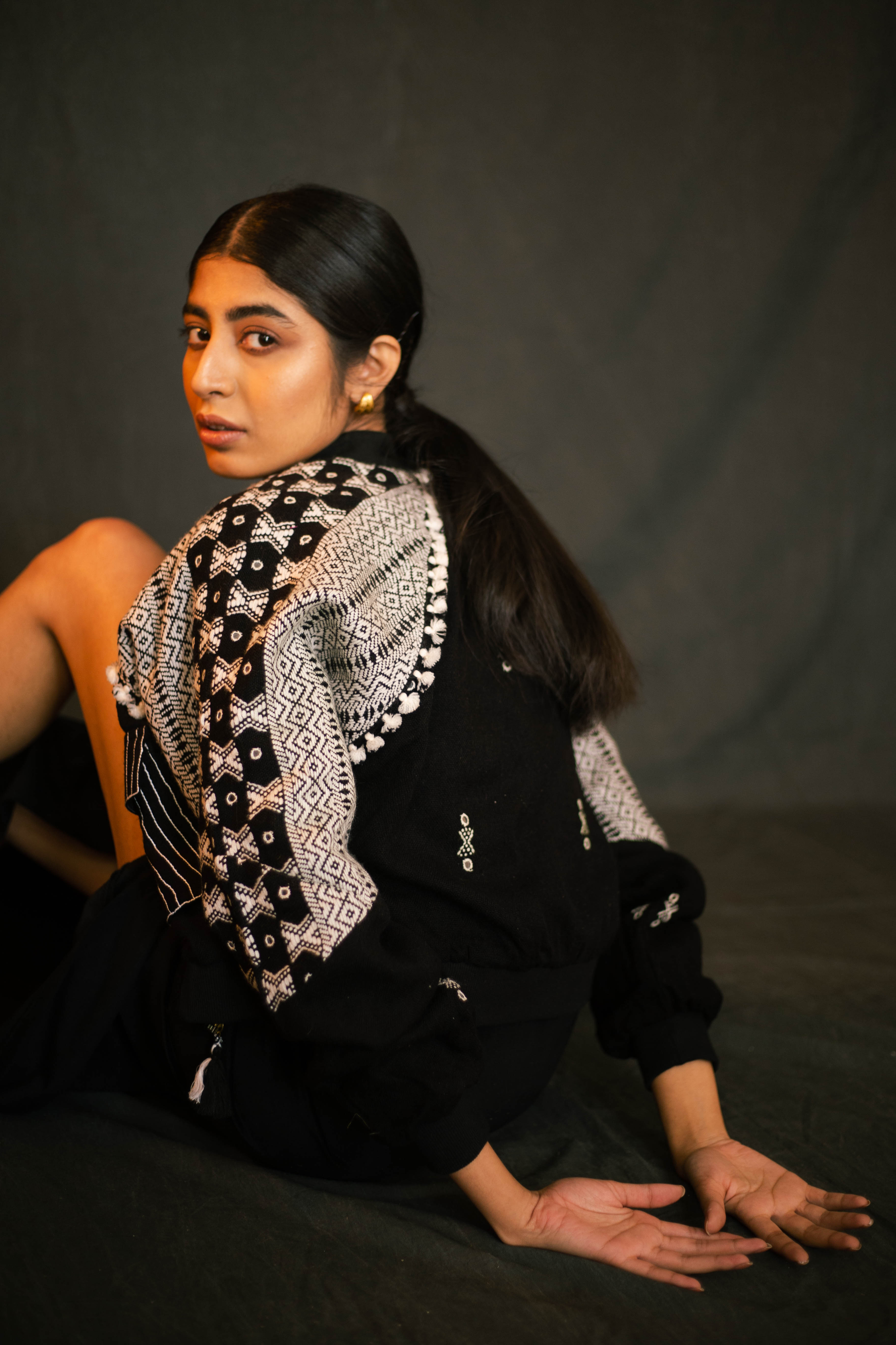 Swaroop Exclusive Design. “The Kutchii Jacket” is a marriage between Indian textile and modern silhouette. The fabric of the jacket is handcrafted by weavers of Bhujodi, Gujarat using traditional techniques passed down from generation to generation. Its front panel is embellished with mirror work and the design is elevated by check lining in organic cotton base.