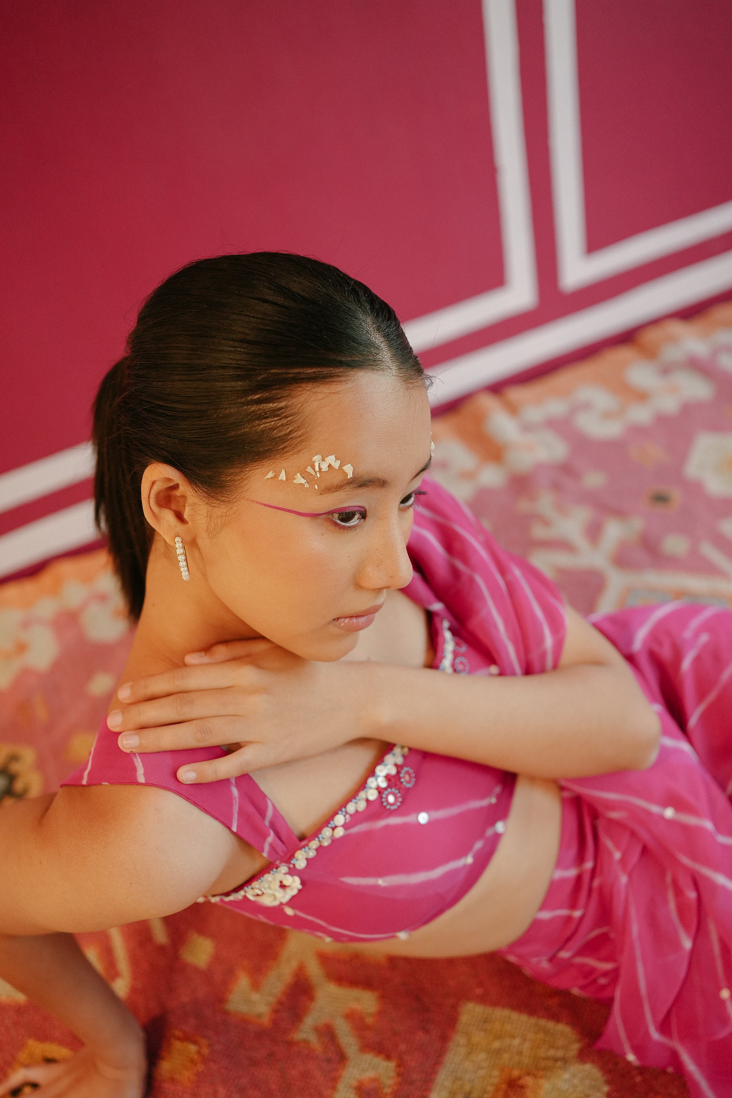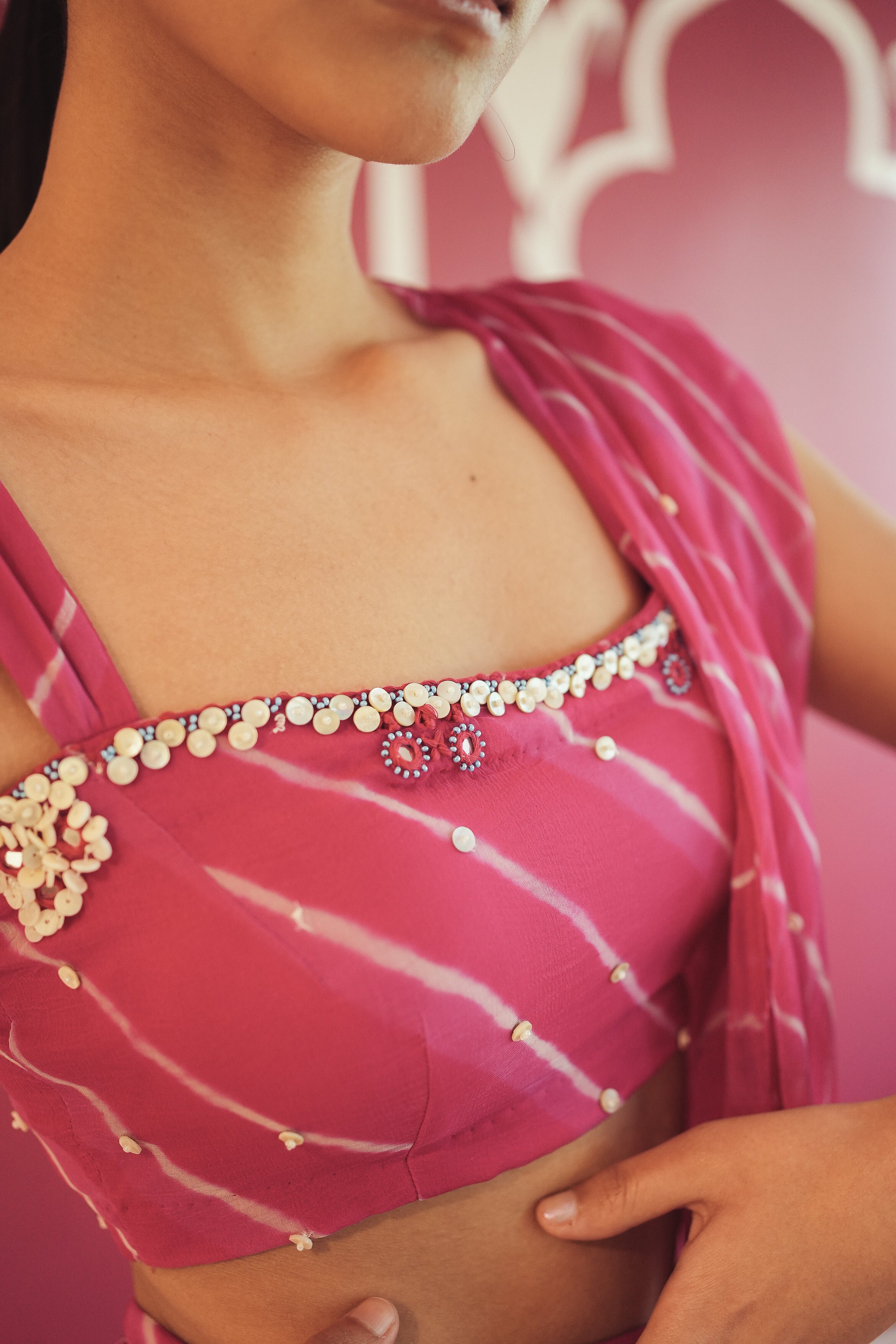 Swaroop Exclusive Collection. Bapu Blouse features intricate bead and shell work hand embroidery all over the blouse done by our in-house karigar. The blouse is padded and has a side zipper.