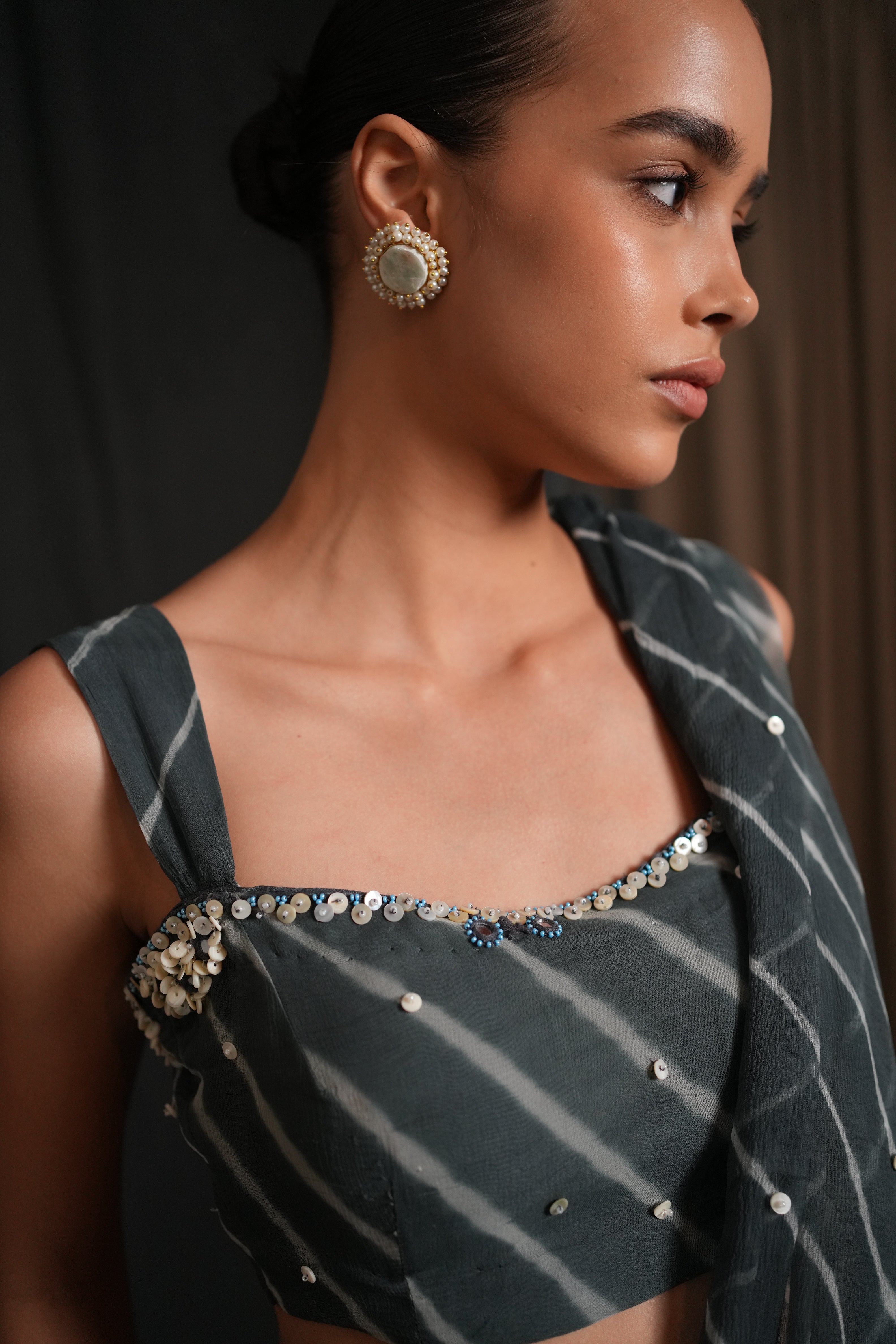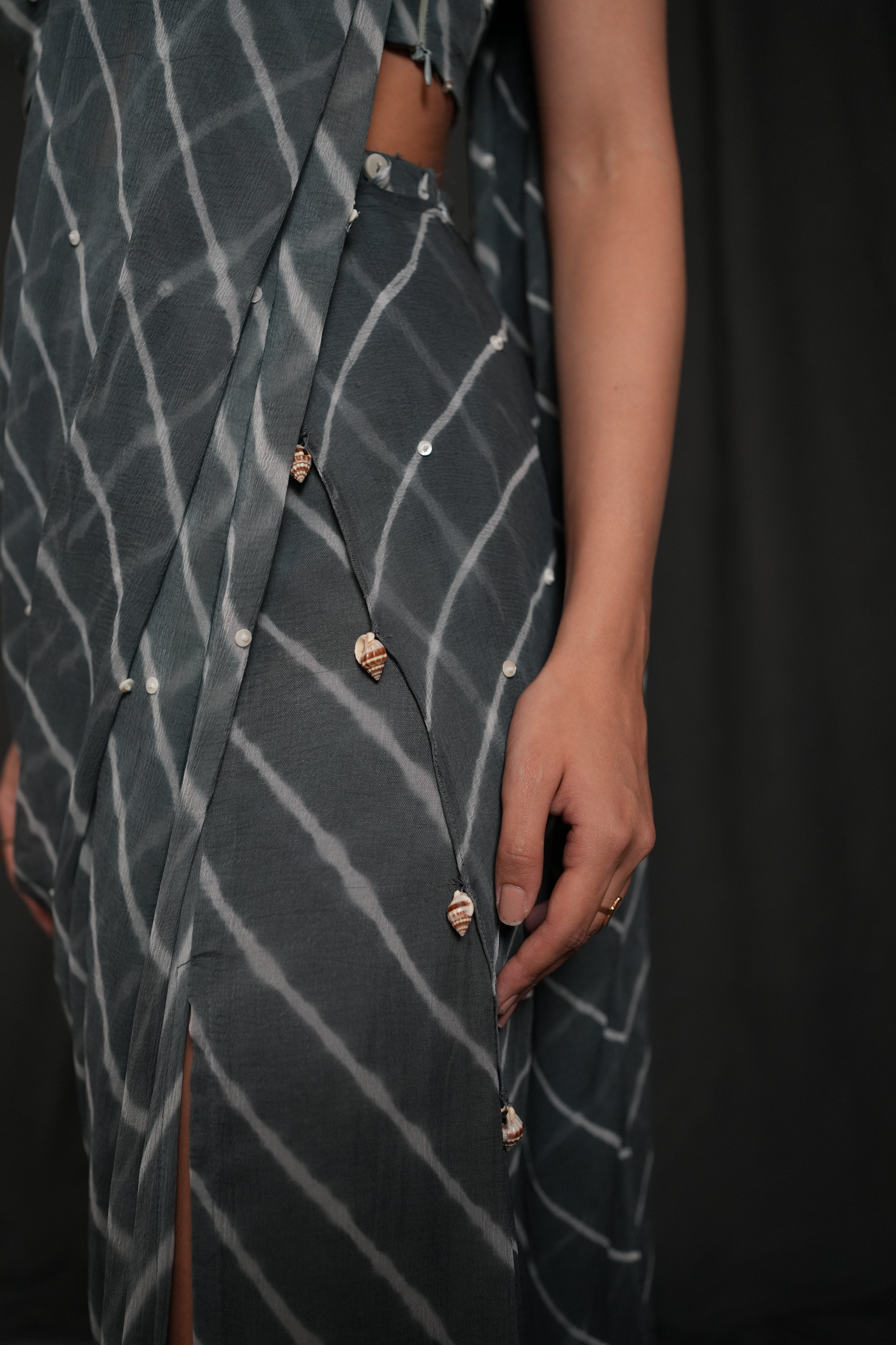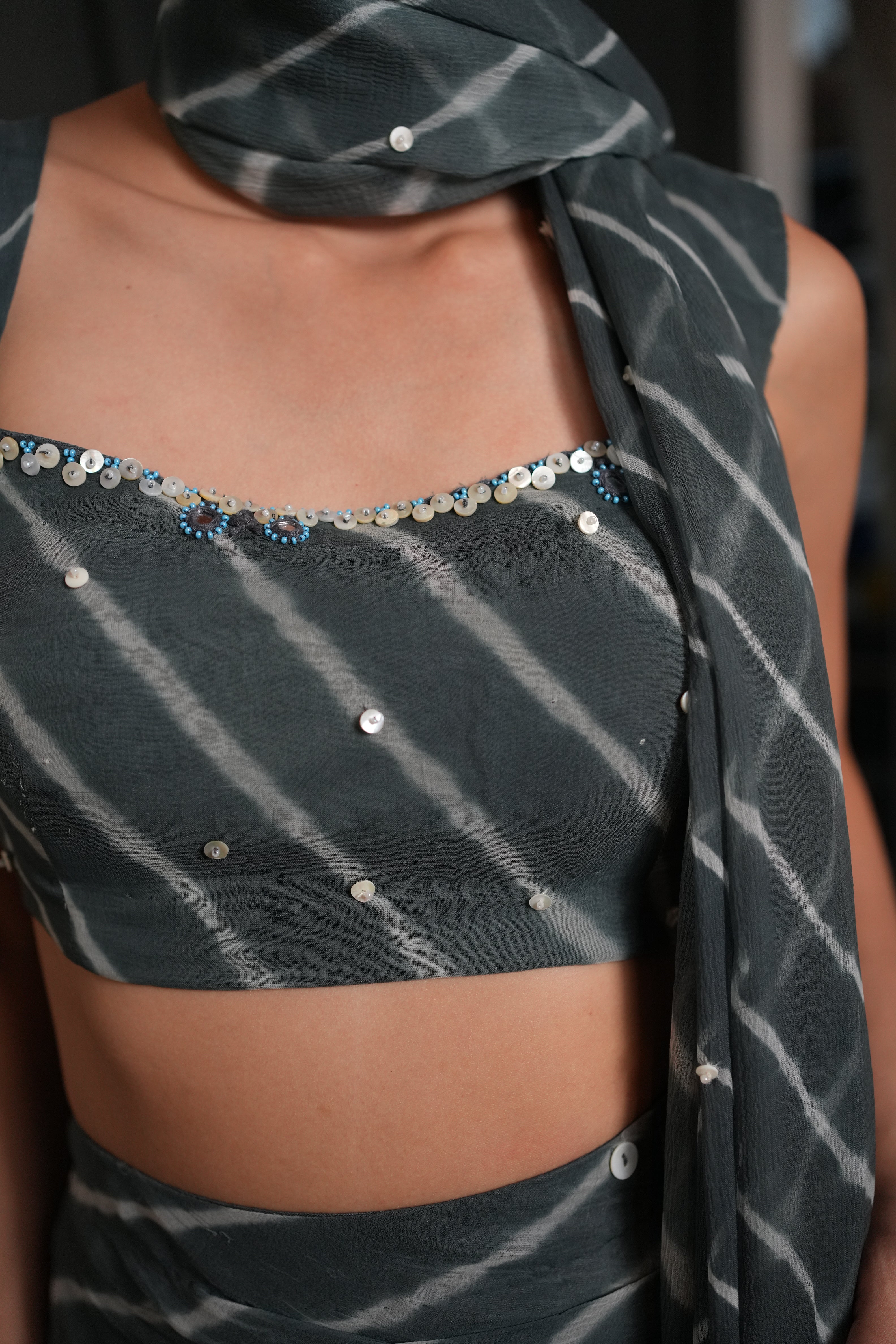 Swaroop Exclusive Collection. Showcasing the "Johari saree", crafted in leheriya pattern. This ensemble features a side-slit draped skirt paired with a hand-embroidered blouse adorned with intricate shell work. The blouse showcases a flattering square neckline and is secured with a side zip closure for ease of wear.