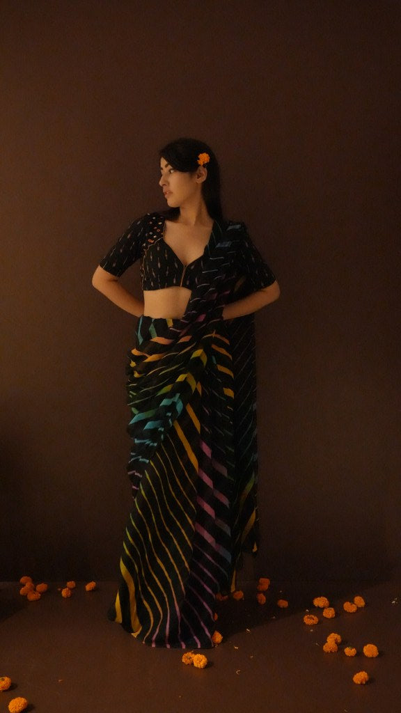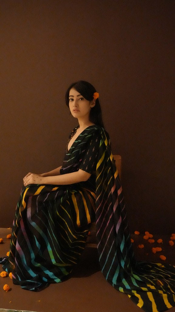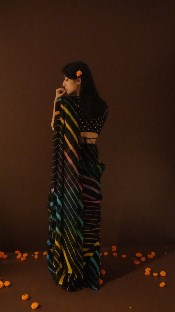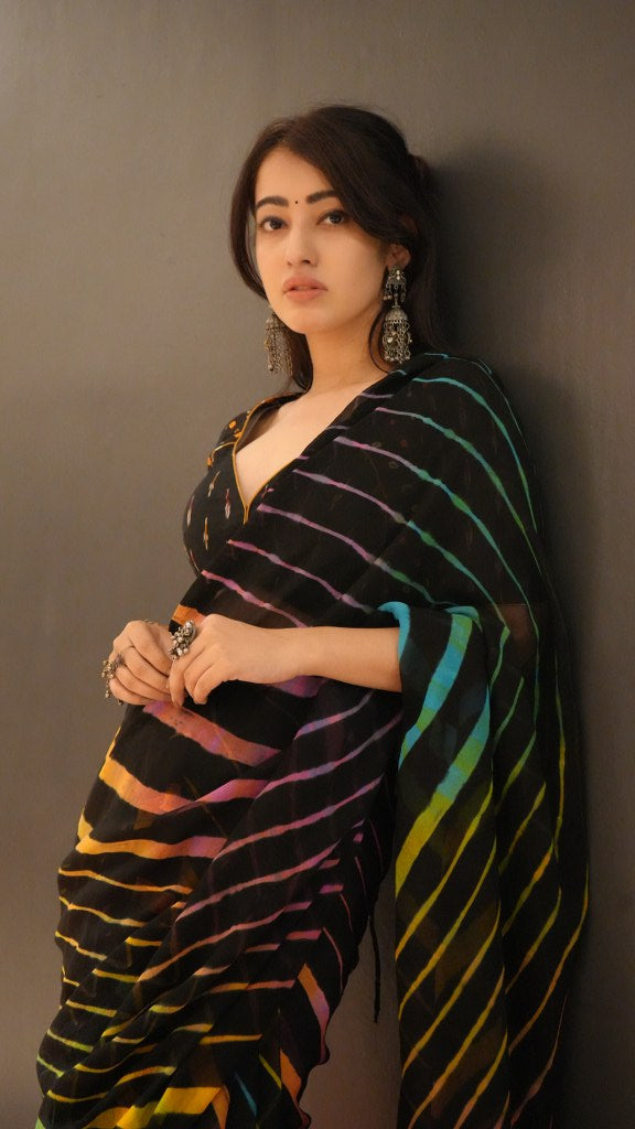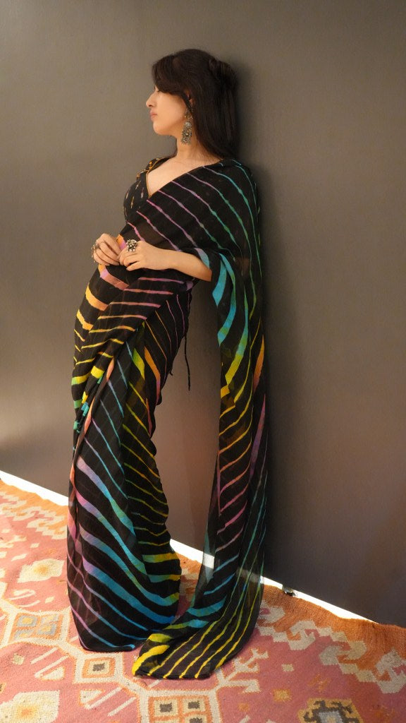 Elevate your festive attire with our stunning Rangeela Saree, made from luxurious pure lehriya chiffon. This unstitched saree boasts a vibrant lehriya pattern, perfect for adding a splash of color to any celebration. For a complete look, pair it with our beautifully crafted Bandhani & Ikat Rajasthan Choli Cut Blouse, featuring intricate designs that enhance your silhouette. This combination not only honors traditional craftsmanship but also ensures you shine at every occasion.