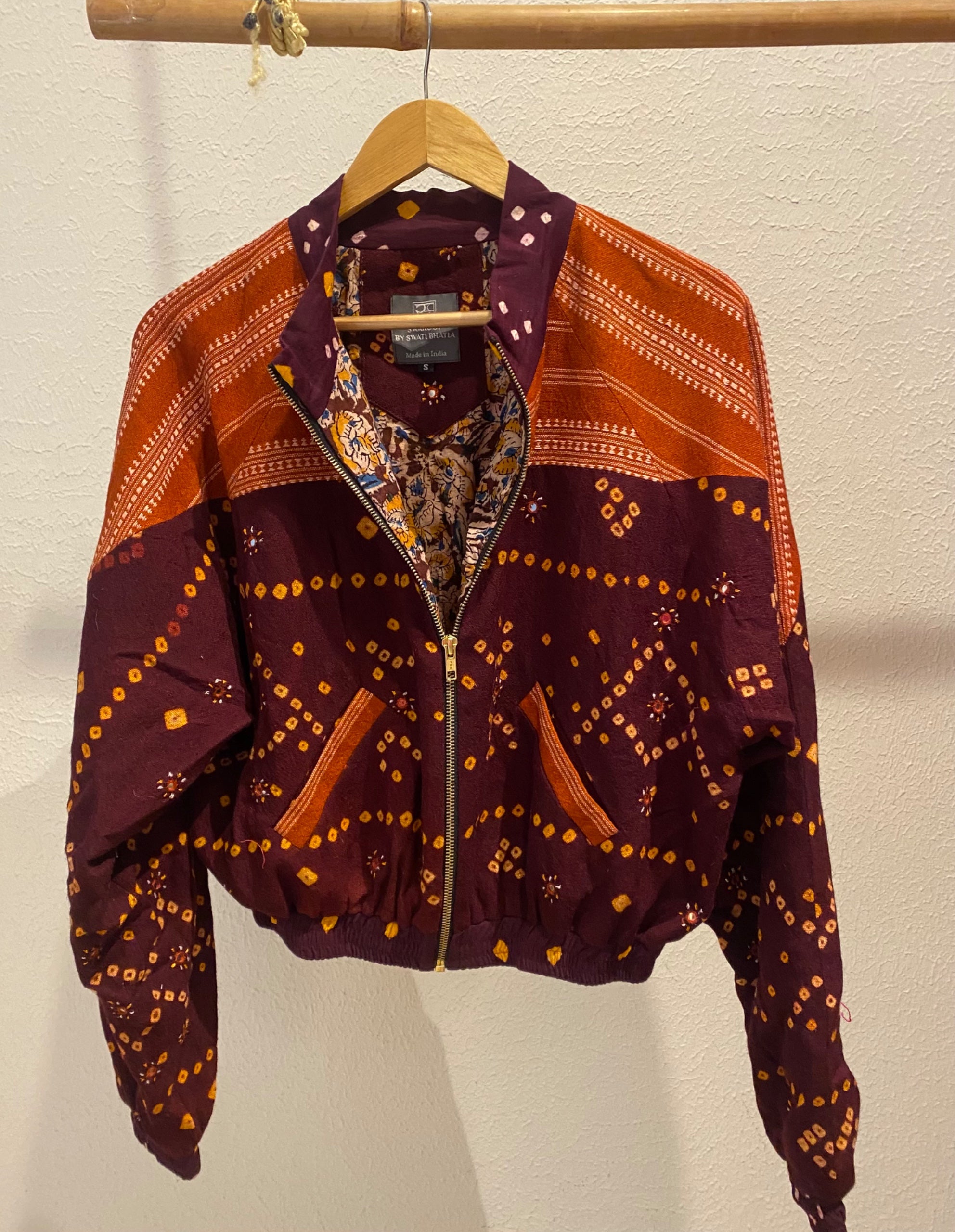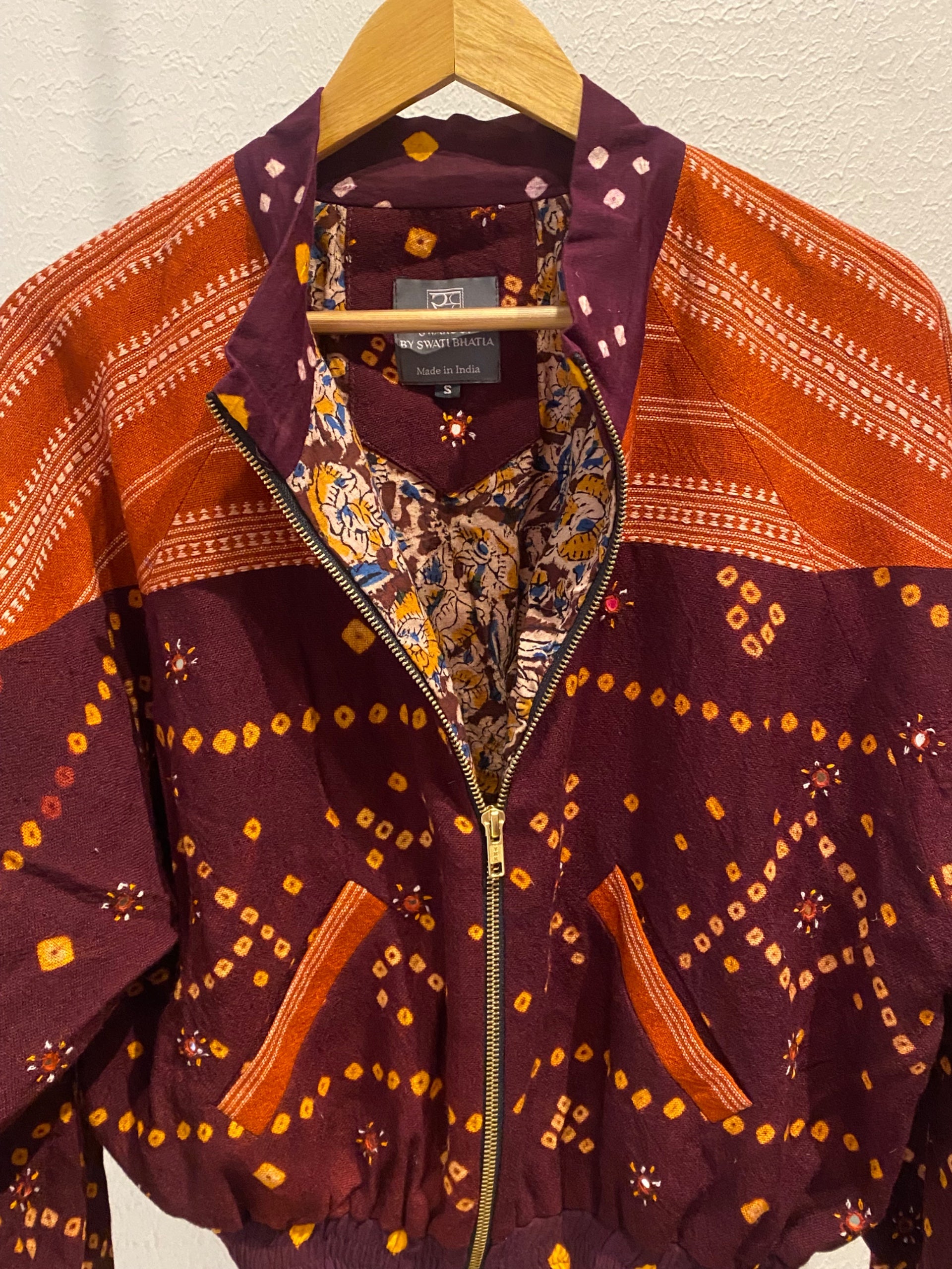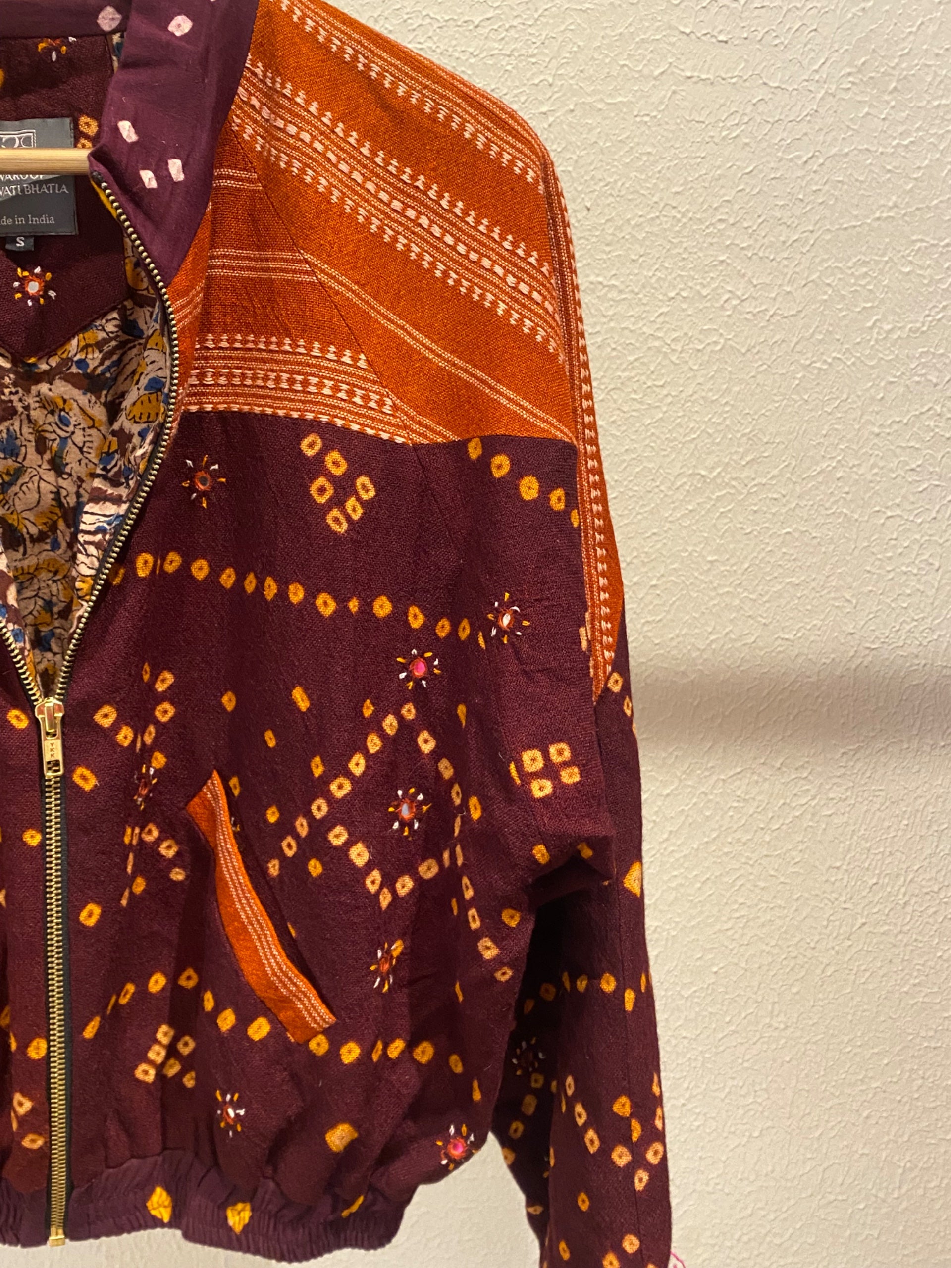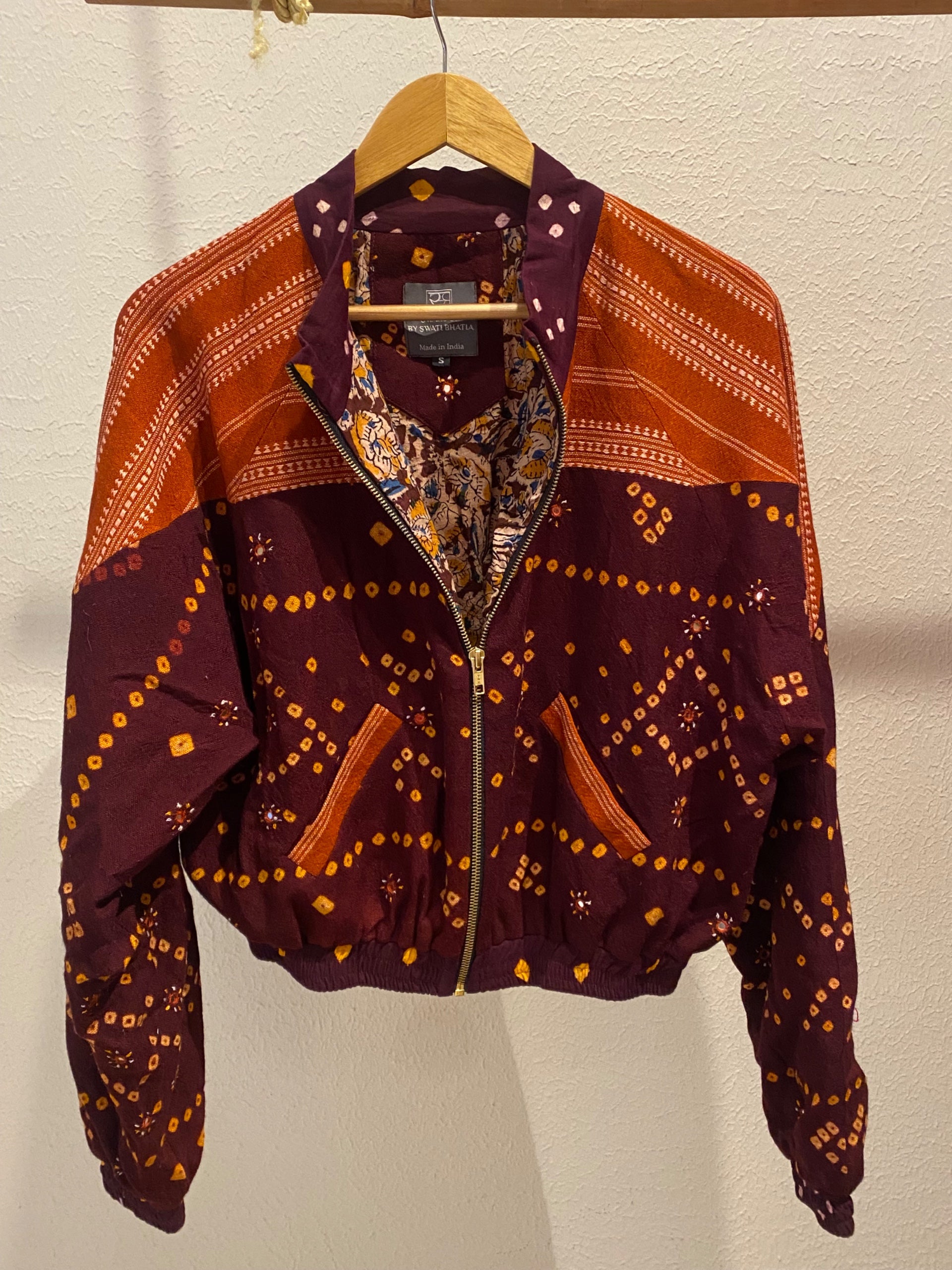 Swaroop Exclusive Design. “The Bandhani Mitti Bomber” is a marriage between Indian textile and modern silhouette. The fabric of the jacket is handcrafted by weavers of Bhujodi, Gujarat using traditional techniques passed down from generation to generation.