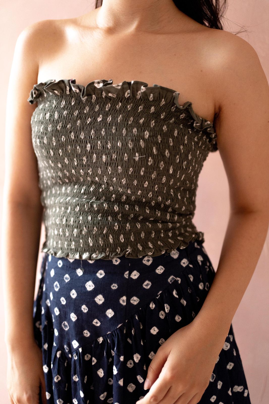 Swaroop Exclusive Design. A cute and breezy Bandhani top made from soft cotton, designed with delicate smocking for a snug yet comfortable fit. Lightweight and airy, it's perfect for warm summer days. The handcrafted Bandhani adds a playful touch of tradition to this modern silhouette. Pair it with our contrast Neelli skirt in deep blue for a striking summer look.