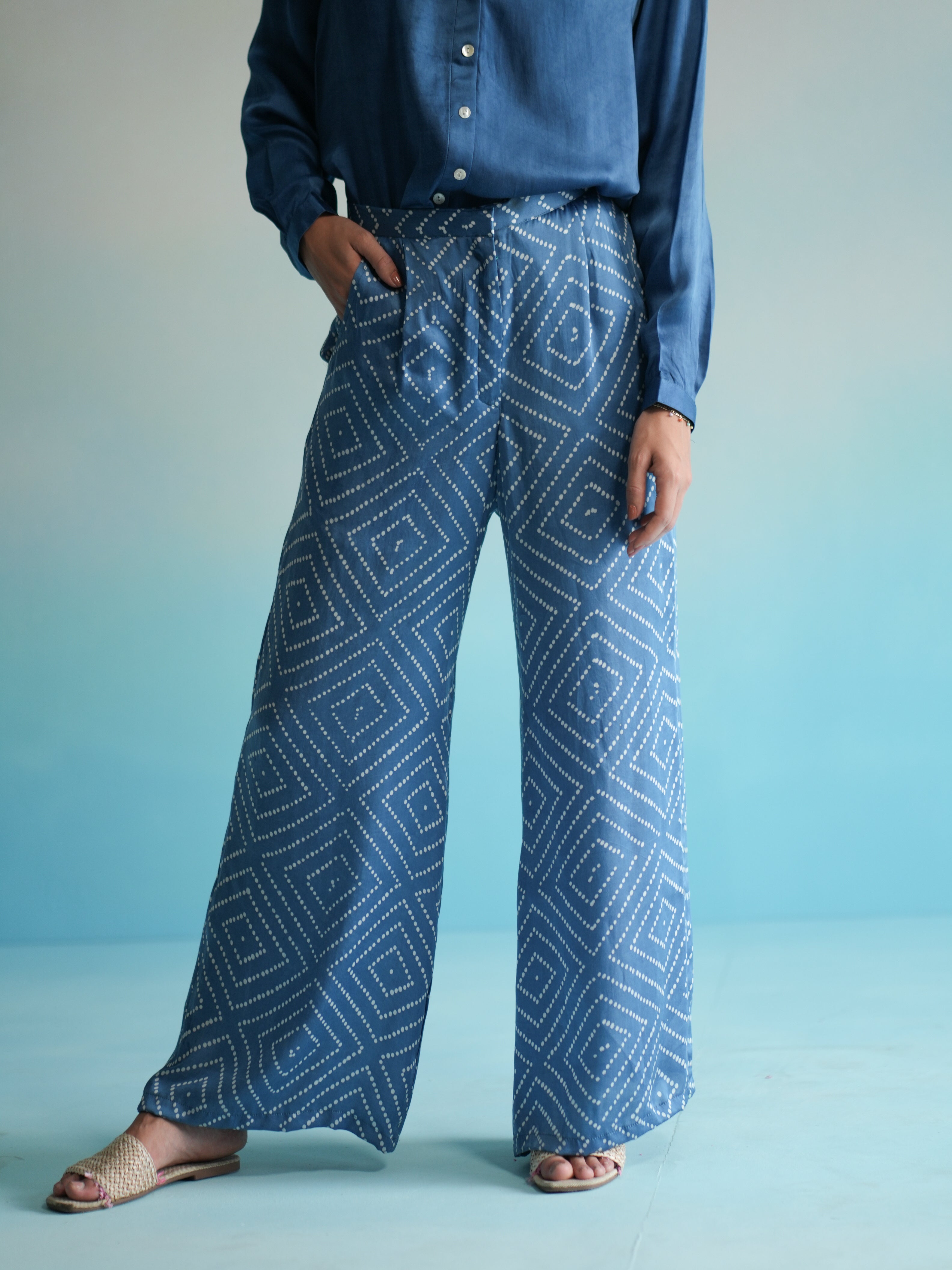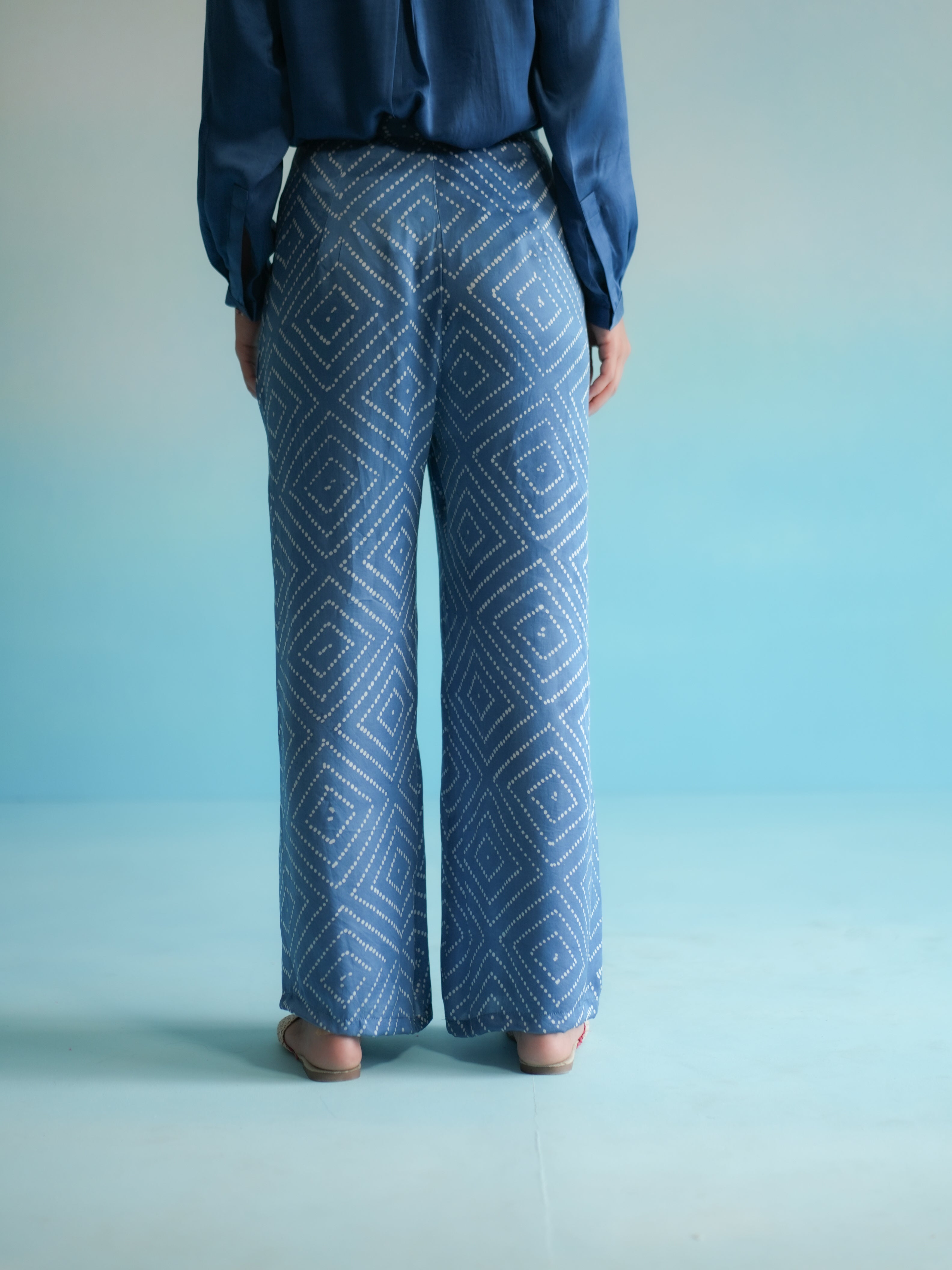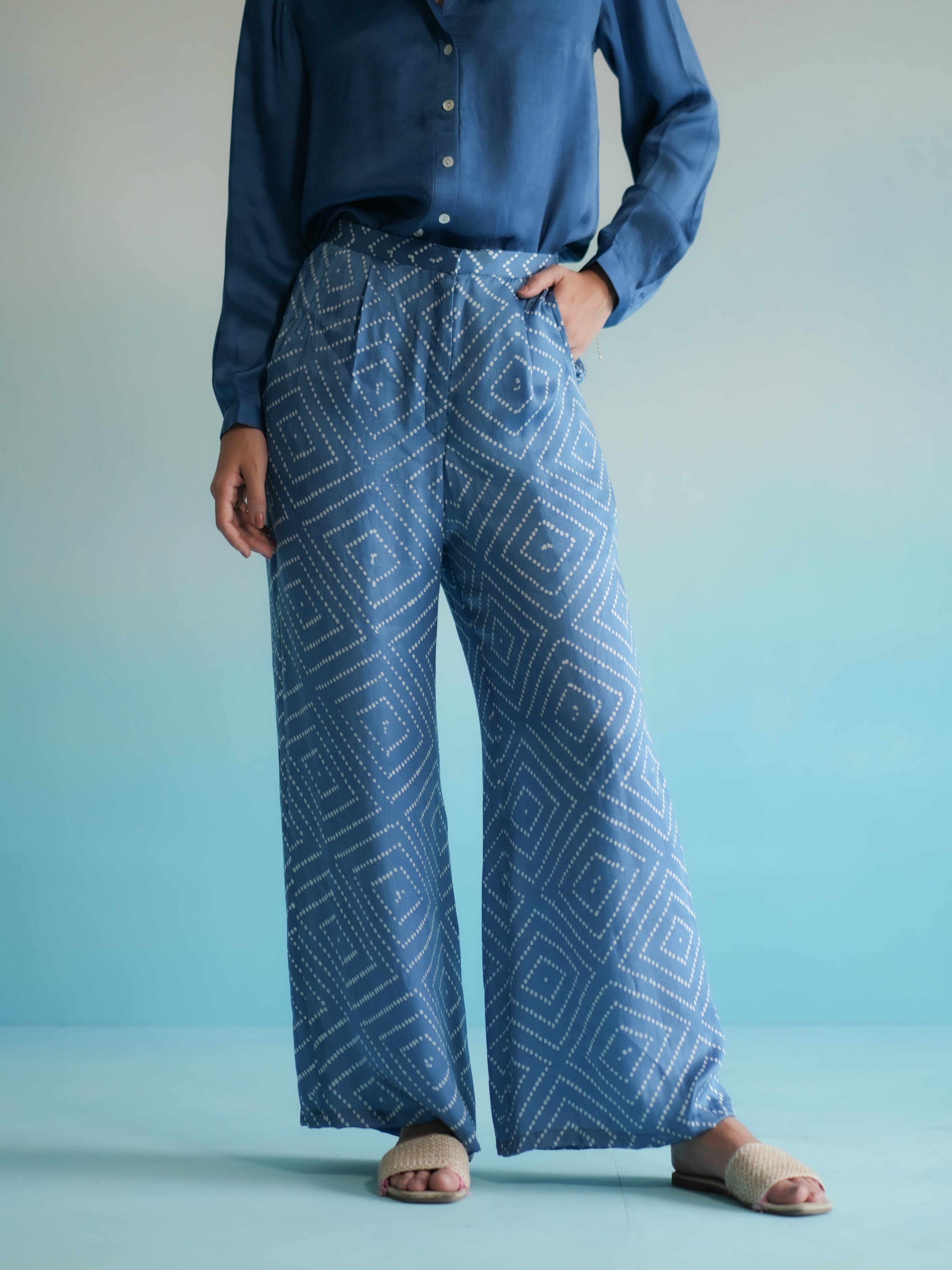 Crafted in rich Bemberg Satin, our Dhari Pants feature a delicate diamond dot wax pattern. The high-waisted pants come with side pockets, a front zipper, and a full belt, offering a perfect blend of comfort and style.