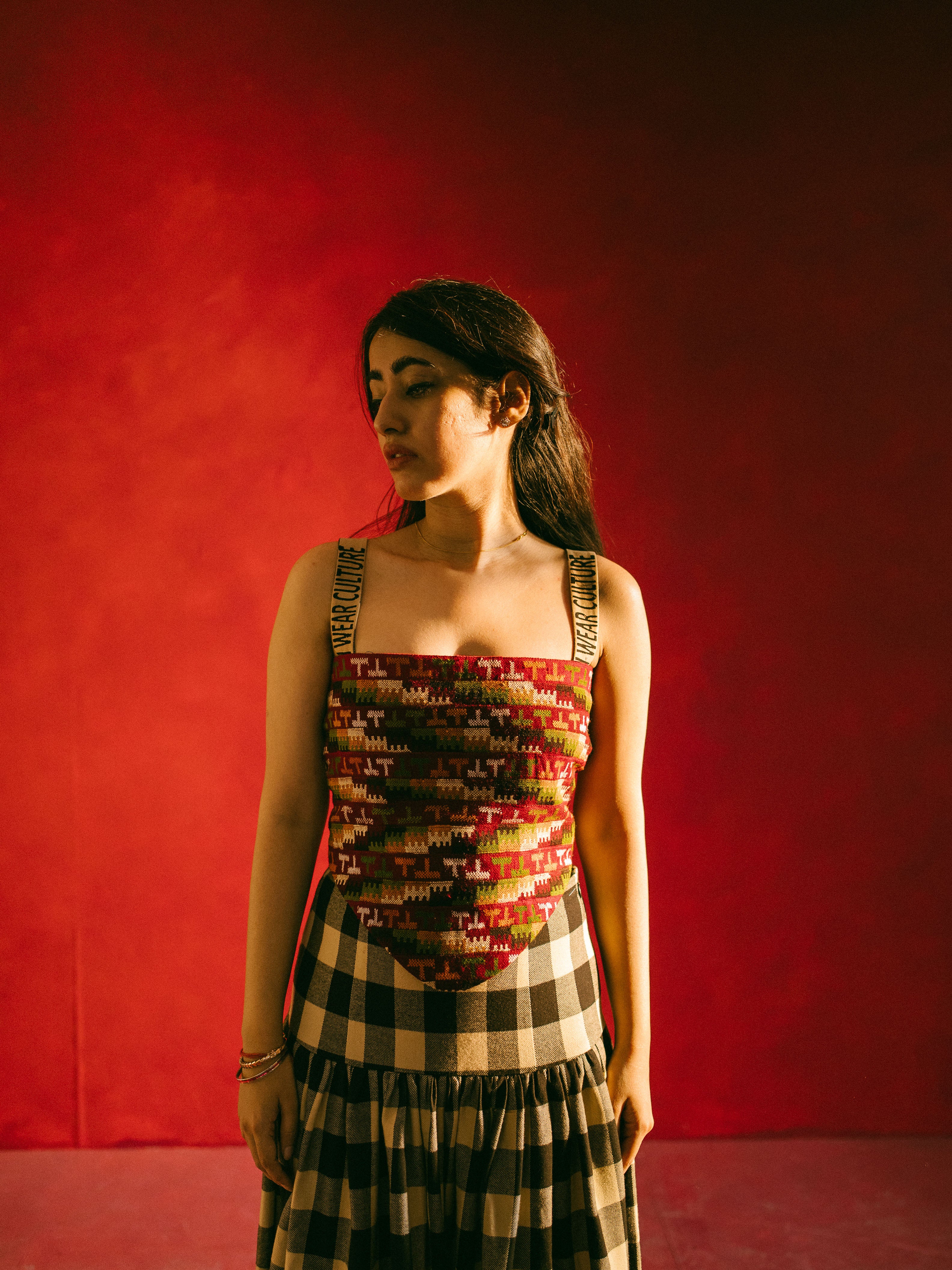 Swaroop Exclusive Design. Introducing Our Check Skirt Made from soft Brush Cotton Fabric, the long skirt features a high-rise V-shaped yoke that softly shapes the waist, Delicate all-around gathers begin just below the yoke, creating an A-line silhouette that moves gracefully with you. A hidden belt waist and invisible side zip.