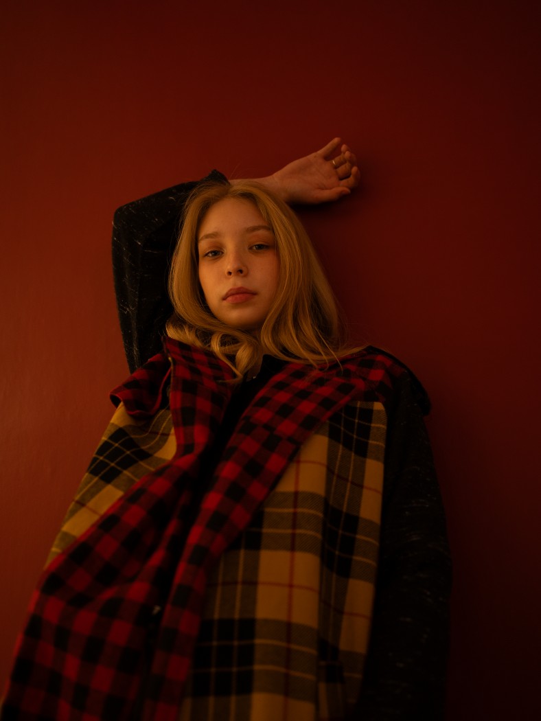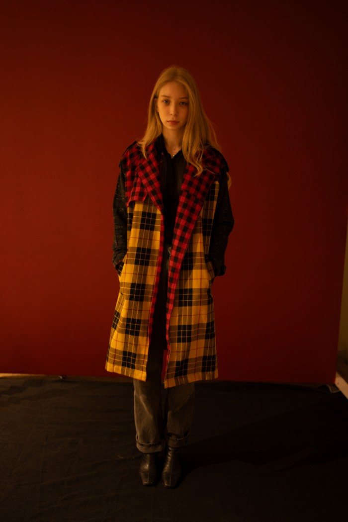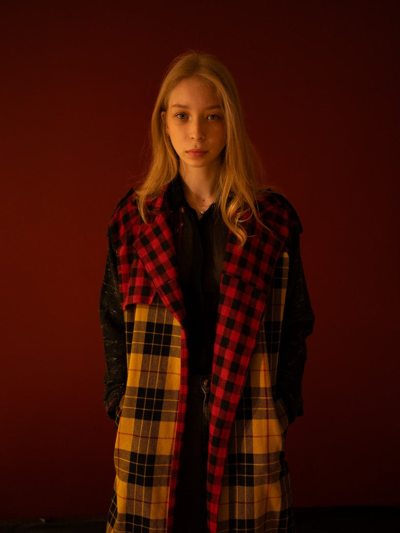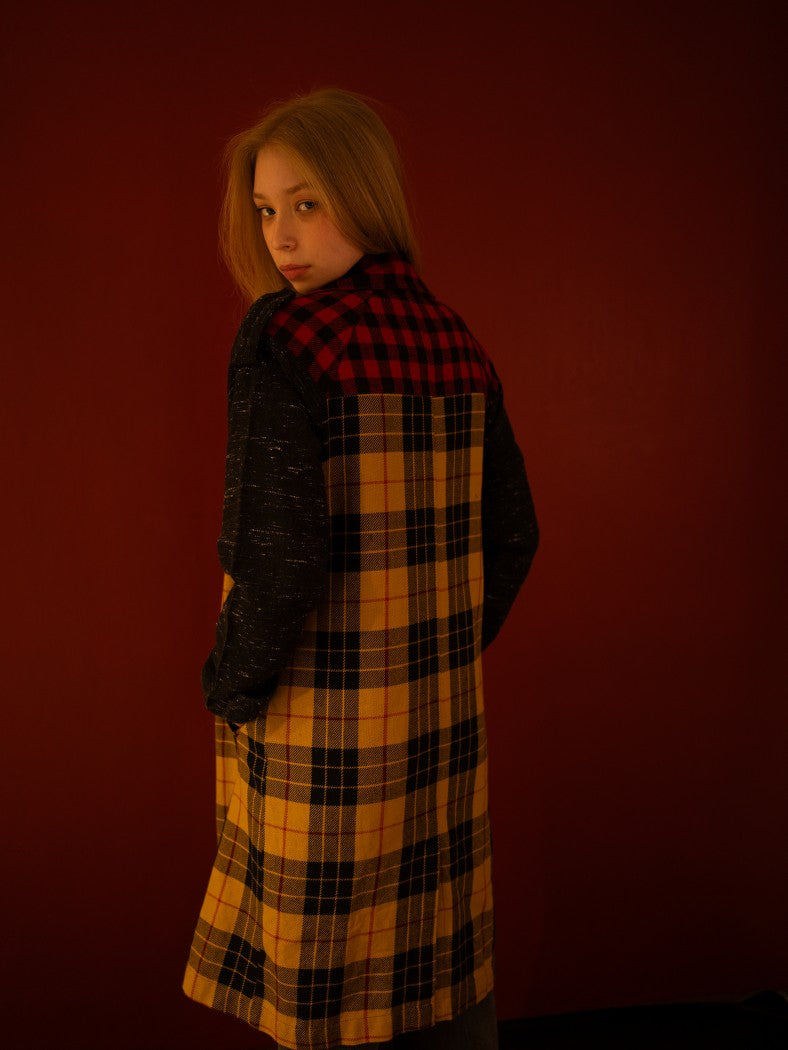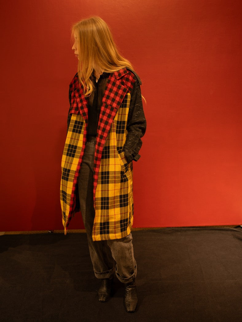 Swaroop Exclusive Design. Showcasing Check Trench – a panelled coat crafted from a luxurious wool blend. Featuring a striking colour block design with red and yellow checks, this trench is stylish and versatile.