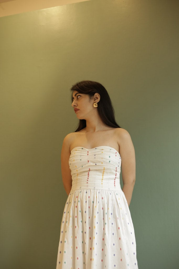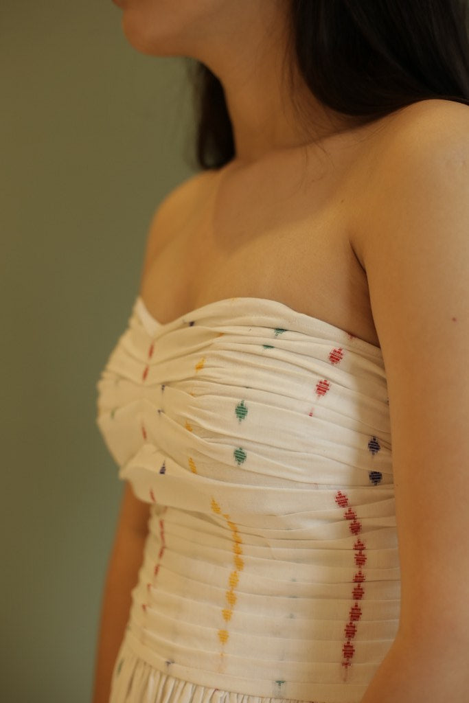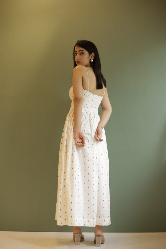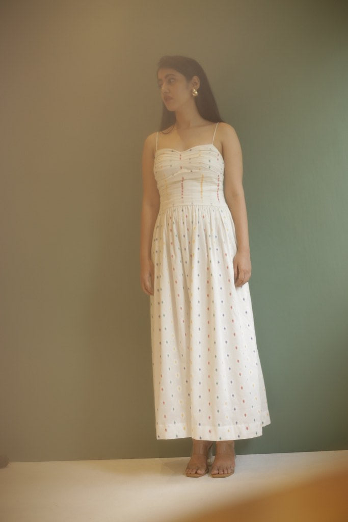 Swaroop's exclusive collection. Introducing Lehar dress in Dobby a stunning pleated maxi dress in soft cotton with delicate noodle sleeves and a deep neckline. Smocking at the back.