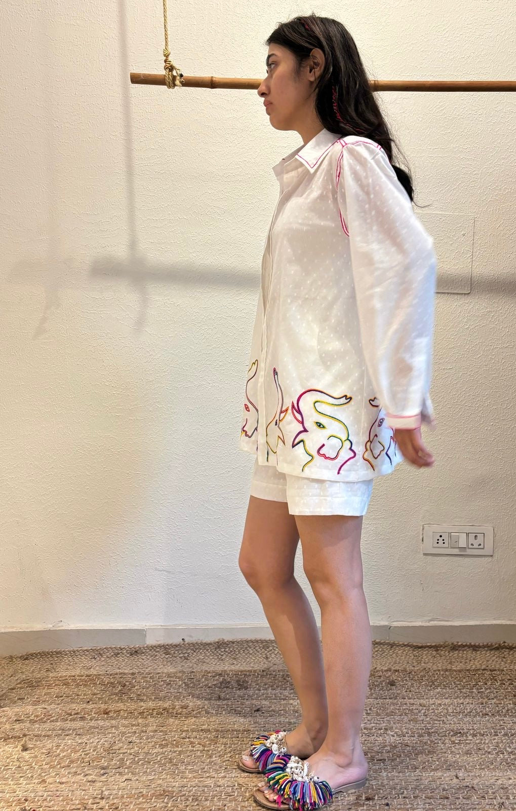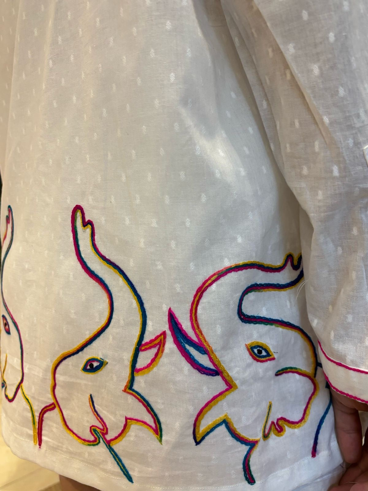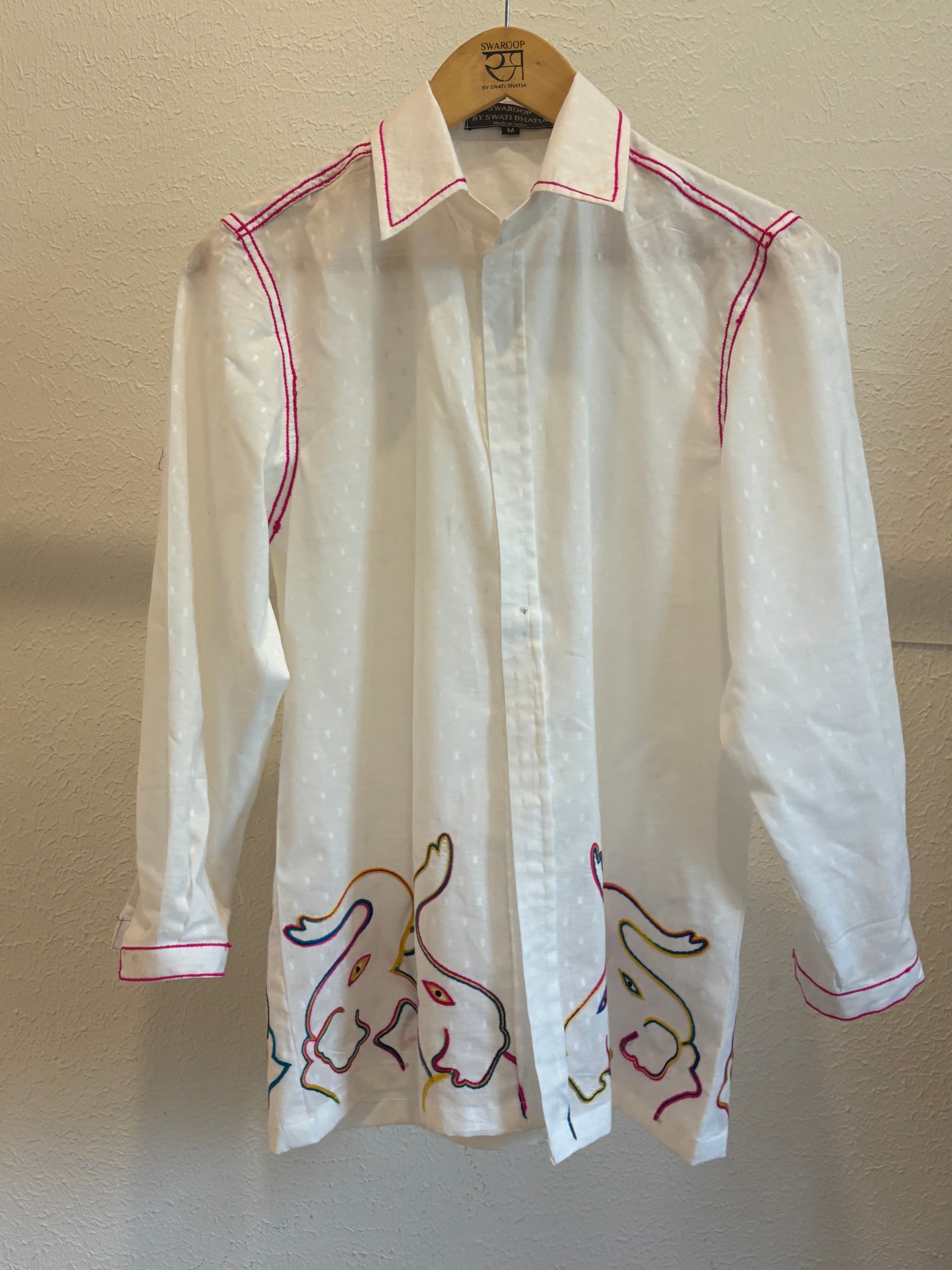 Swaroop Exclusive Elephant Shirt, crafted from lightweight dobby weave cotton for ultimate summer comfort. Featuring a vibrant elephant motif hand embroidery design and delicate pink chain stitch details, Perfect for beach days, casual outings, or relaxed weekends, Pair it with our Cotton Shorts,Β and slip into your favorite sandals for an effortlessly chic look. Lightweight, airy, and stylish, itβs a must-have for your summer wardrobe.