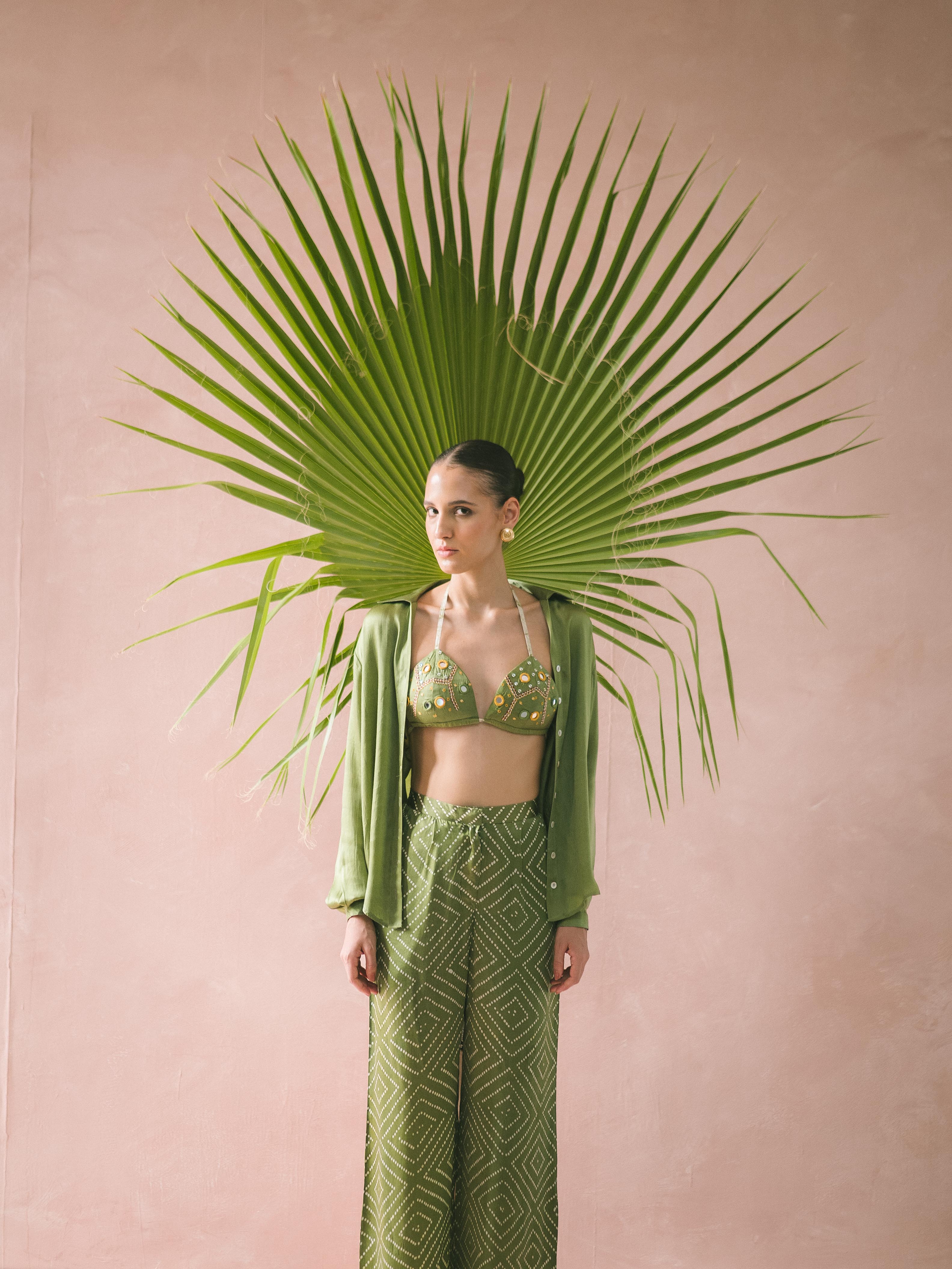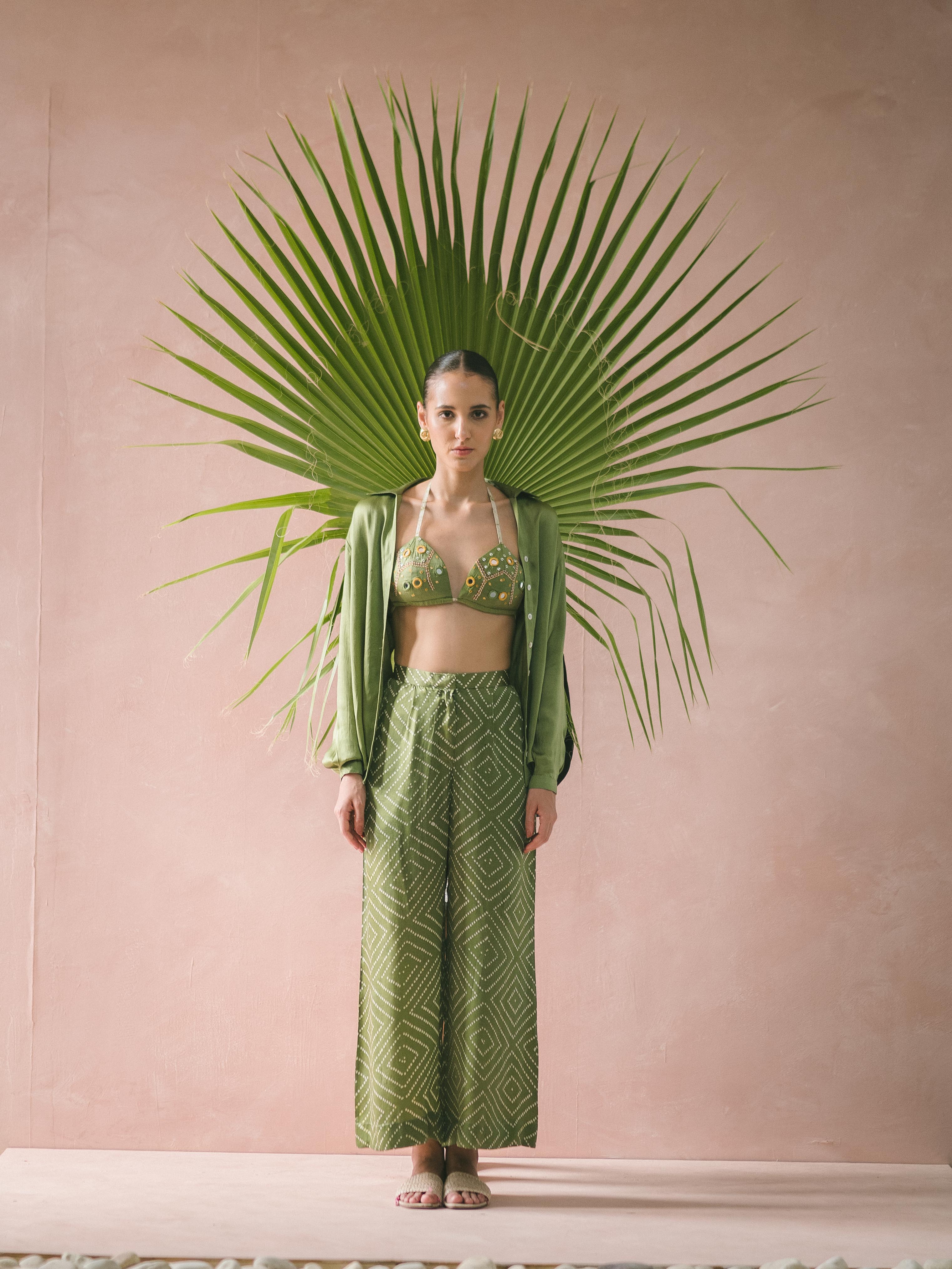 Crafted in rich Bamberg Satin, our Kachhi Pants feature a delicate diamond dot wax pattern. The high-waisted pants come with side pockets, a front zipper, and a full belt, offering a perfect blend of comfort and style.