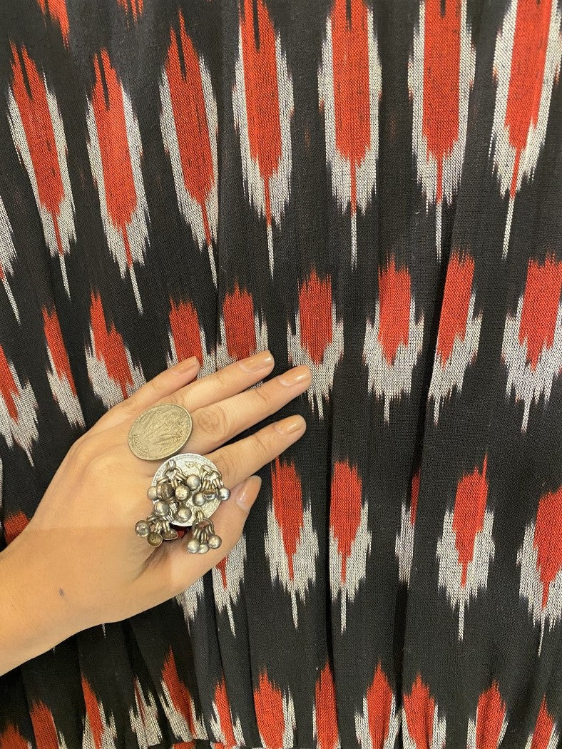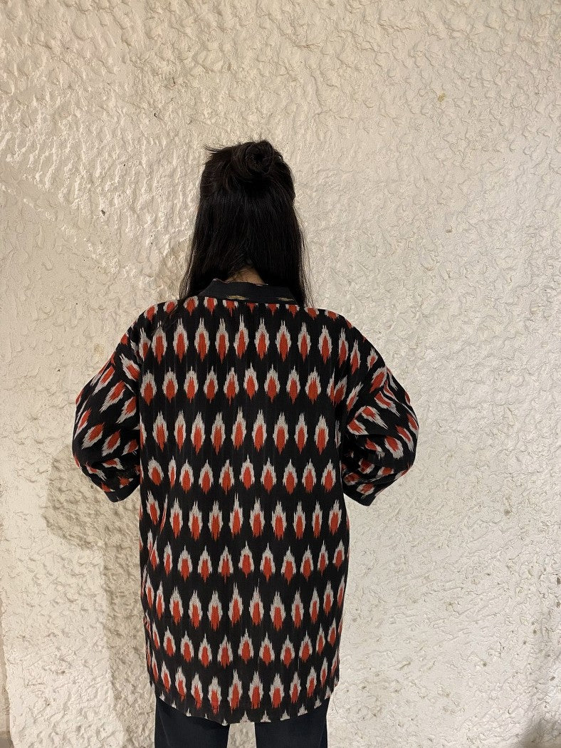 Swaroop Exclusive Design. Featuring a Hippie Jacket. It is a fusion between Handloom Ikat weaves and modern silhouettes. Crafted in a comfortable fit. Wear it and flaunt it a little bit everywhere you go.