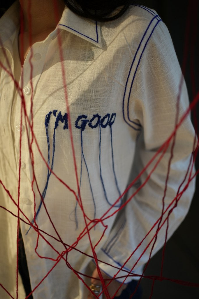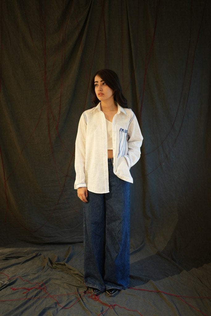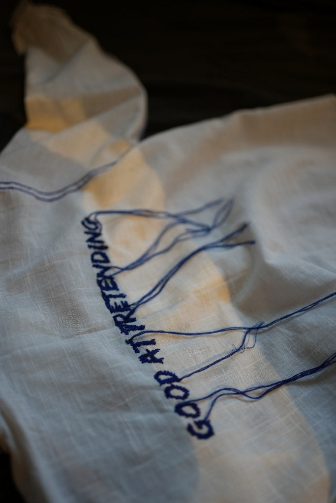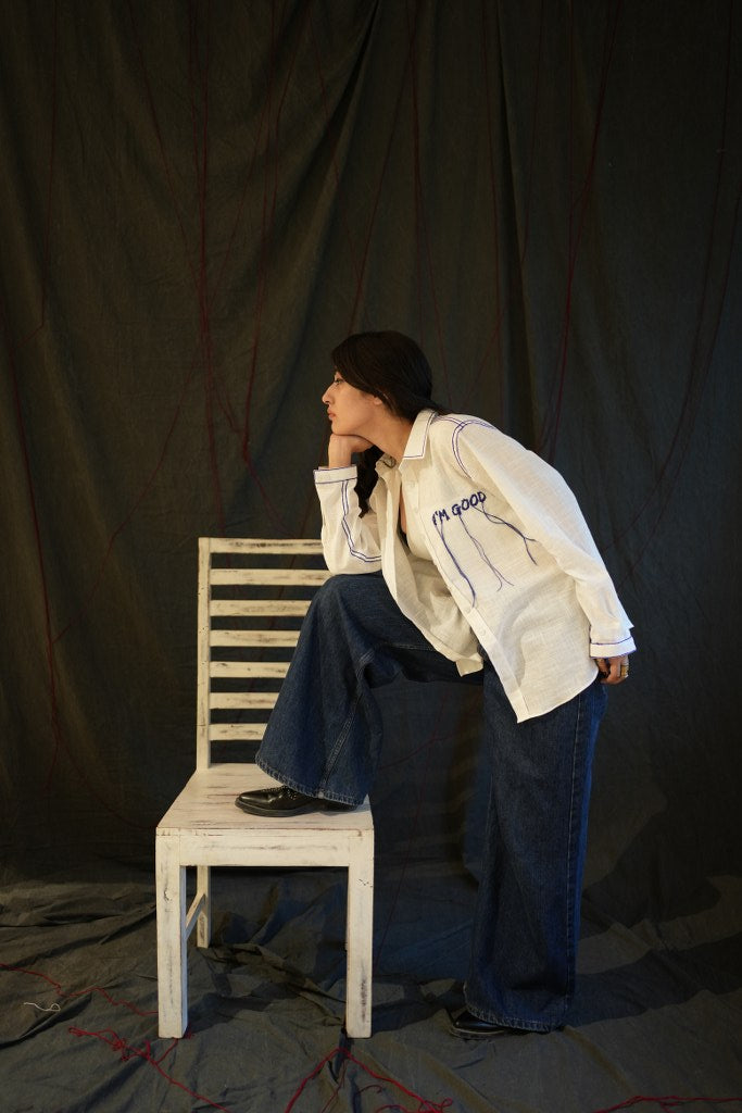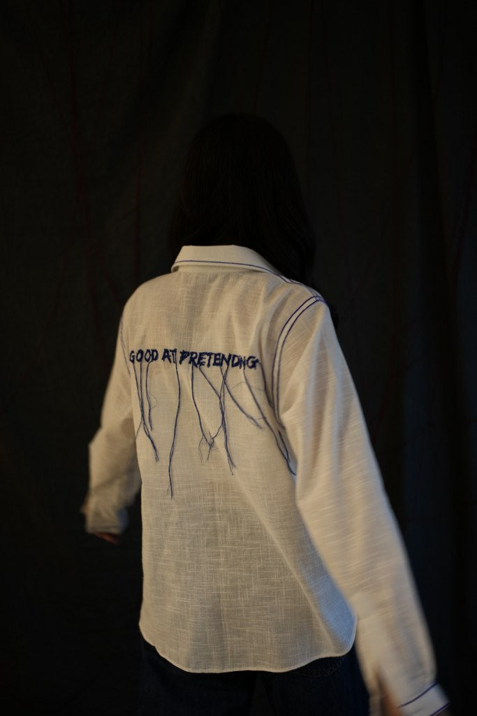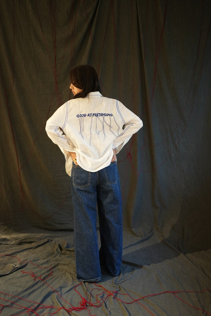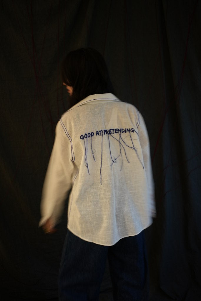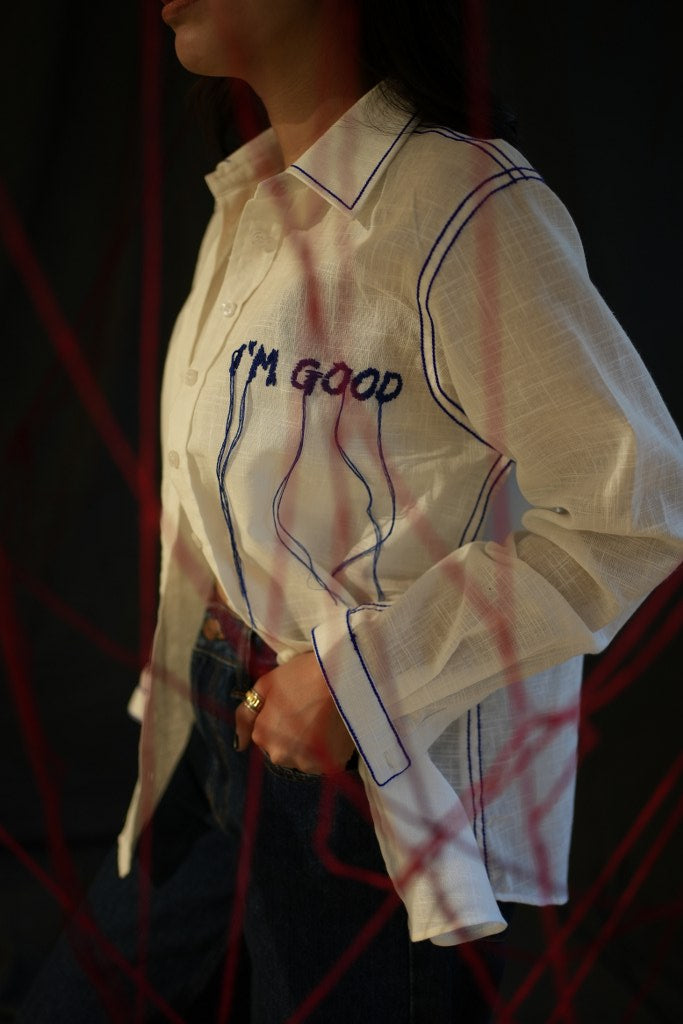Introducing the "I am good" shirt, delicately crafted from lightweight cotton fabric with chain stitch detailing. This shirt serves as a reminder of our inner strength. Featuring hand-embroidered typography proclaiming "I am good" on the front and "Good at pretending" on the back. This jadds depth and motivation to the garment.