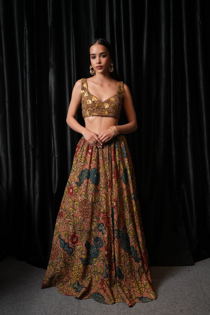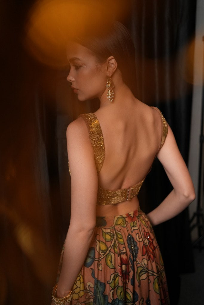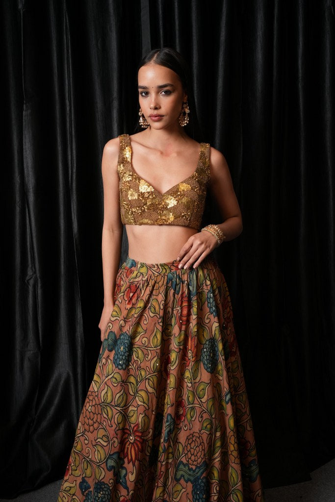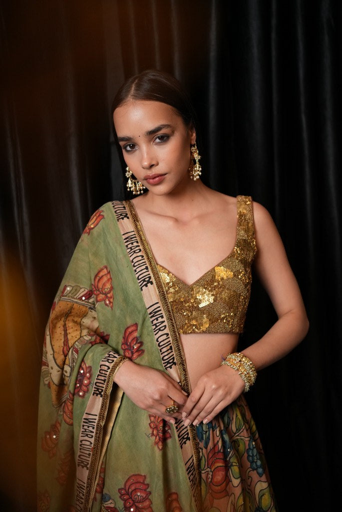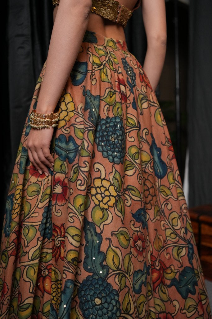 Immerse yourself in the beauty of tradition with our Hand-Painted Kalamkari Lehenga Set. The lehenga, crafted on a chanderi fabric base, features intricate hand-painted floral and leaf motifs accented with shimmering sequins. Its has gathers and scalloped edges with bandhani facing.