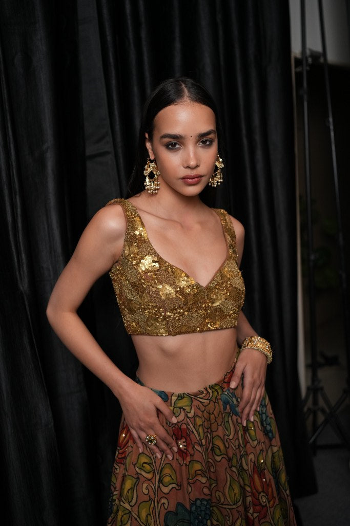 The blouse is hand embroidered with metal sequins and beadwork, creating a statement piece with a deep neckline and back hook-eye closure.