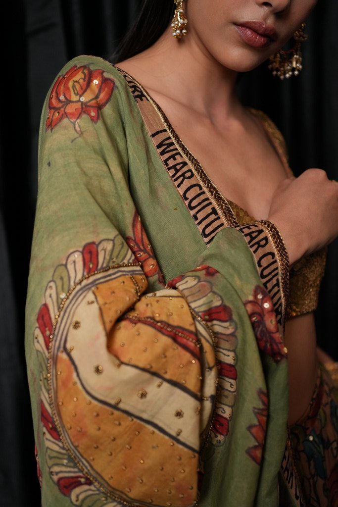 The dupatta is a true work of art, adorned with hand-painted lotus motifs and further enhanced with sequins and bead highlights. Its I wear culture border, cutdana lace, and contrasting triangle patches on the hem complete this stunning ensemble. Perfect for celebrations, this set combines elegance with cultural heritage.