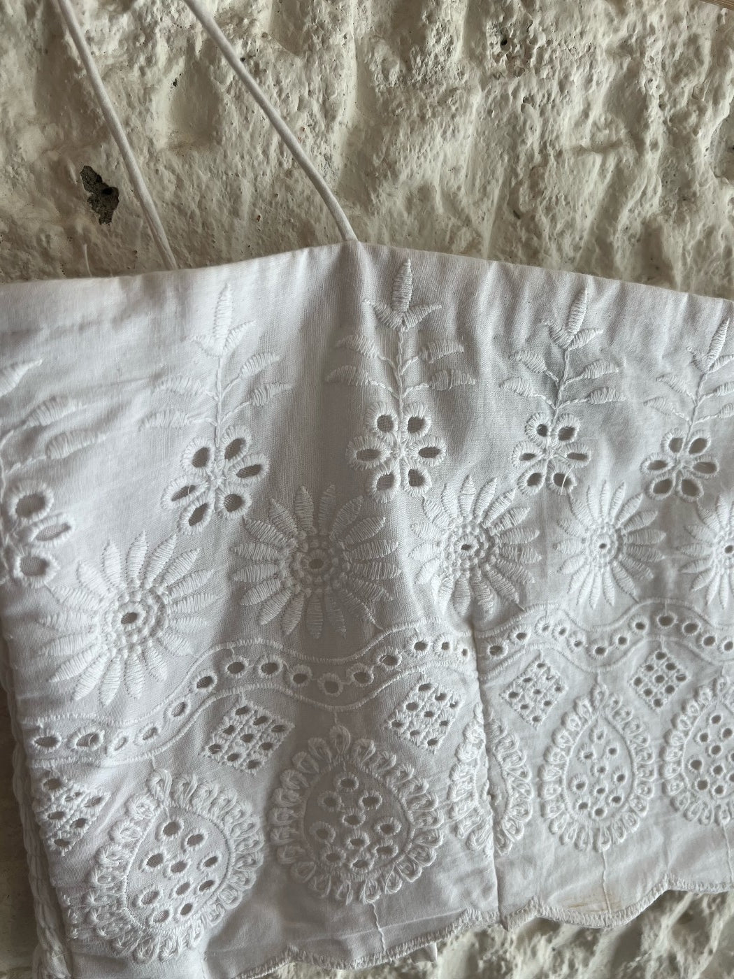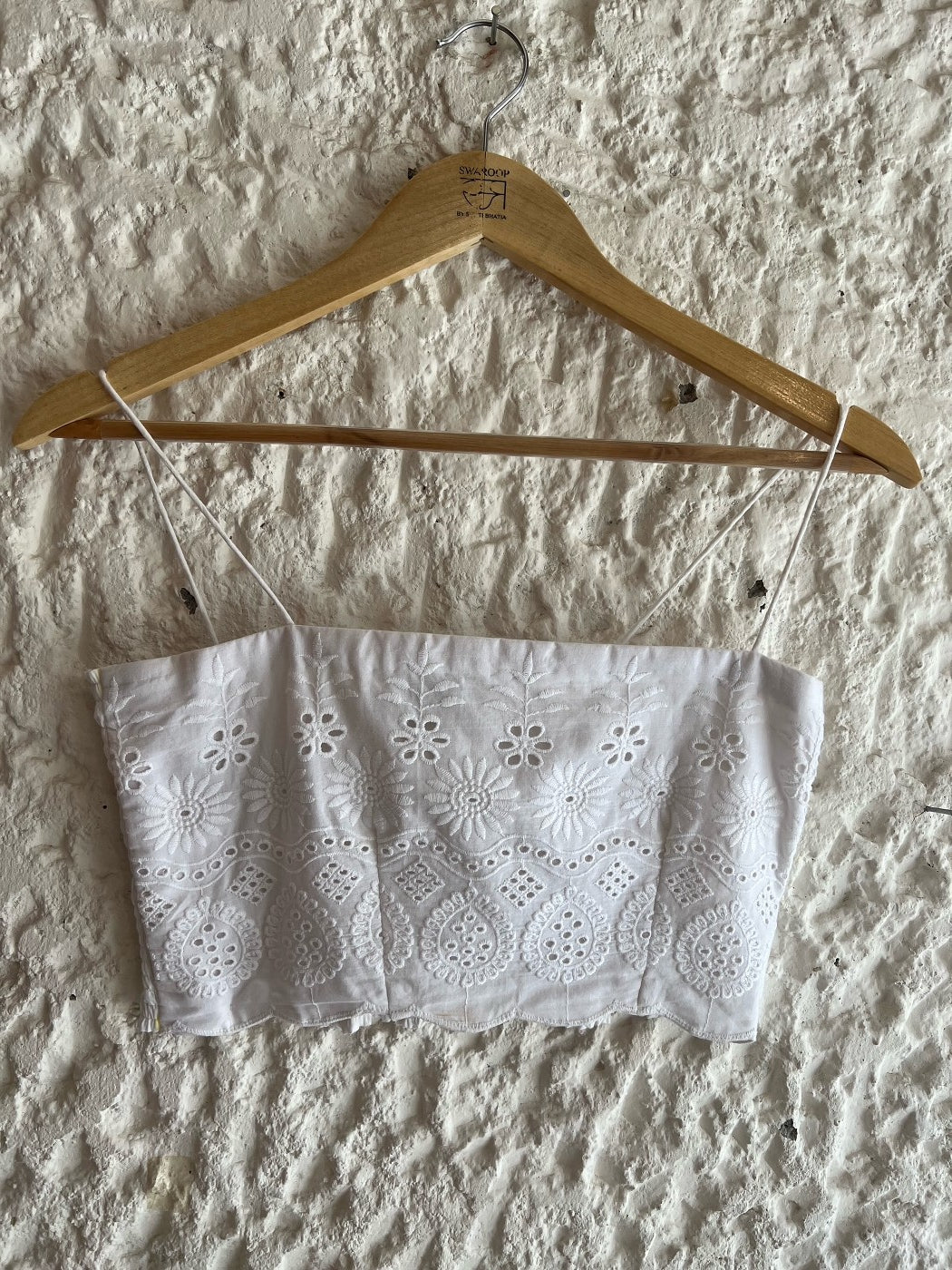 Swaroop Exclusive Design. The Lace Scallop Top is in cotton base. It features spaghetti straps and smocking at the back. Pair it with white jeans and a cross-body bag for a trendy look.