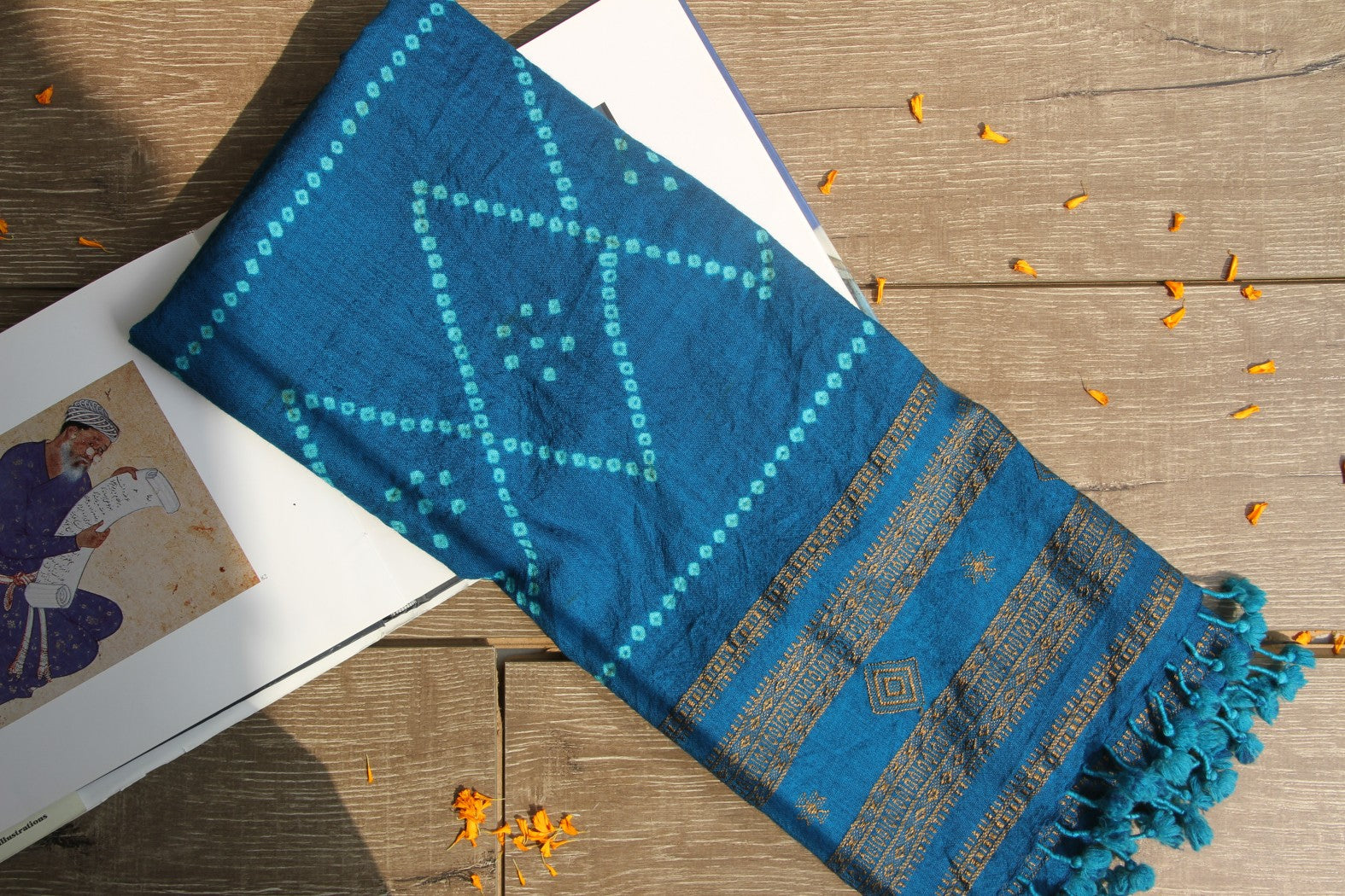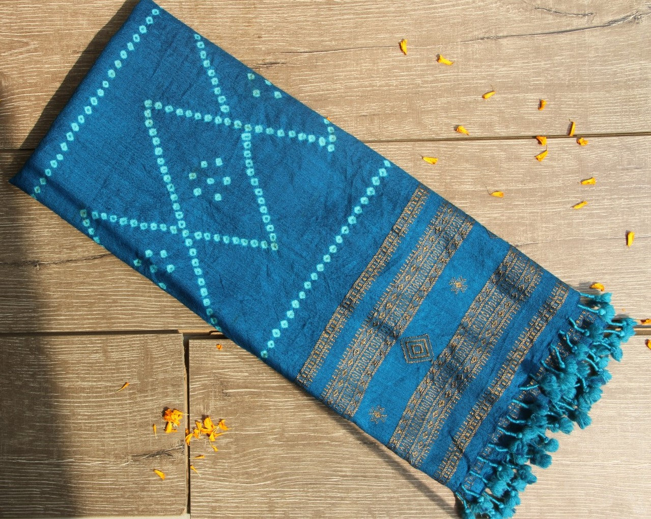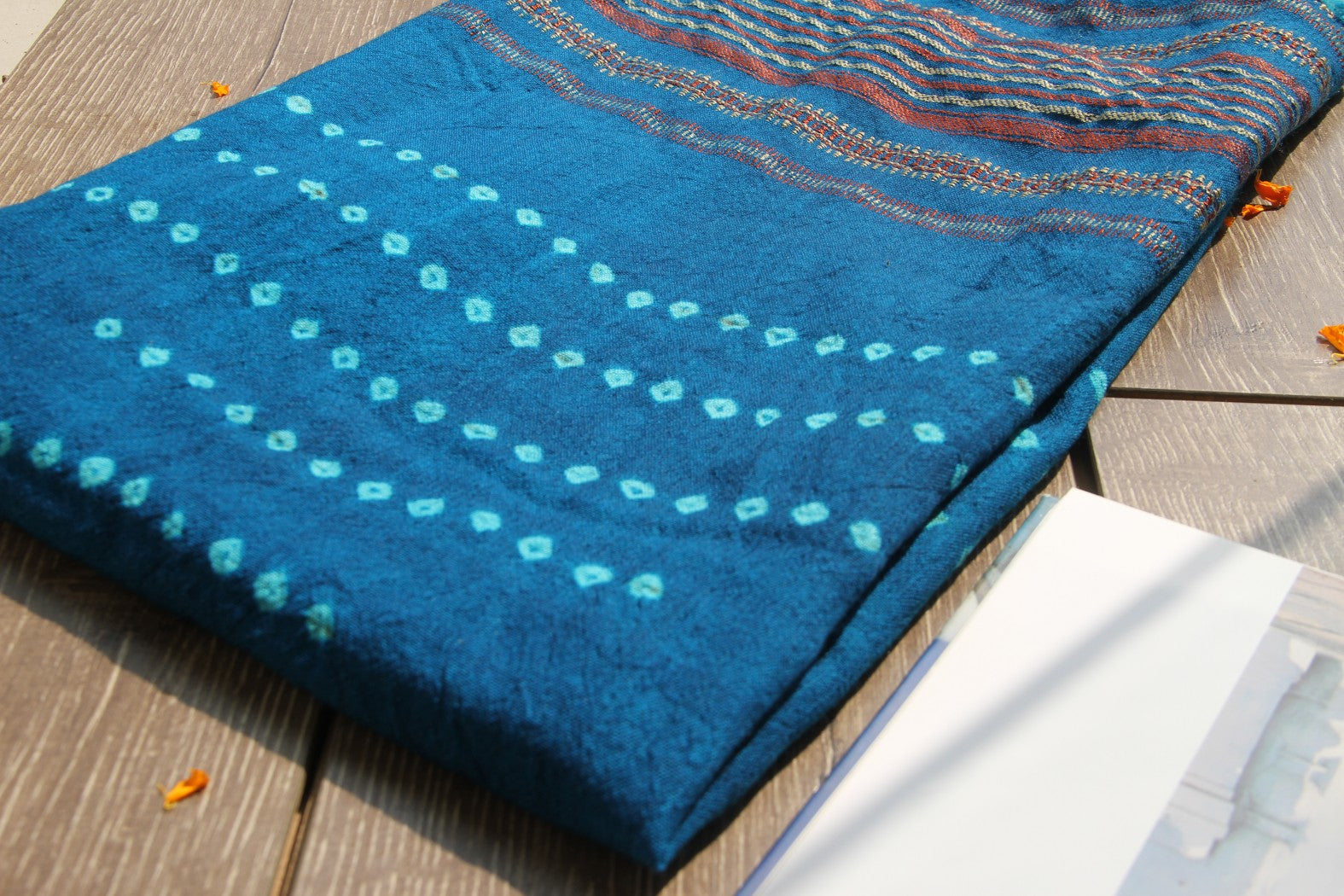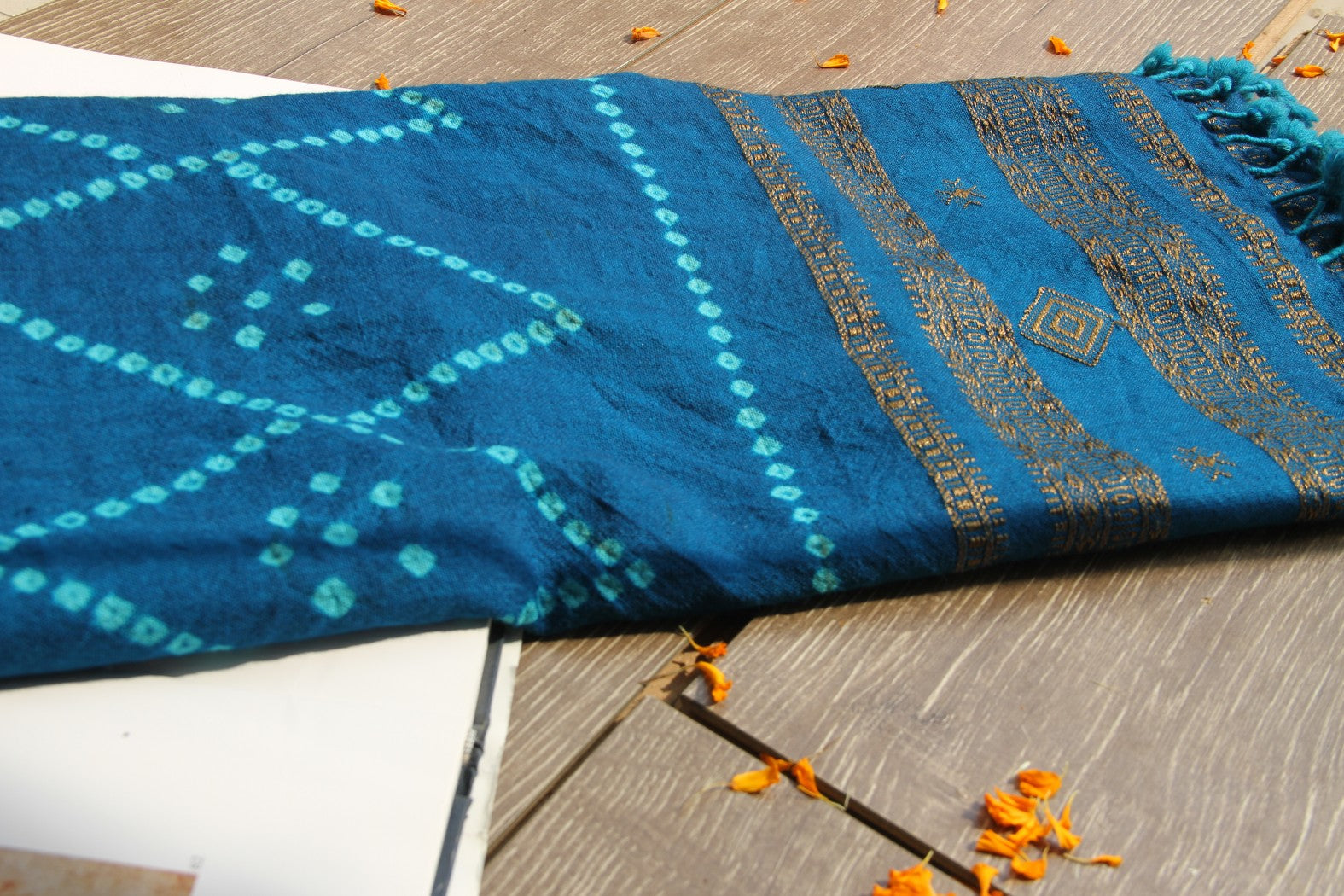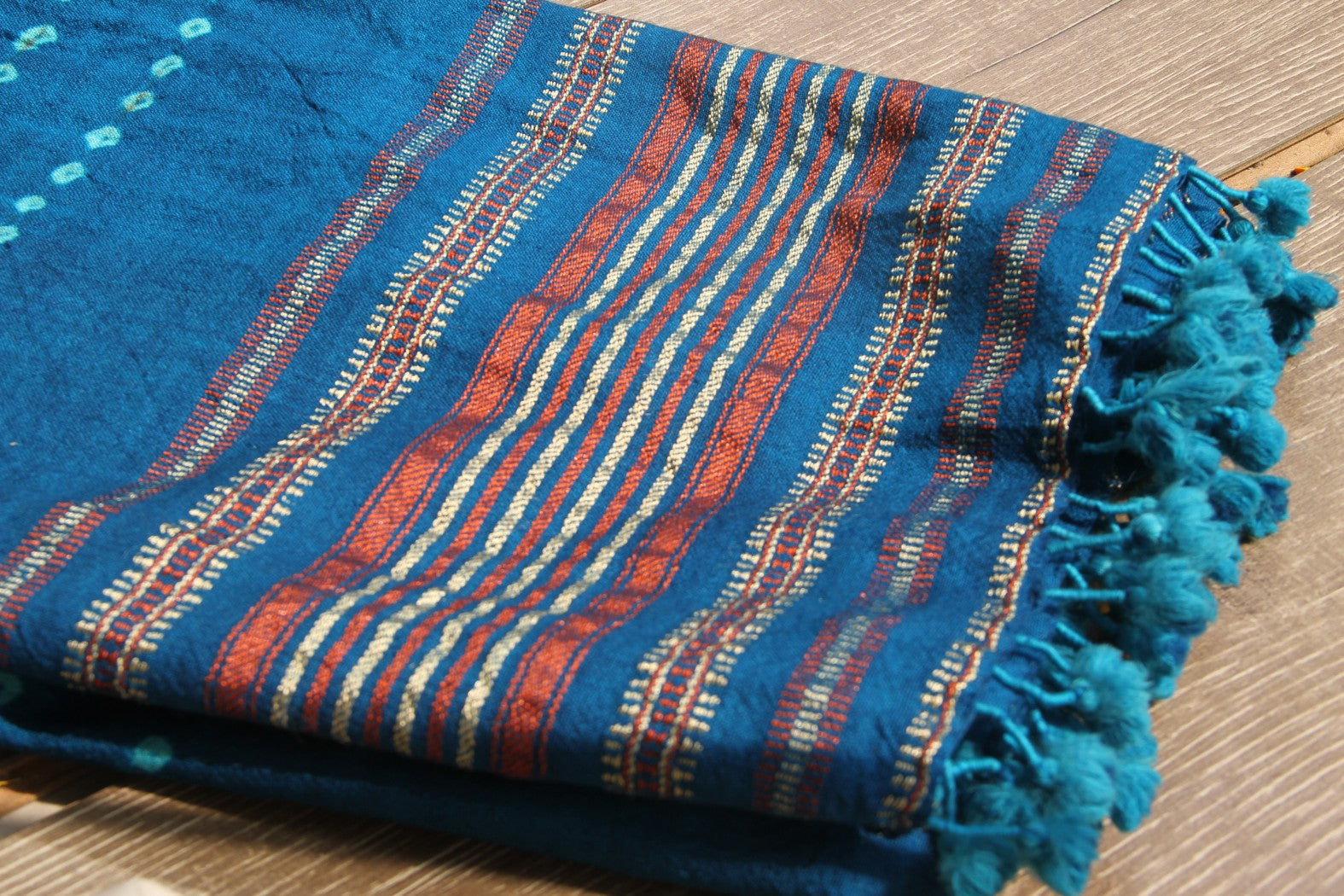 Swaroop Exclusive Design. Handloom Bandhnai stoles in Silk Pure wool base have been hand-woven by the weavers of Bhujodi, Gujarat using their traditional techniques passed down from generation to generation. Adorned with handmade tassels.