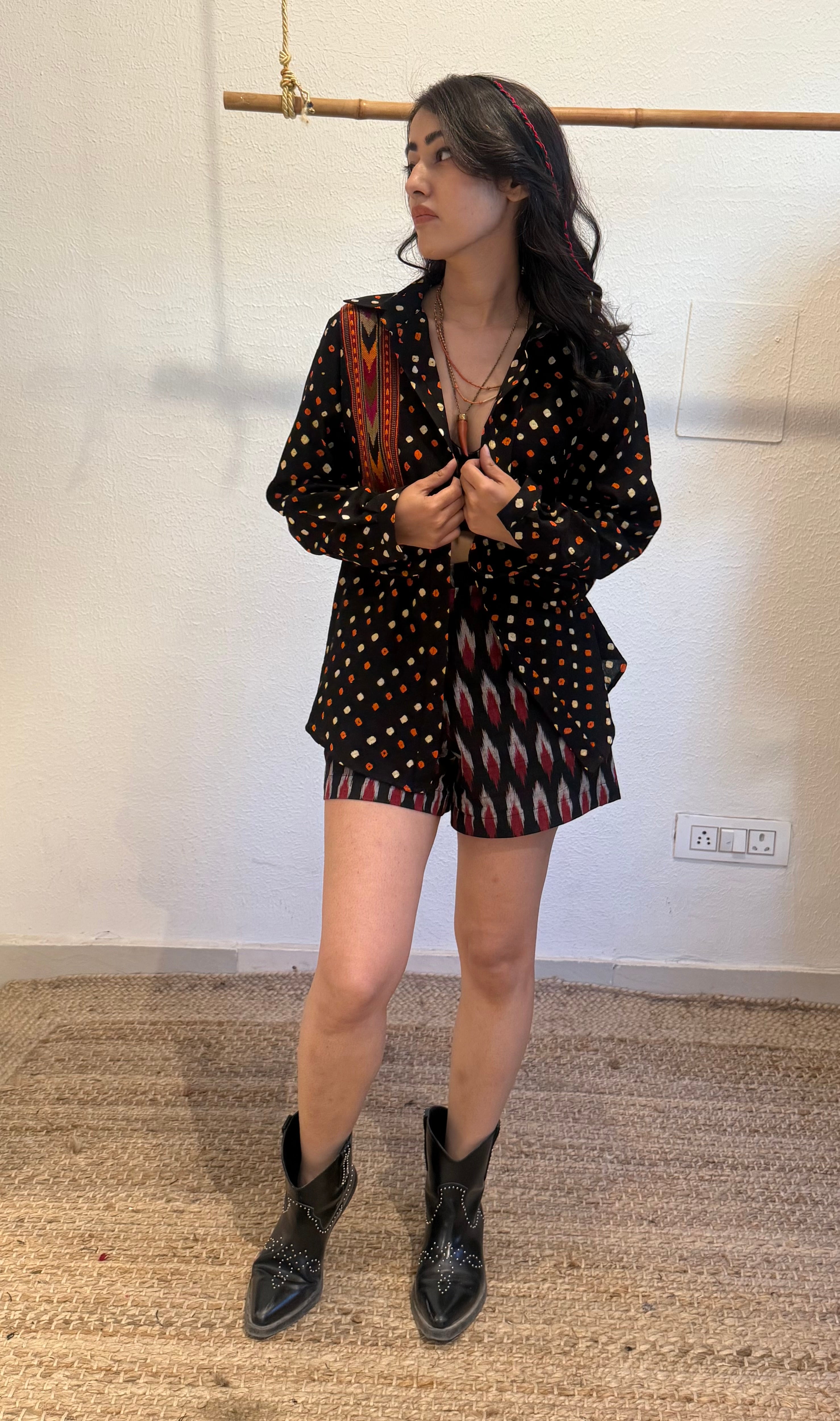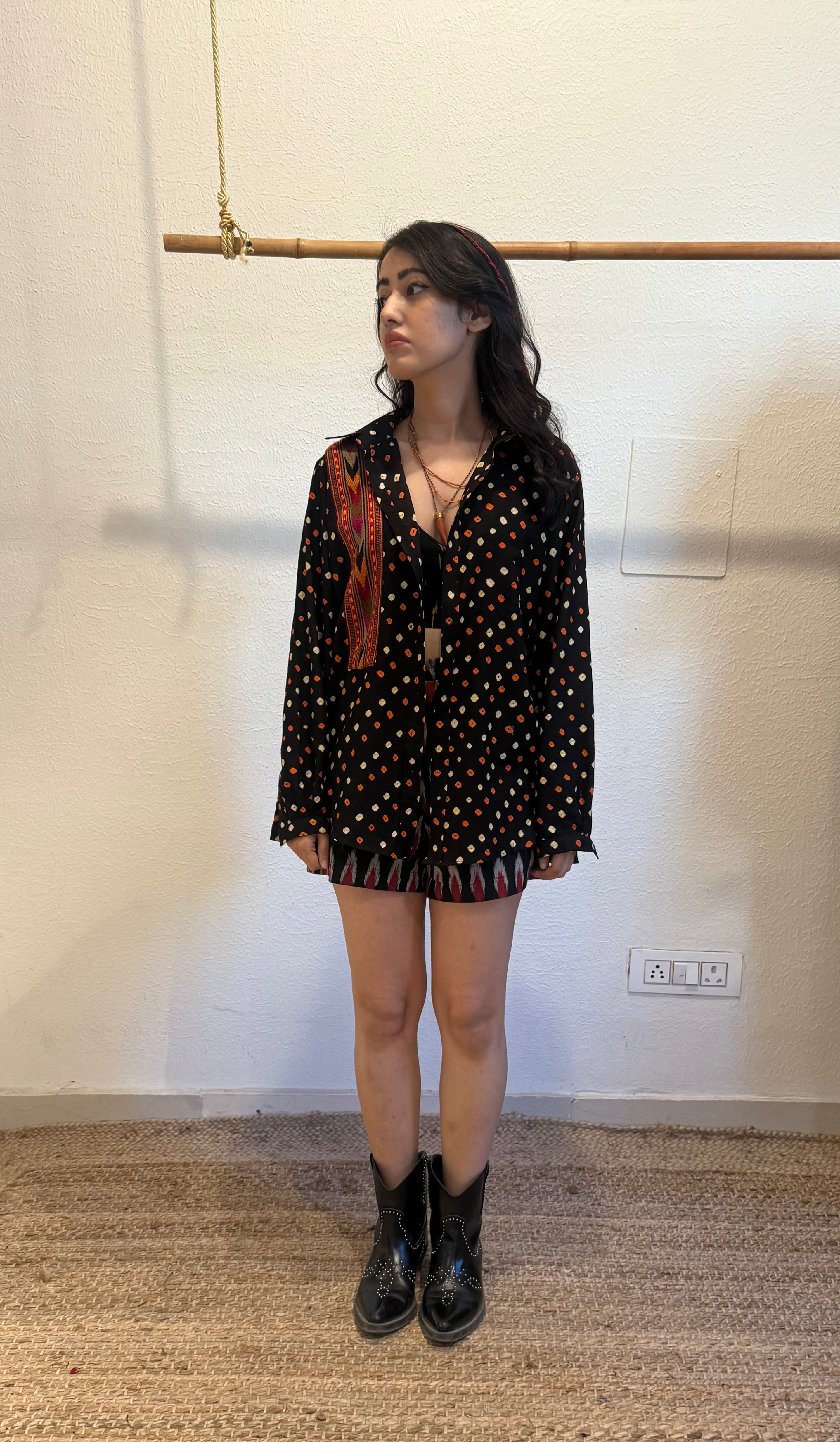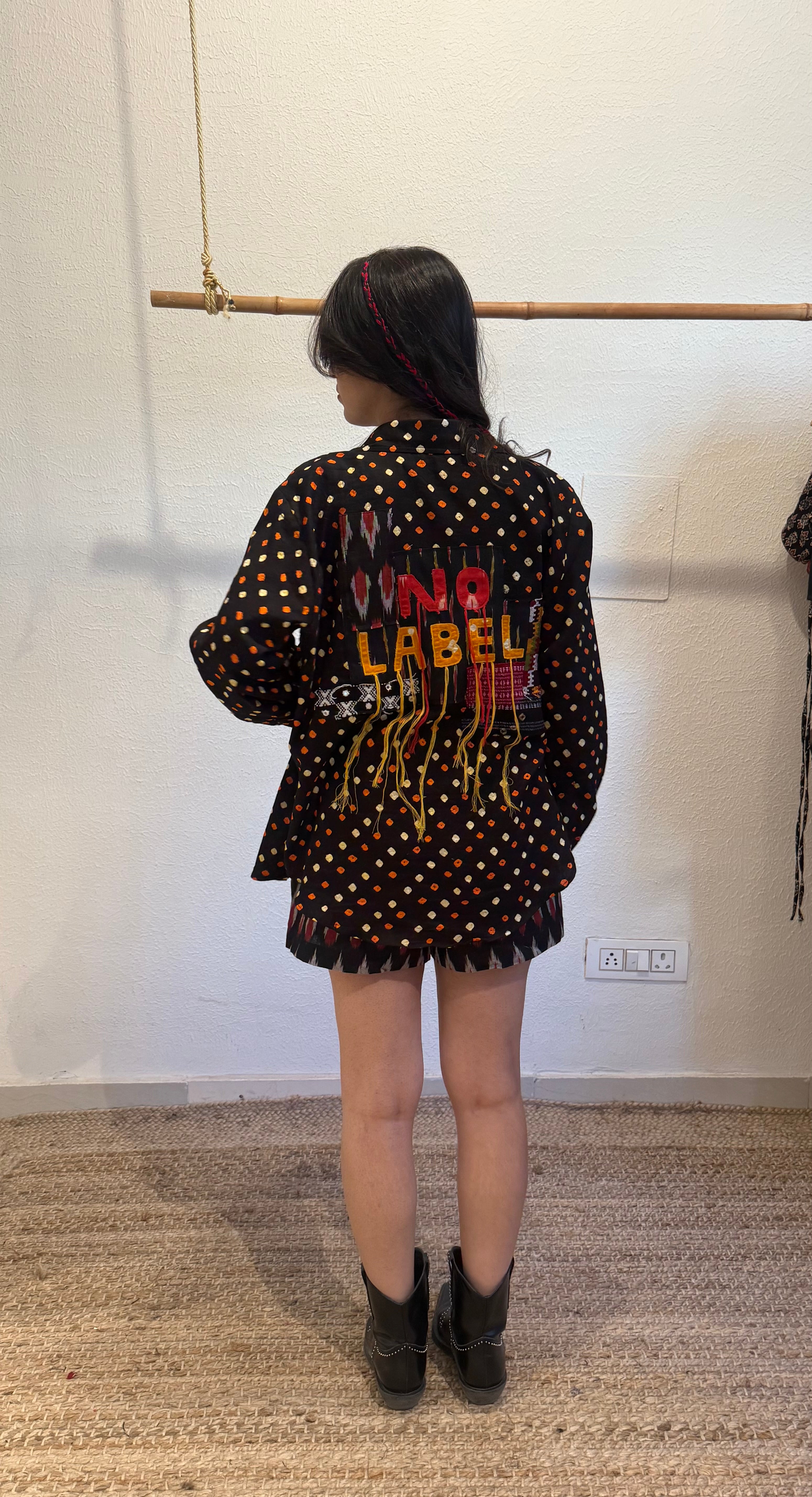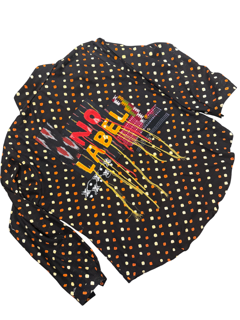 A celebration of Indian craftsmanship, this Bandhani shirt is designed for women who love to experiment and embrace handmade textiles. It features a Kullu patch in the front, while the back showcases a mix of Ikkat and Kutch patches, adding depth and character. The hand-embroidered “No Label” typography makes a bold statement, complemented by delicate tassel hangings for a playful touch.