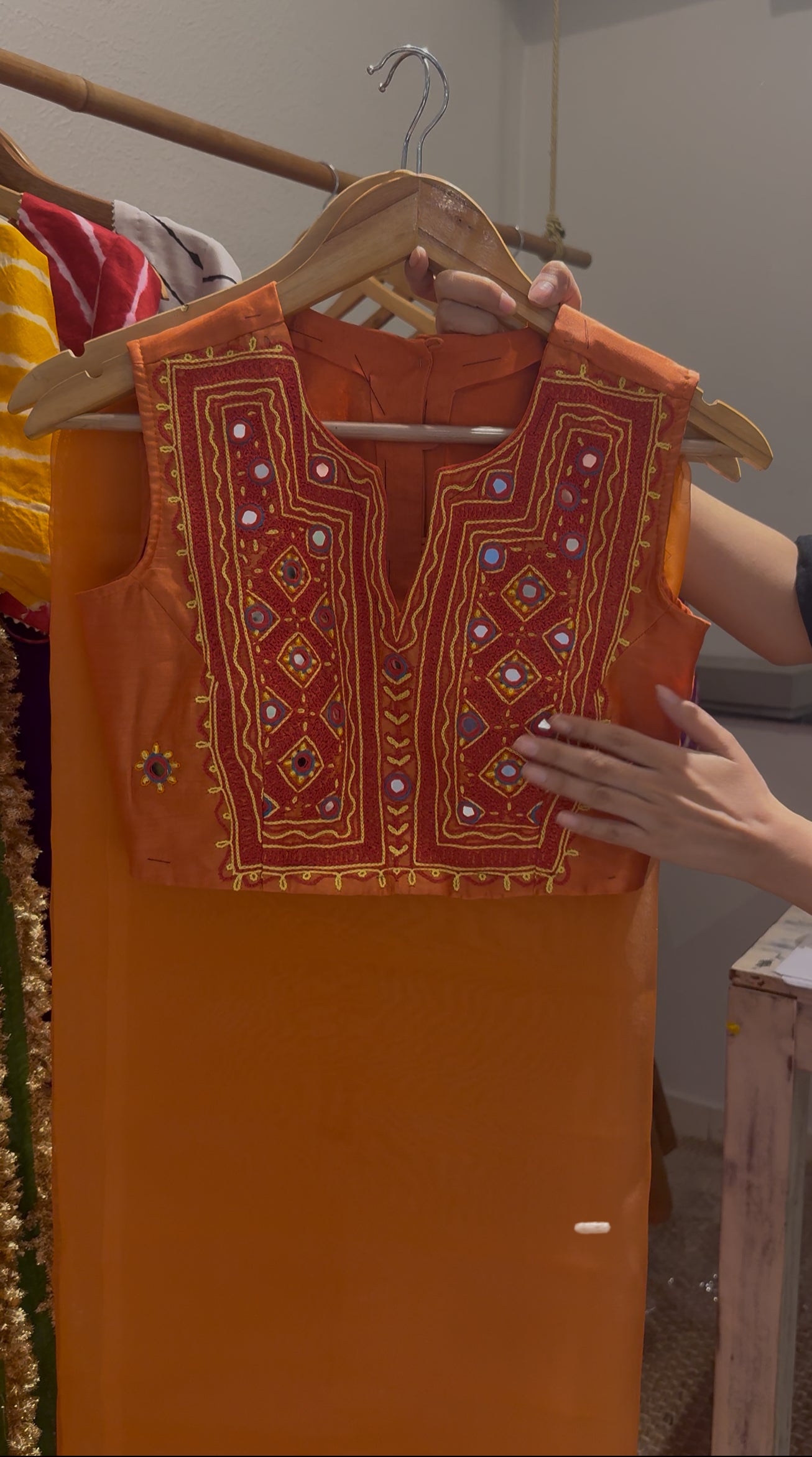 This pure organza saree in a rich hue is perfect for Diwali parties and festive celebrations. Adorned with bandhani facing, it exudes elegance and craftsmanship.