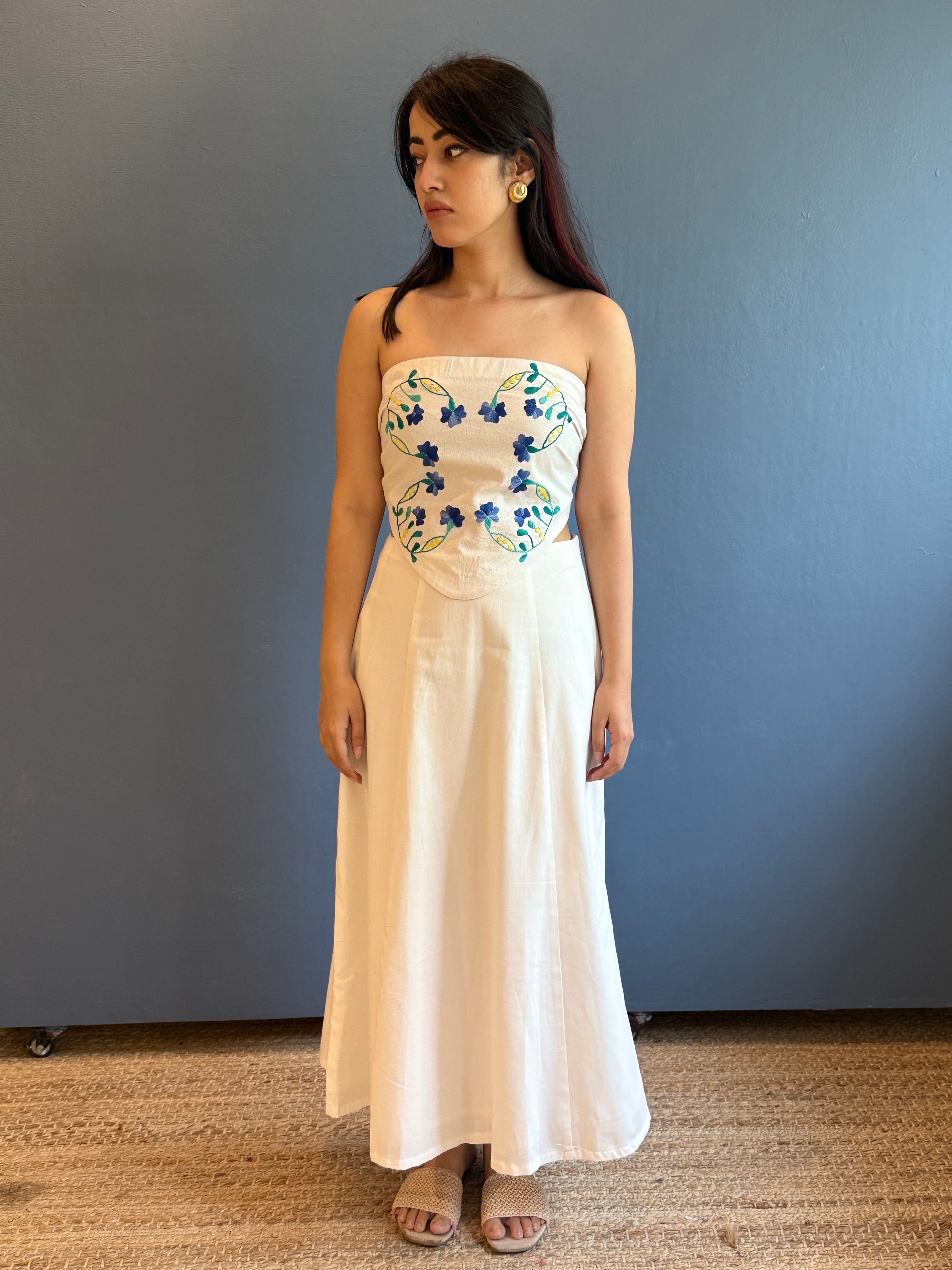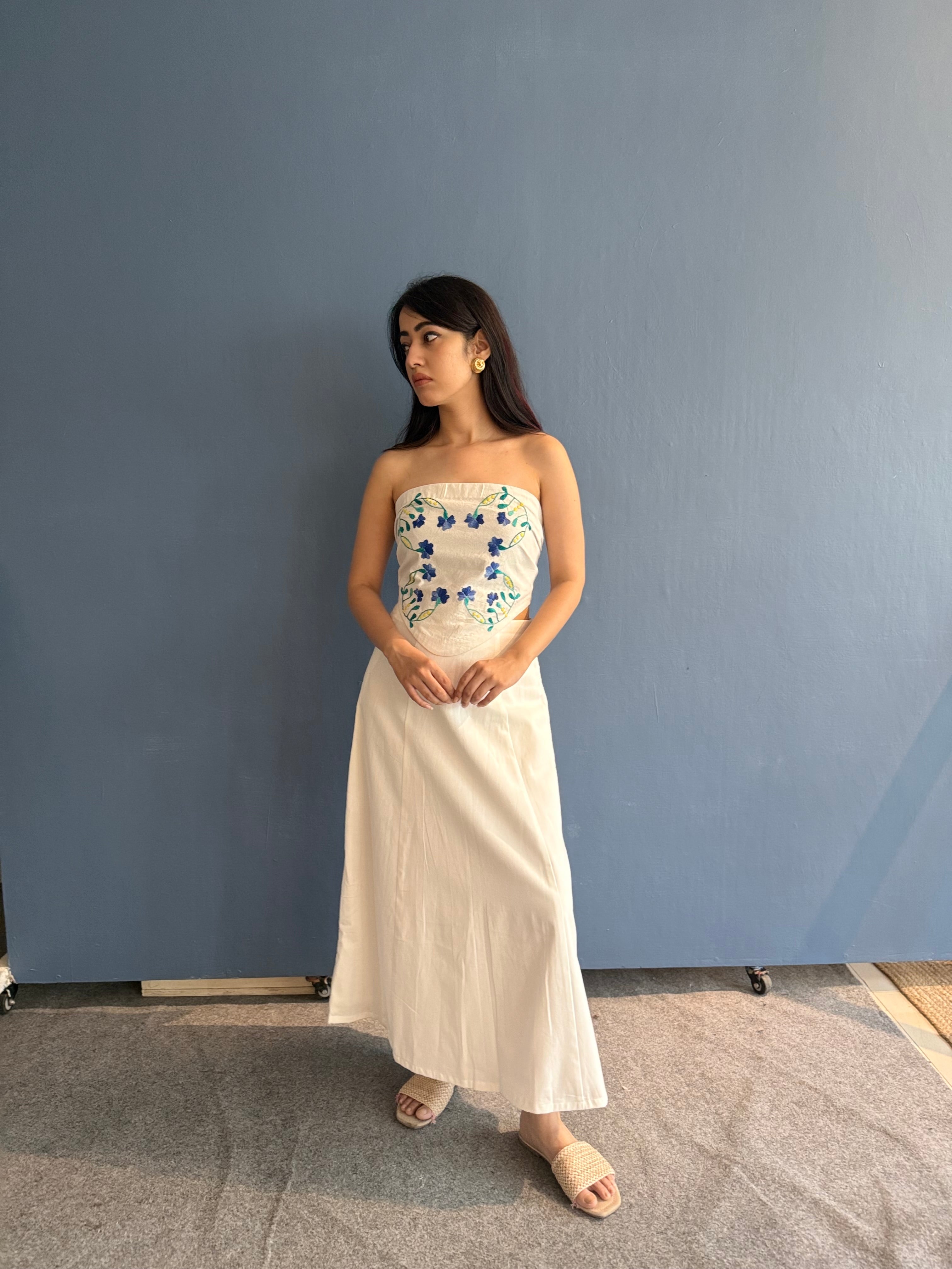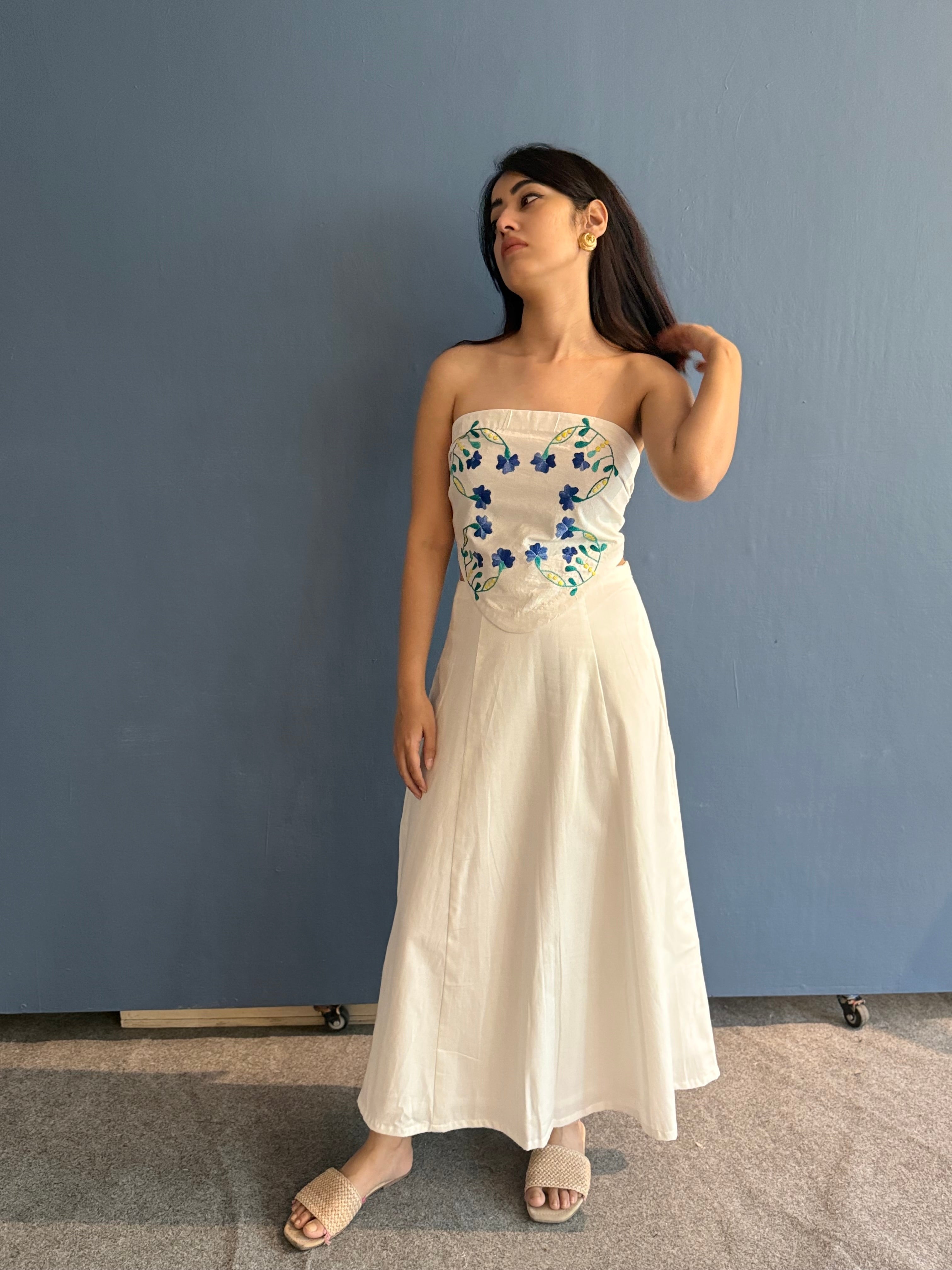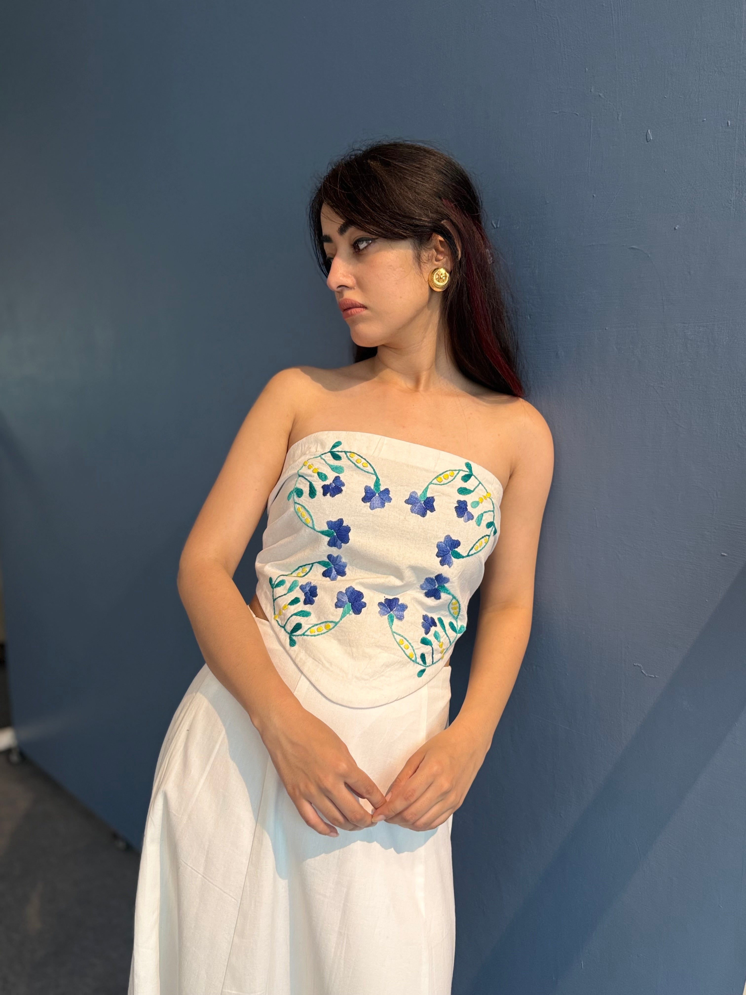 Swaroop Exclusive Design Introducing the Phool Top a strapless silhouette crafted from breathable cotton, perfect for warm days. This top feature delicate hand embroidery with floral-inspired detailing, the smocked back ensures a comfortable and flexible fit, enhancing your silhouette while ensuring all-day comfort.