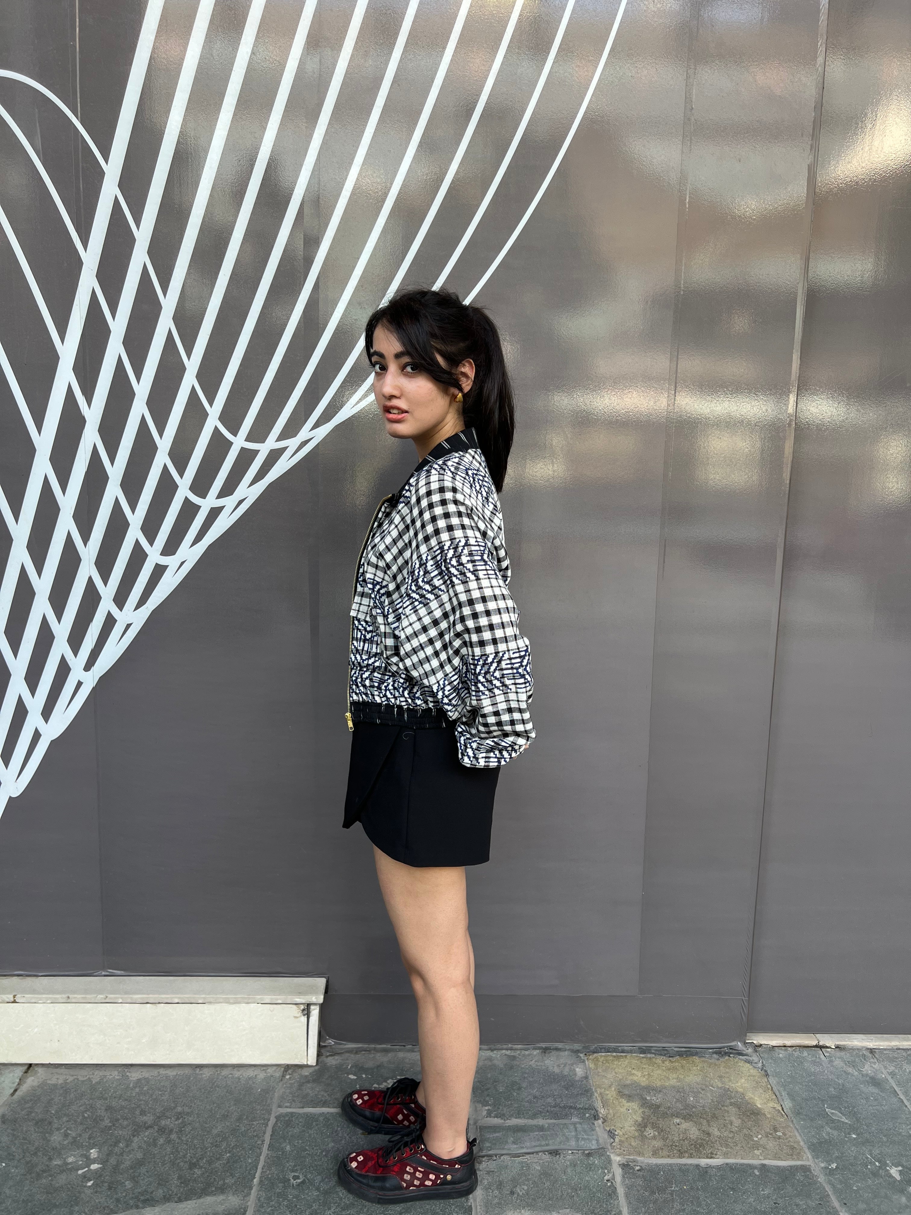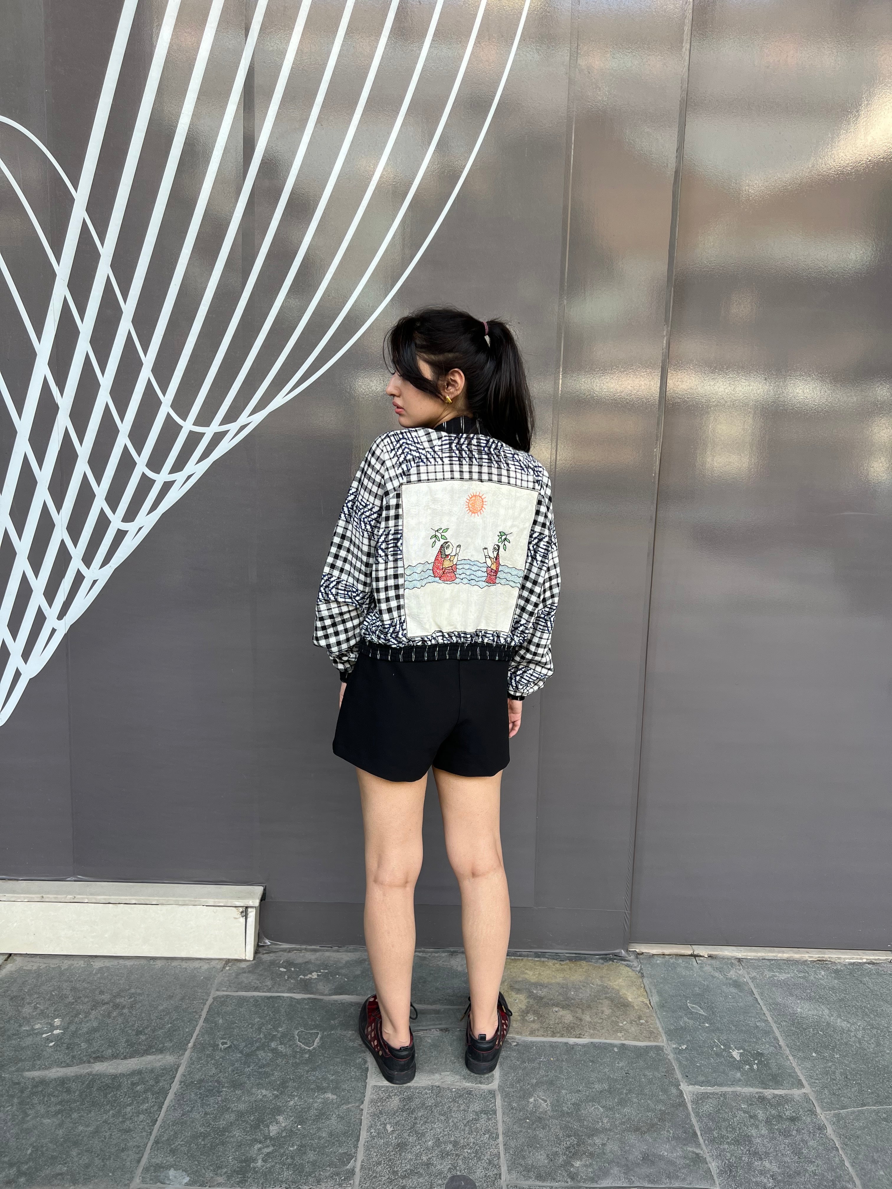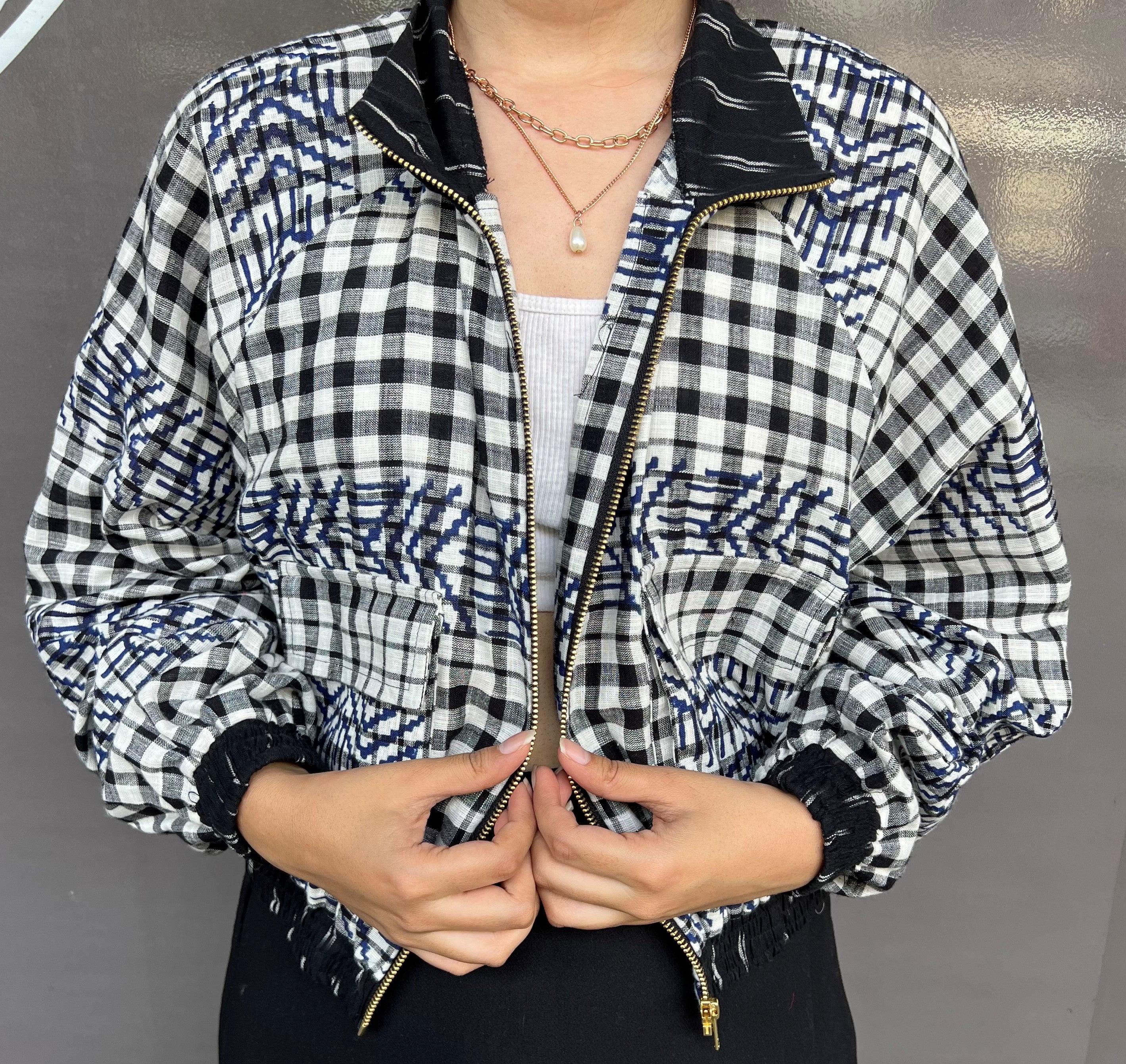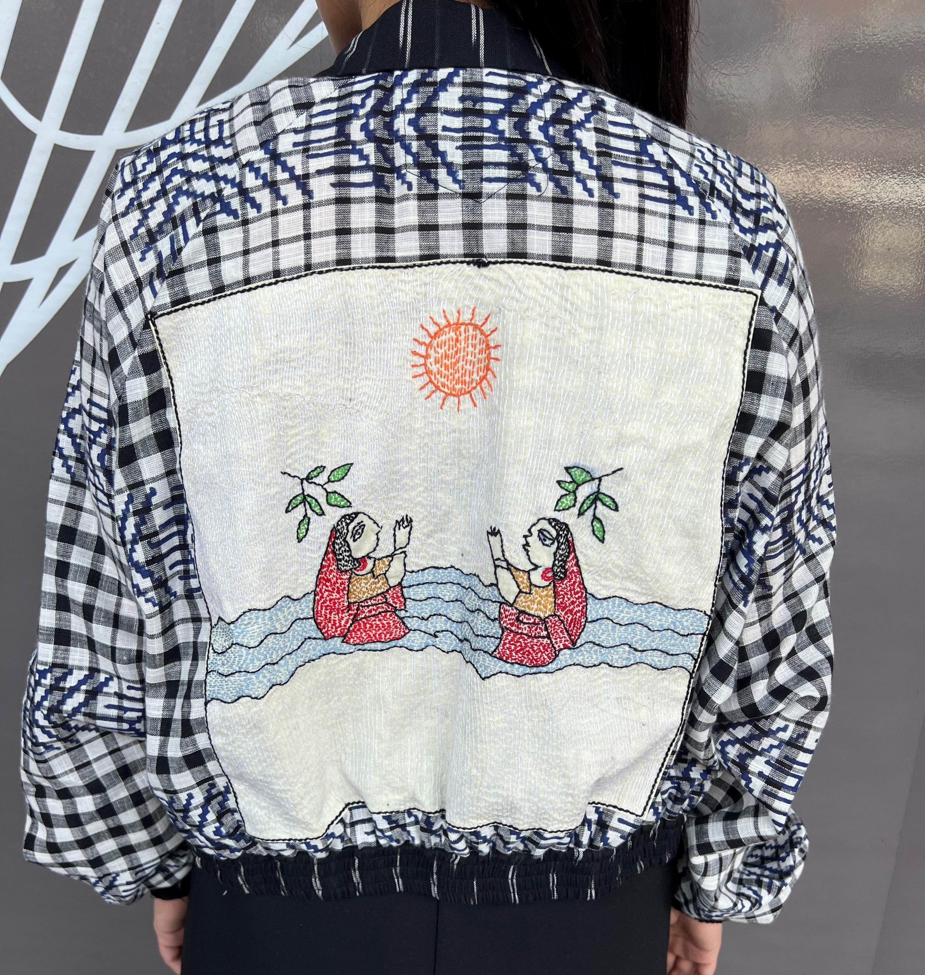 Swaroop Exclusive Design. Featuring a "Sujani Jacket" enhanced with exclusive sujani embroidery at the back. Hand-embroidered by the women artisans of Bihar. Crafted in check cotton fabric and has flap pockets in the front.