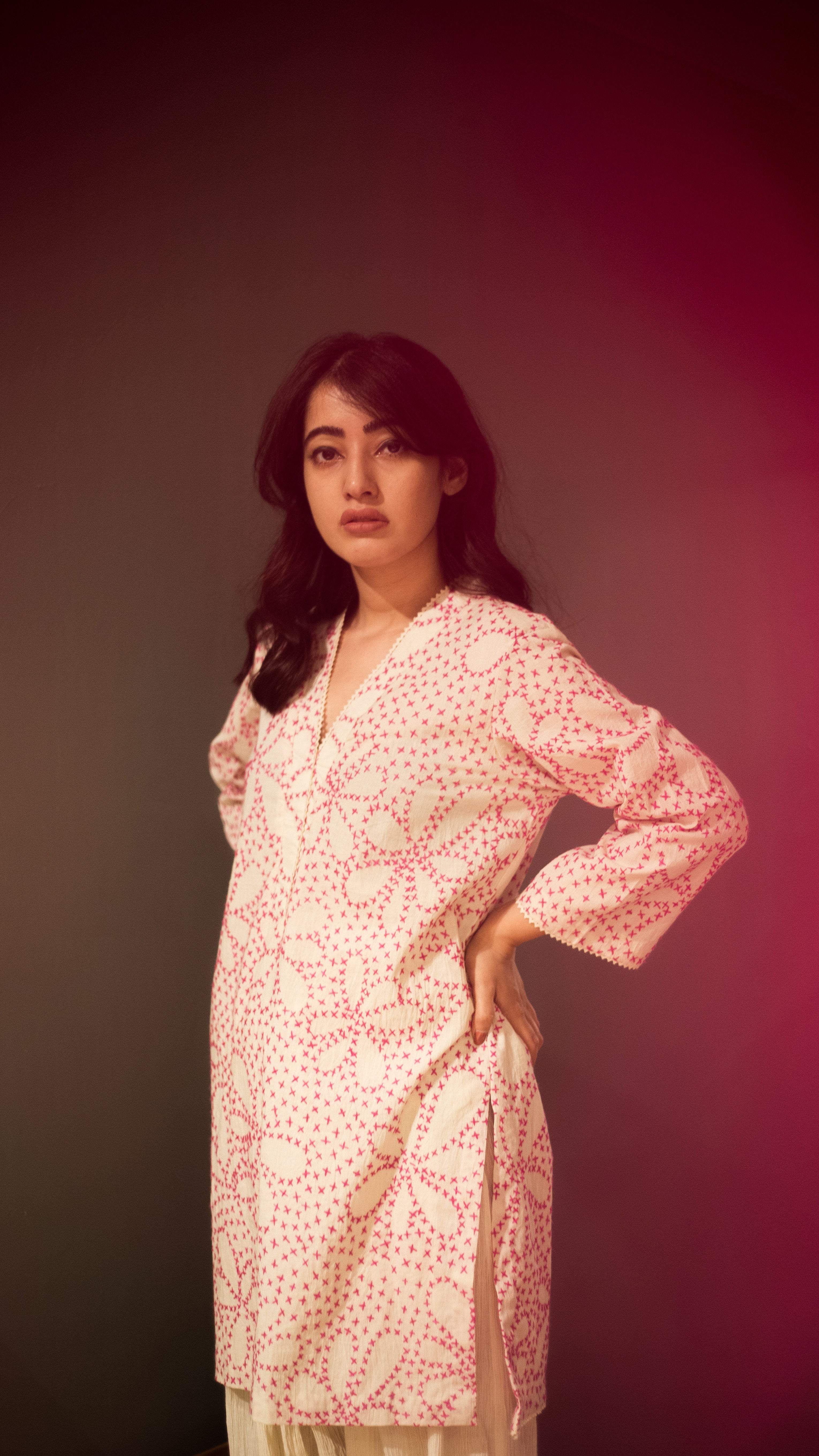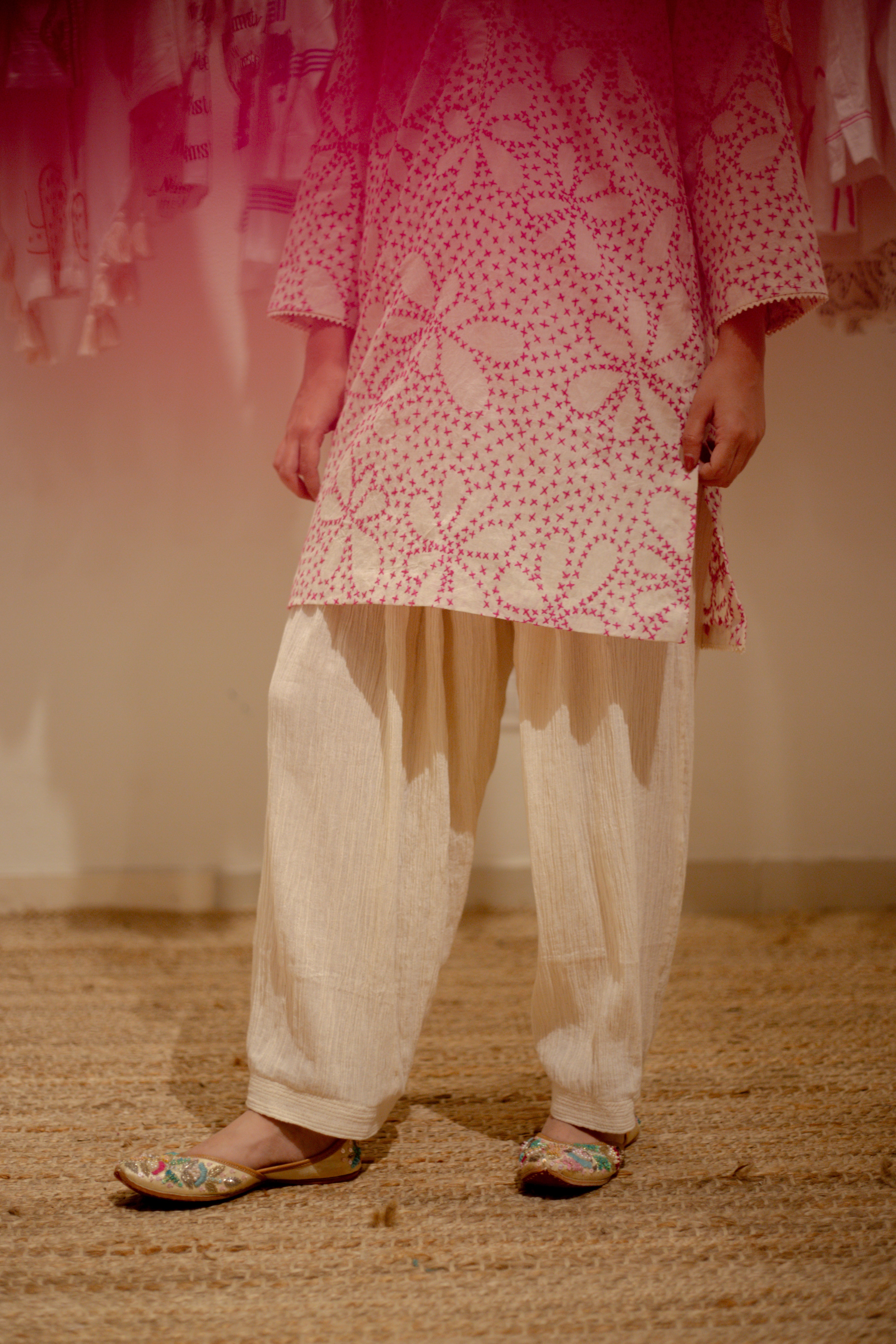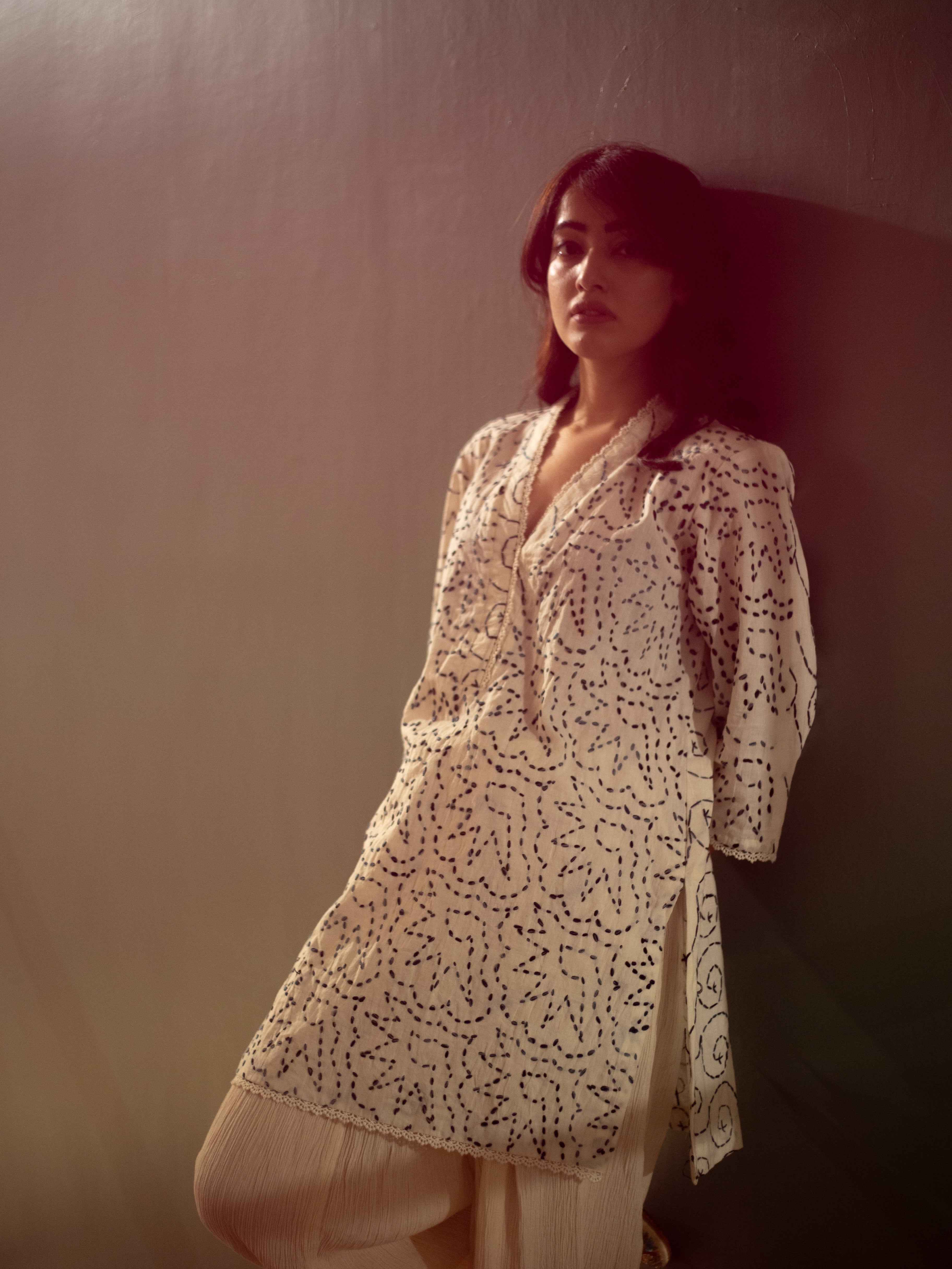 This refined ensemble features a cotton kurta with a V-neck and delicate lace detailing, paired with a semi-Patiala salwar adorned with a traditional poncha design and an adjustable drawstring waist.