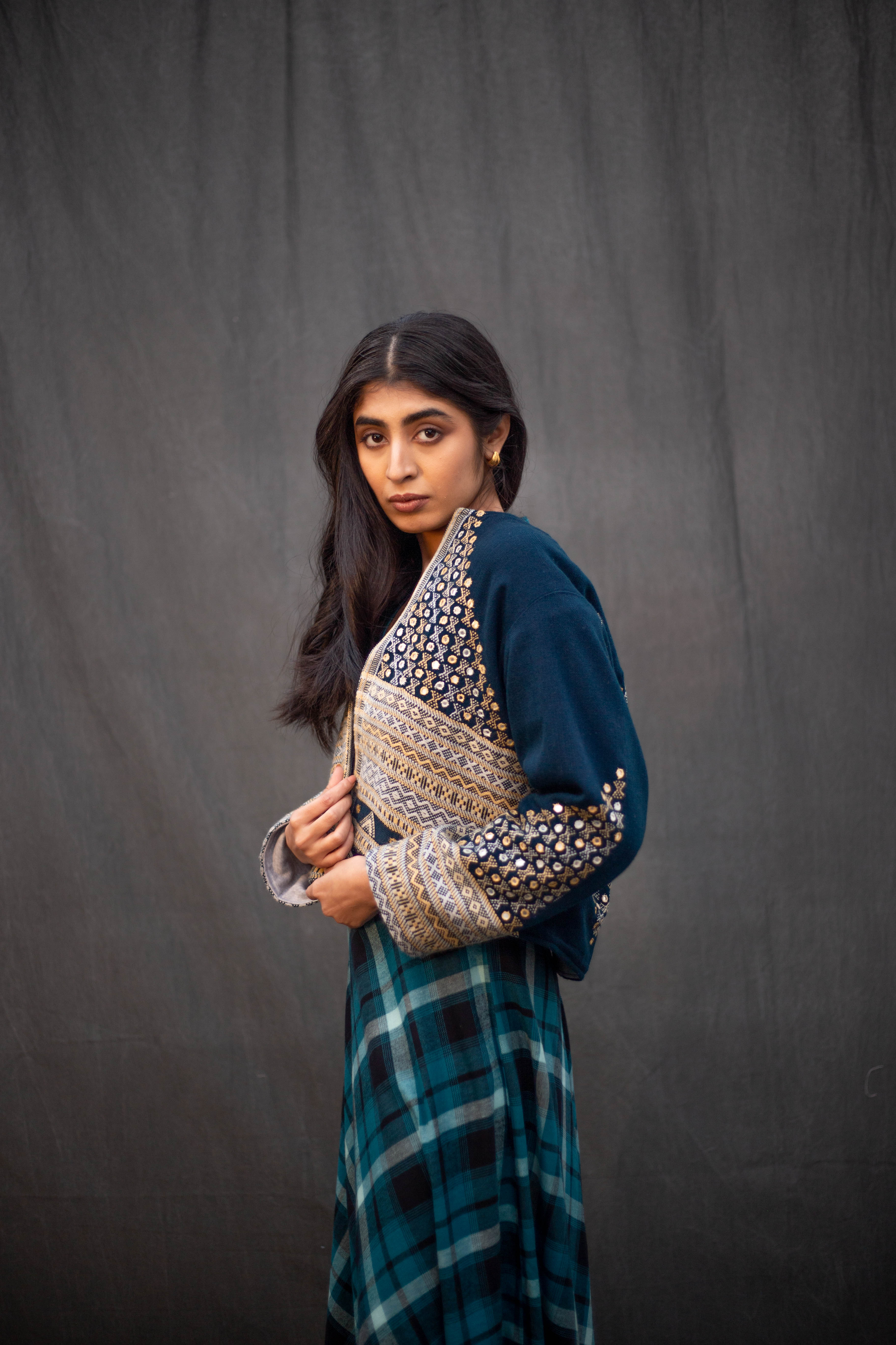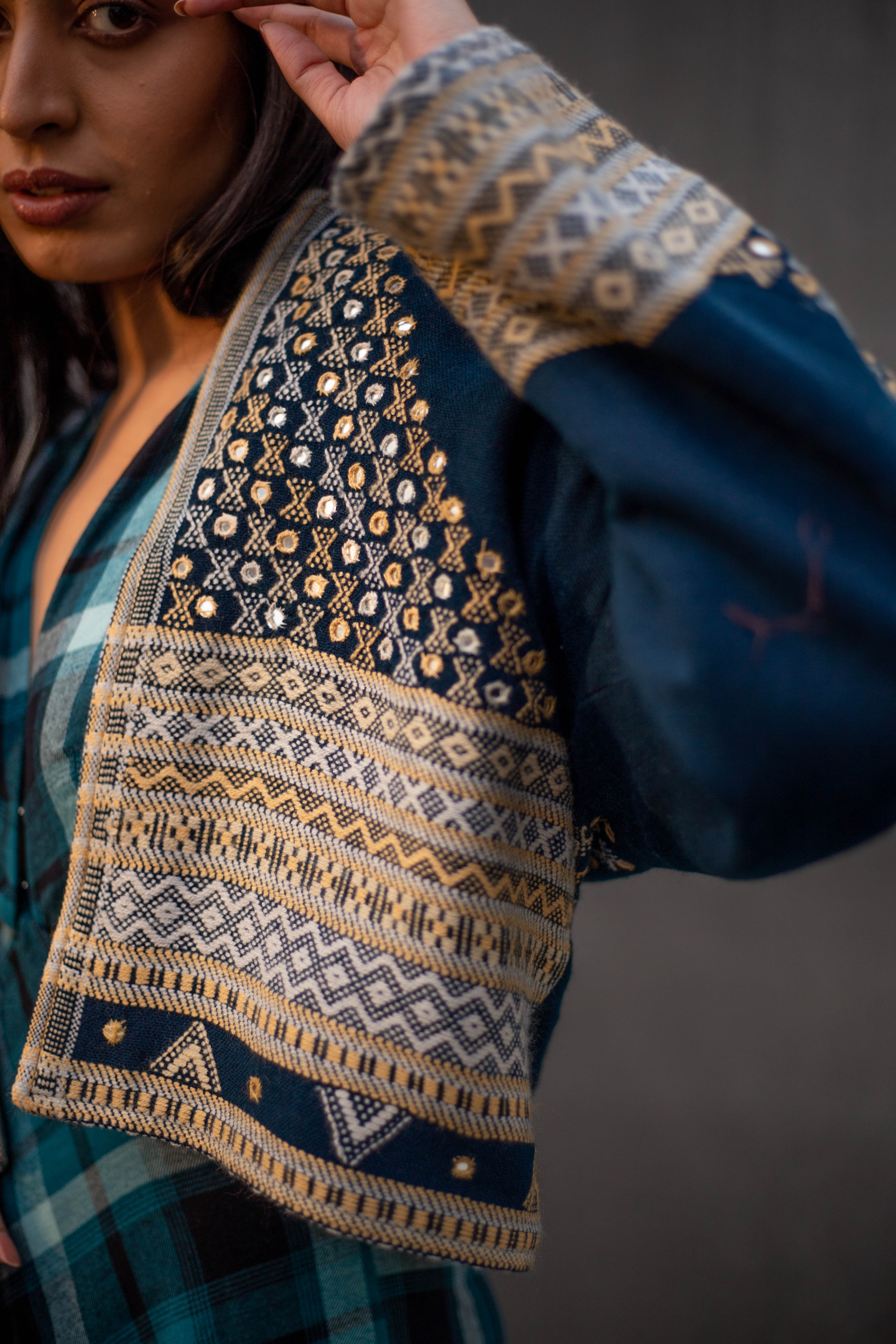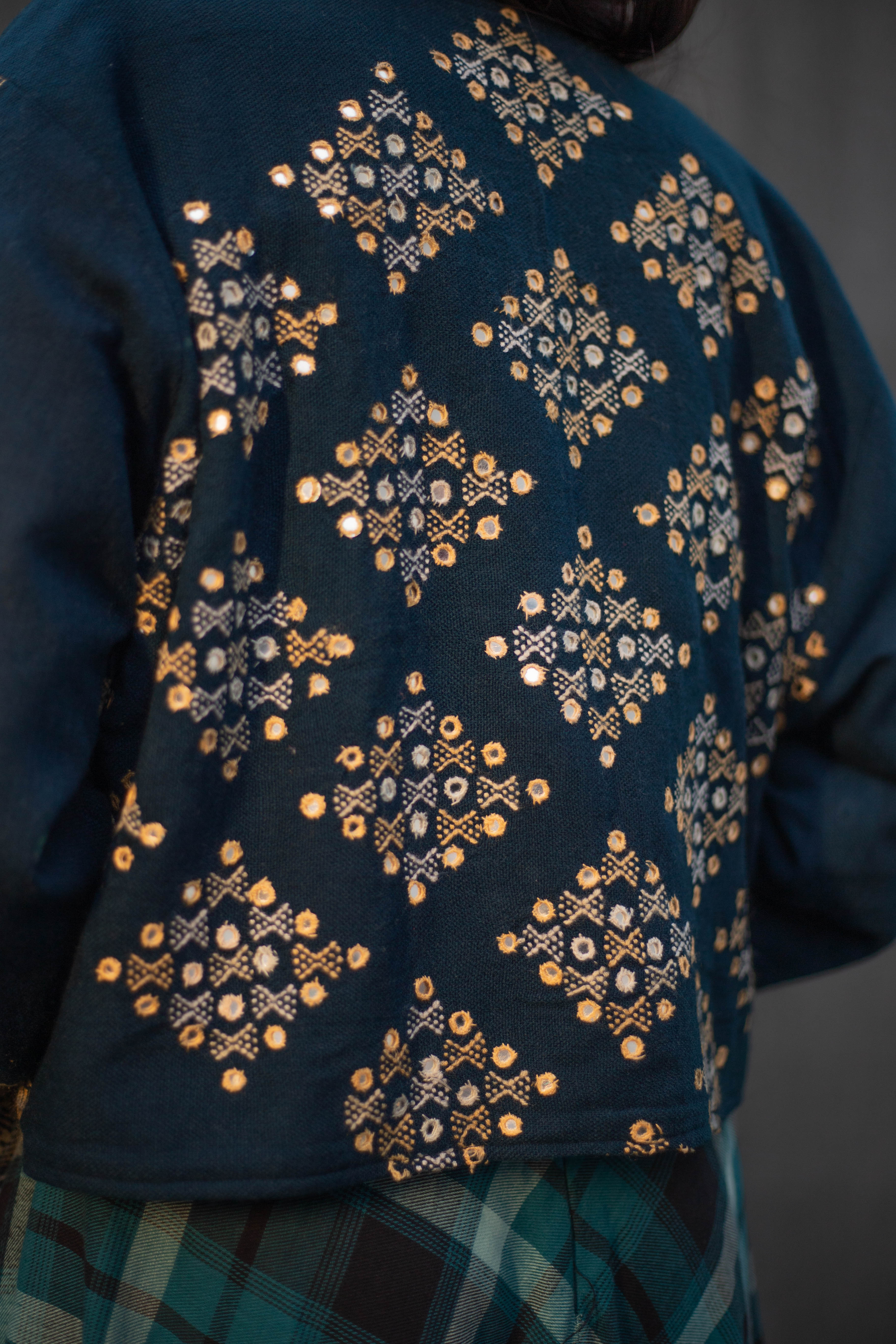 Swaroop Exclusive Design. “Teal shesha jacket ” is a marriage between Indian textile and modern silhouette. The fabric of the jacket is handcrafted by weavers of Bhujodi, Gujarat using traditional techniques passed down from generation to generation. Its front panel is embellished with mirror work and the design is elevated by fleece lining to keep you warm.