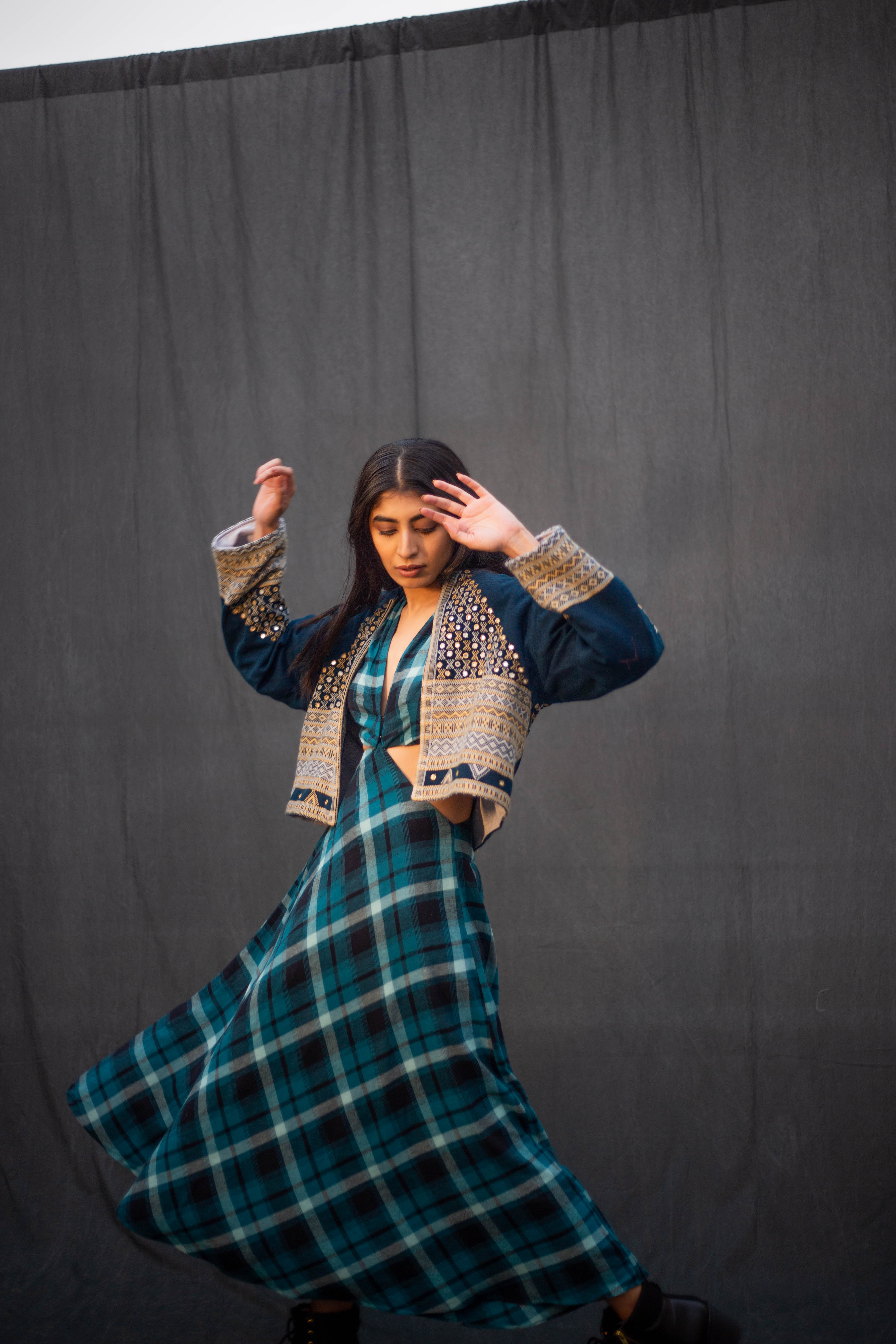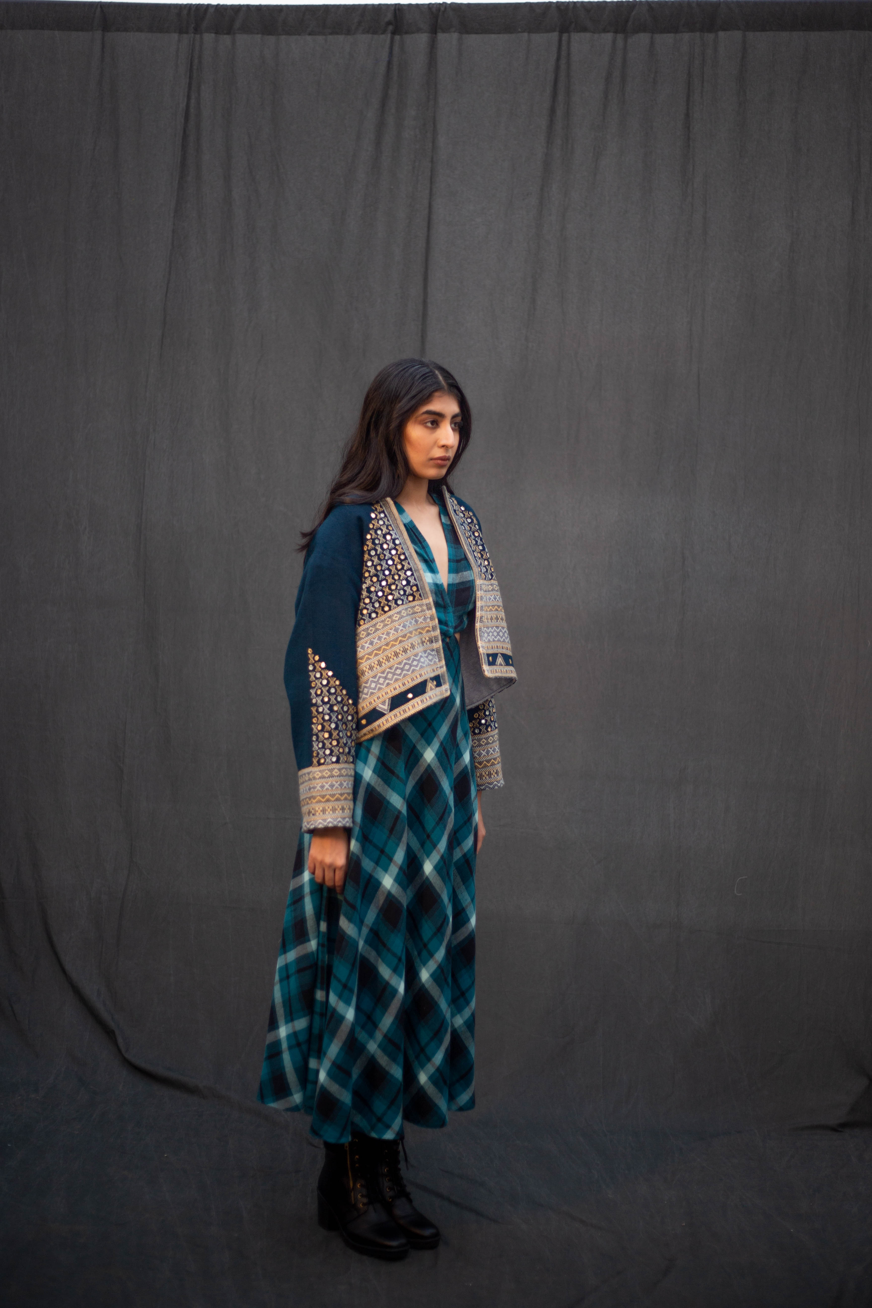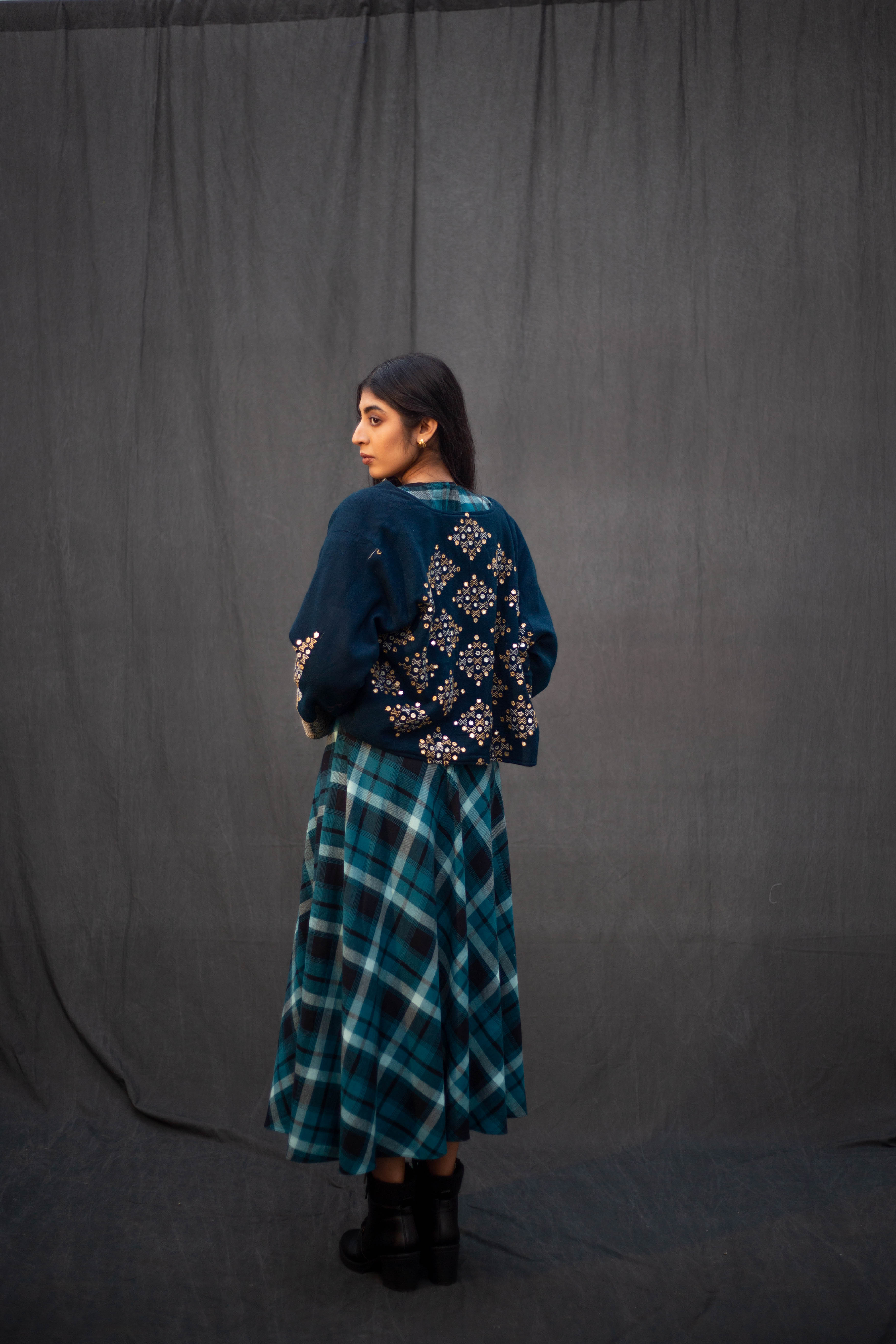 Swaroop Exclusive Design. “Teal shesha jacket ” is a marriage between Indian textile and modern silhouette. The fabric of the jacket is handcrafted by weavers of Bhujodi, Gujarat using traditional techniques passed down from generation to generation. Its front panel is embellished with mirror work and the design is elevated by fleece lining to keep you warm.