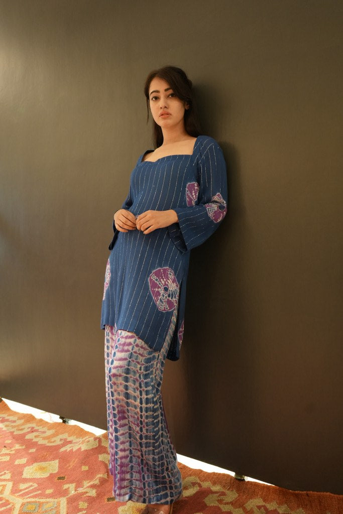 Swaroop Exclusive Design. The Tie & dye suit set is perfect for festive wear to daily wear in modern contemporary style. A perfect pick for this season. The two-piece set-in cotton fabric is elevated with Tie & dye. The set features a chic, straight short kurta with a broad neckline and full bell sleeves, giving it a flowy, relaxed feel. Paired with matching tie & dye bellbottom pants, the look is both bold and timeless. this suit set is a versatile and stylish choice for any occasion.