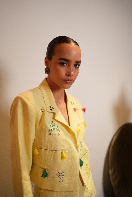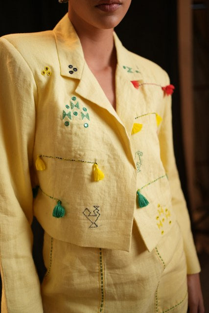 Swaroop Exclusive Design. Introducing Rangrez Crop Blazer, crafted for those with an experimental style. Adorned with mirror work, kantha stitches, and tassel embroidery on both the front and back panels, this piece features a notched lapel collar and long sleeves in viscose linen fabric.
