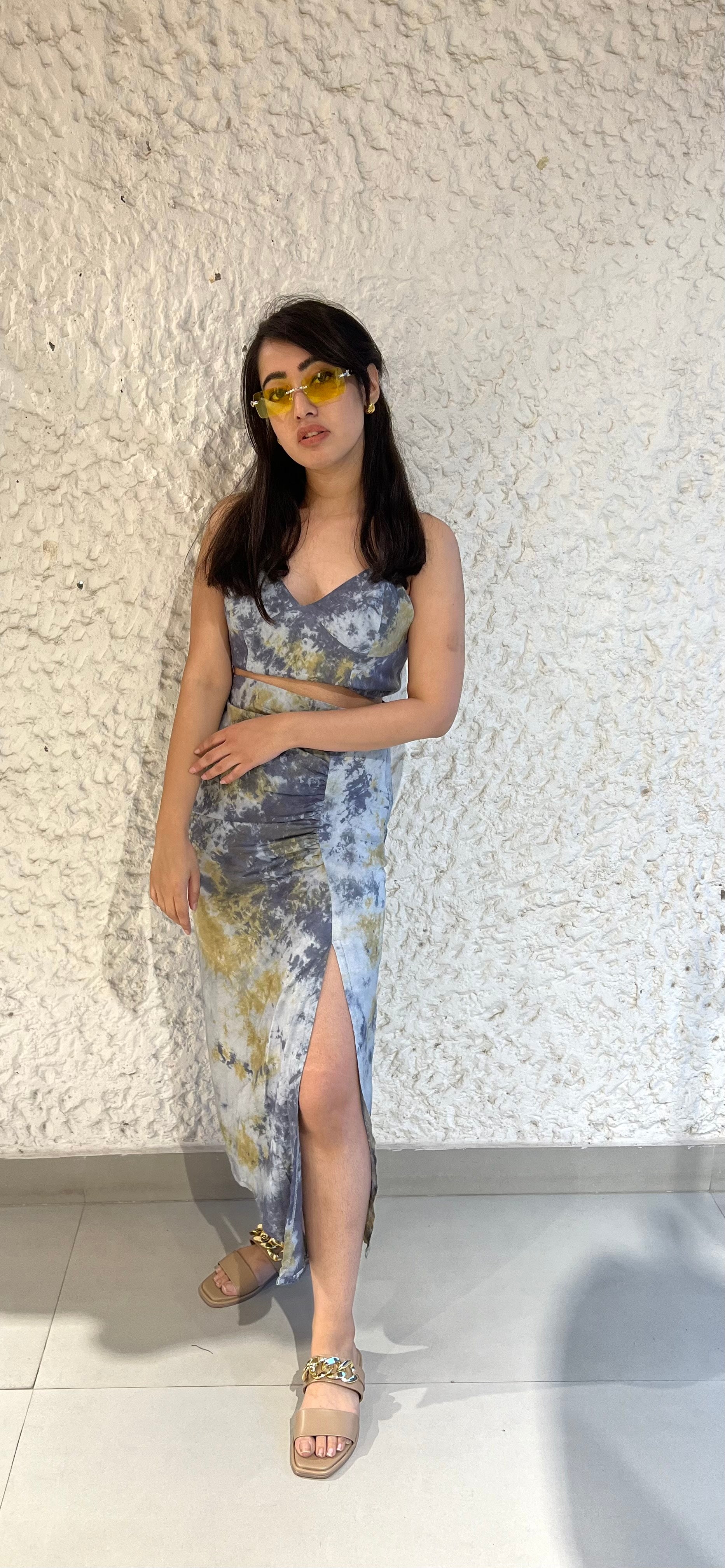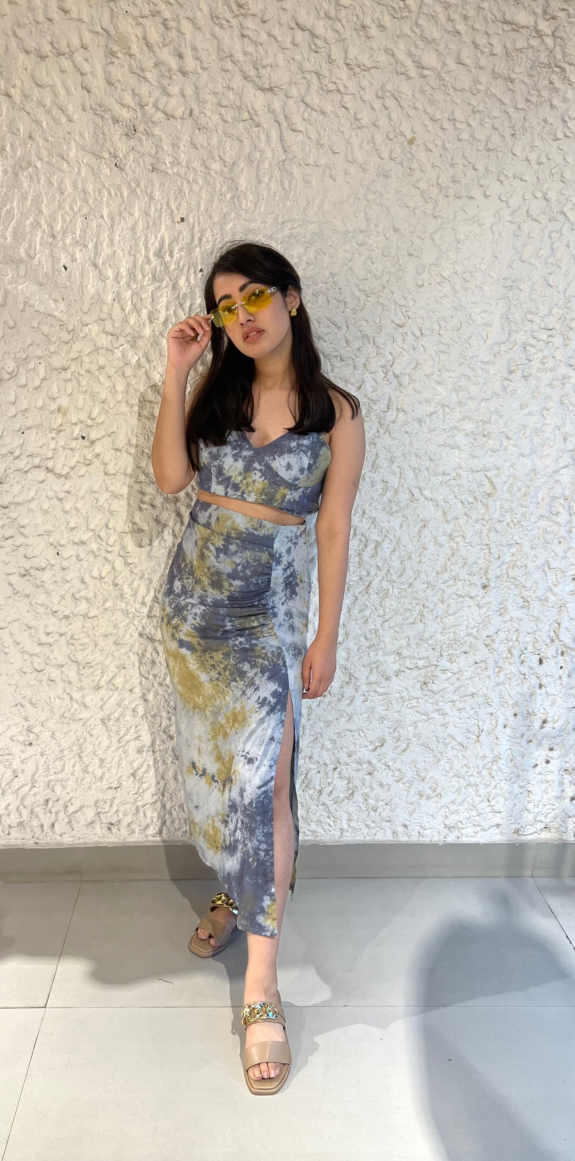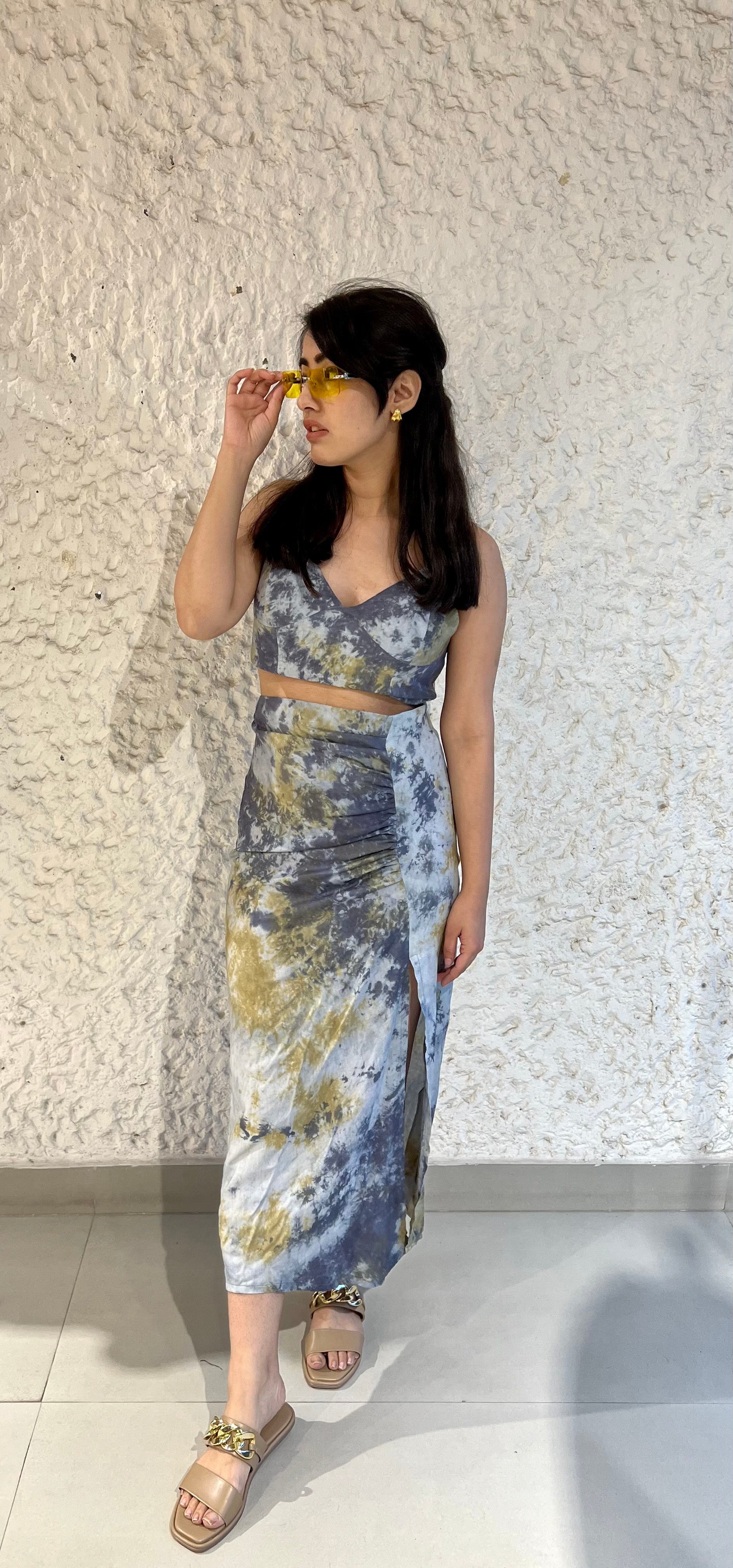 Swaroop Exclusive Design. Freshen up your spring summer style with the tie-ye co-ord set. This elevated set features a fitted crop top with a ruched skirt. Flawless fit making it a perfect attire for brunch.