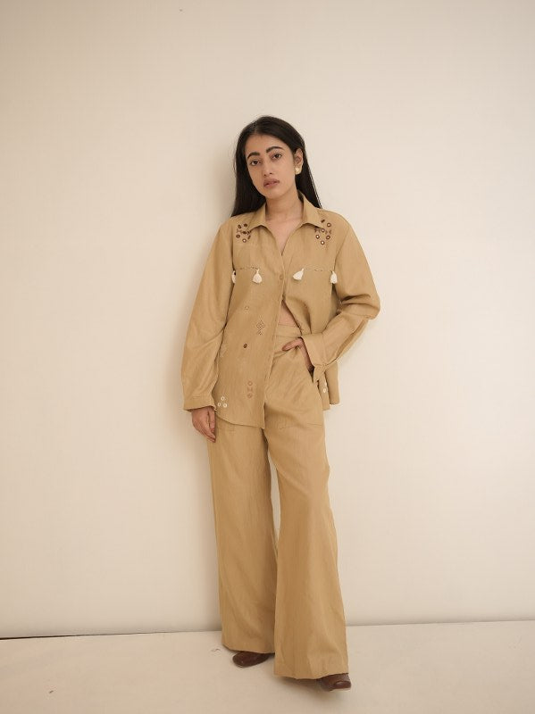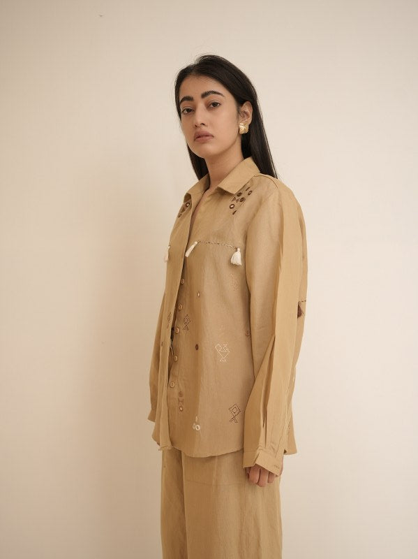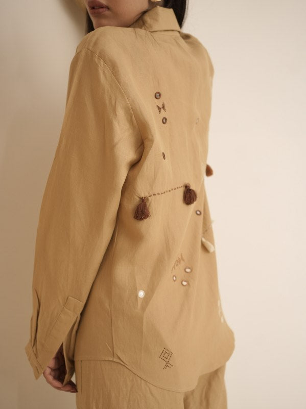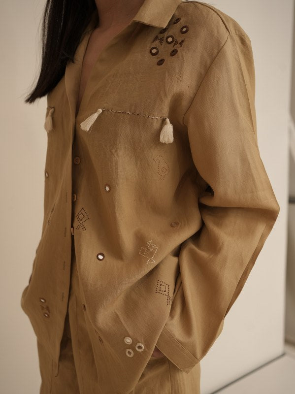 Swaroop Exclusive Design unveils our Aadhunik shirt, made from viscose linen fabric. This shirt features a classic collar, thin cuffs, and is embellished with intricate hand-embroidered mirror work, Kantha stitches, and tassel embroidery. It boasts a high-low round hemline for added flair.