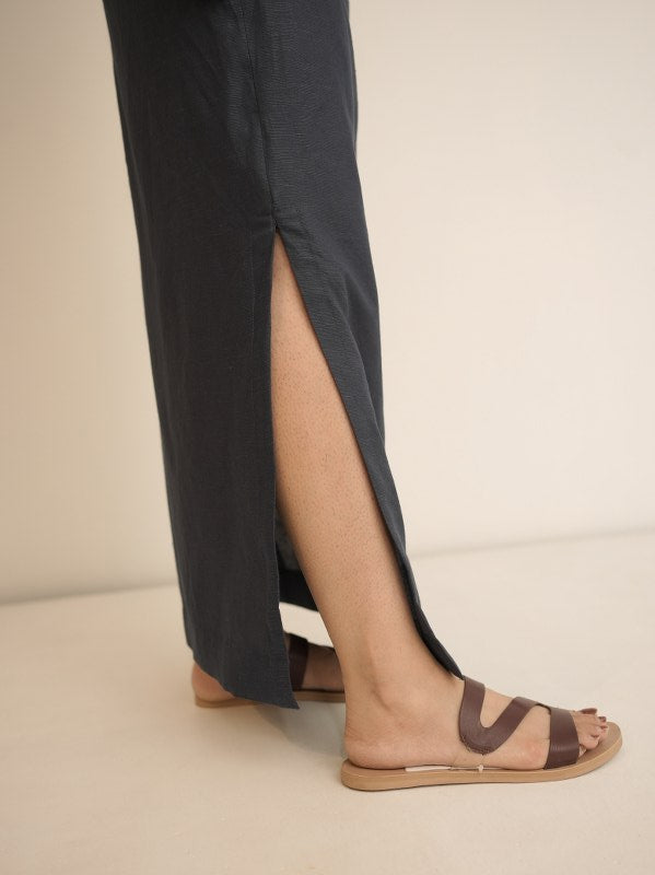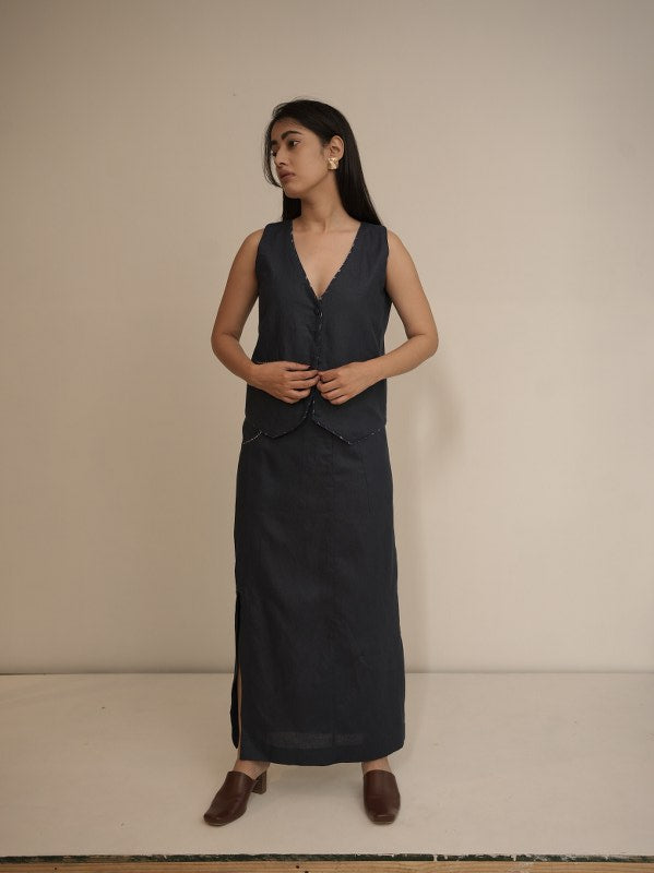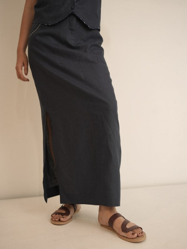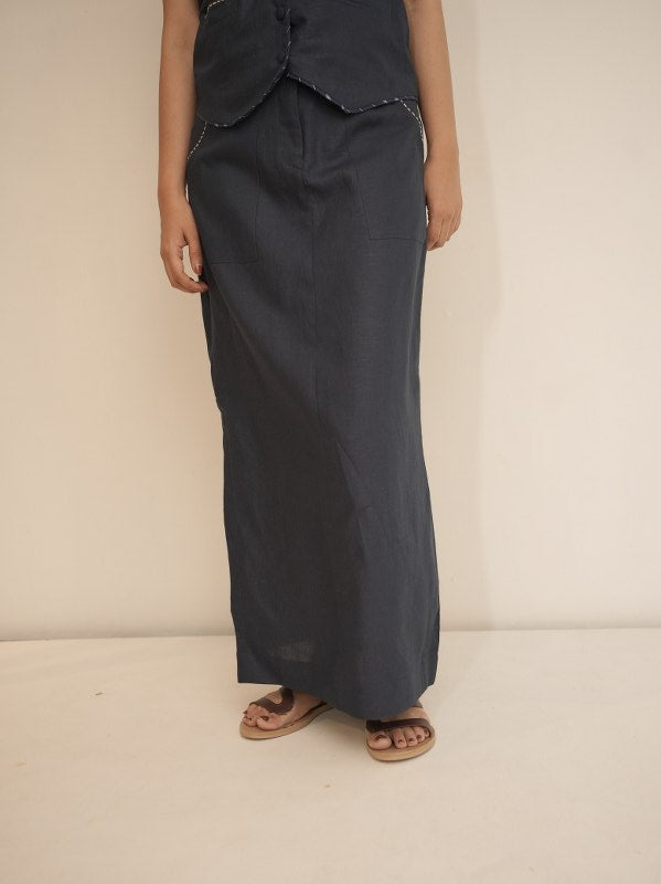 Introducing Swaroop Exclusive Designs: a high-waisted skirt crafted from viscose linen fabric, enhanced with intricate kantha stitches on the pockets. This versatile piece features a full belted waistband and a side slit, making it perfect to pair with our waistcoat. A must-have addition to your collection.