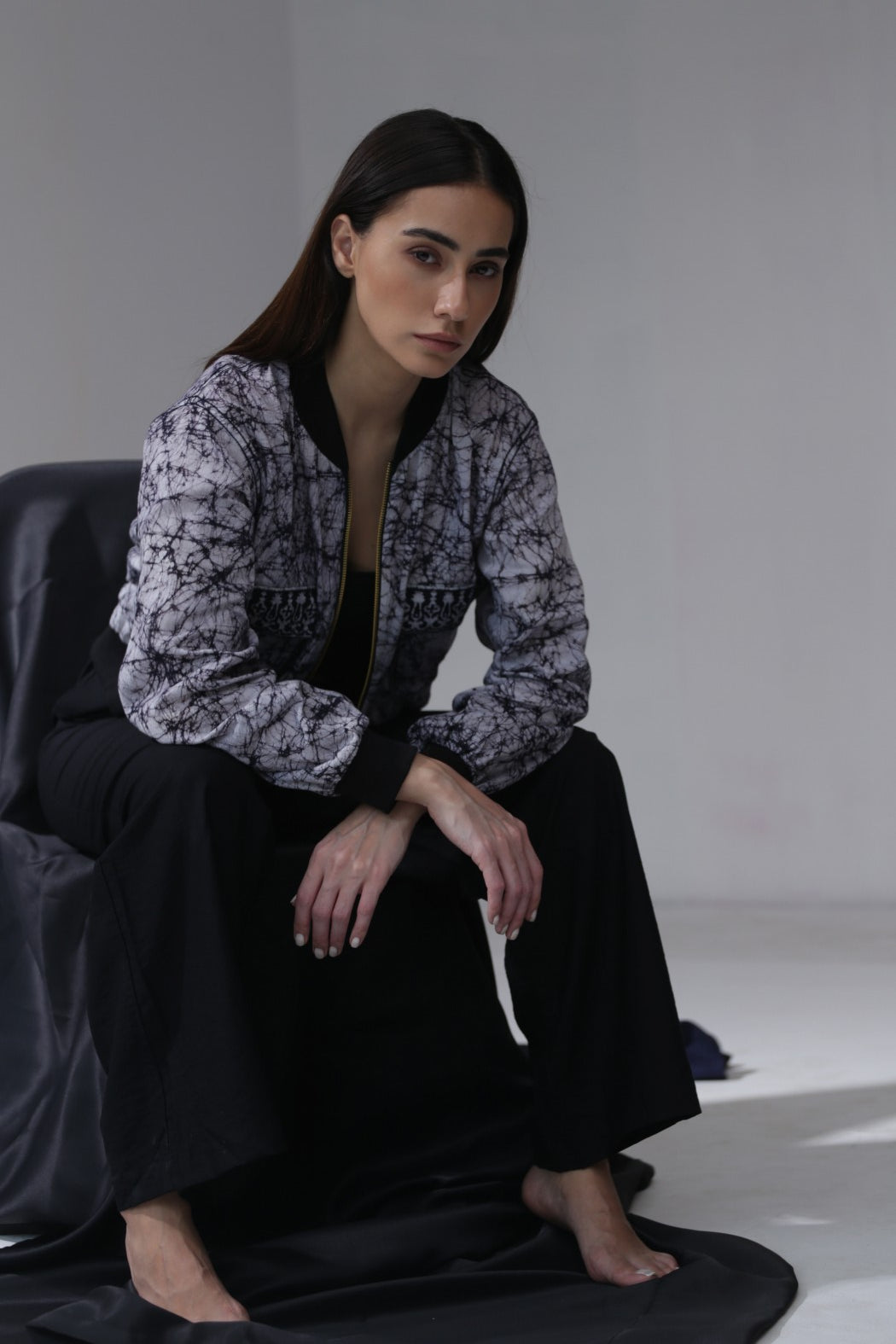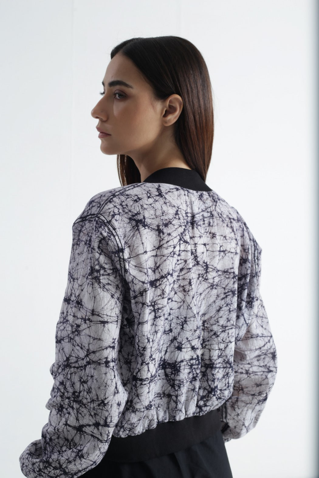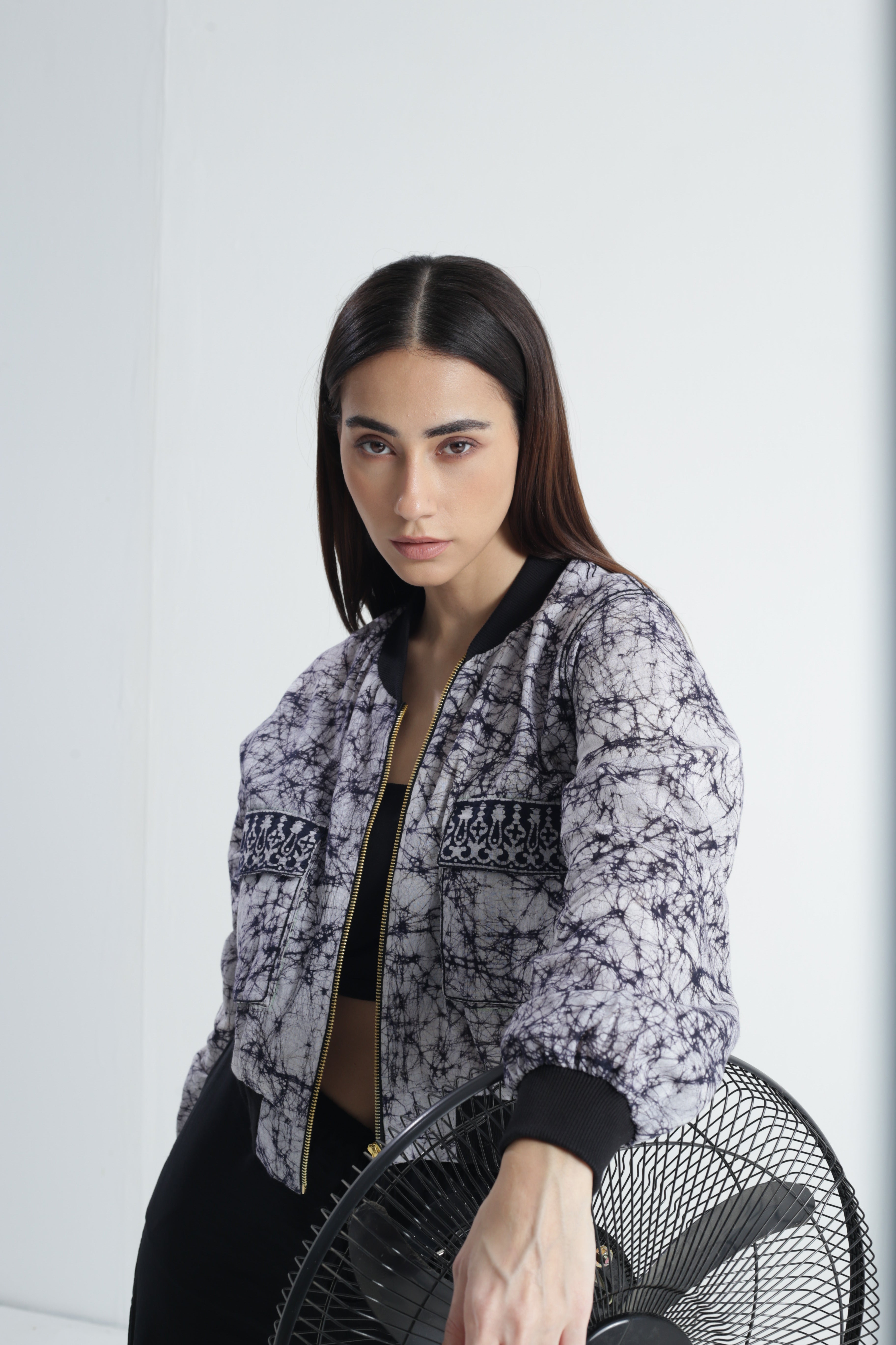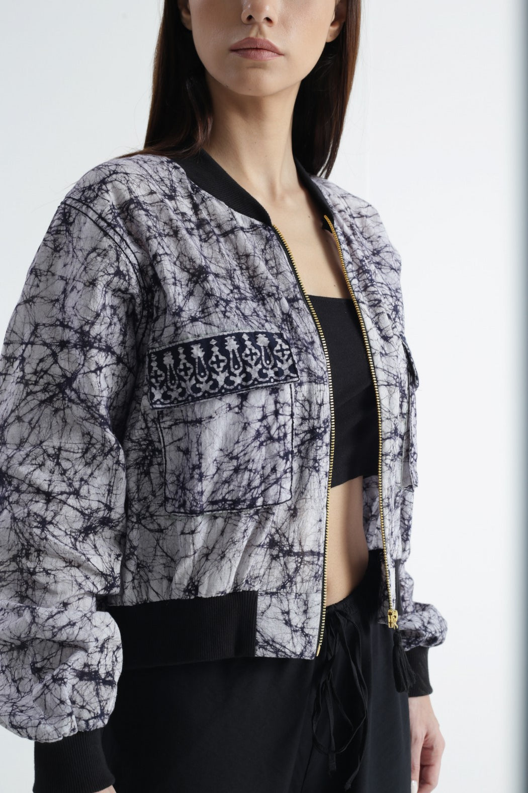 Swaroop Exclusive Design. Bhuj Bomber is a marriage between Indian textile and modern silhouette. The Fabric of the bomber is hand printed in Gujarat using traditional technique of Batik. Its front panel is enhanced with block-printed flap pockets. Crafted in a comfortable fit.