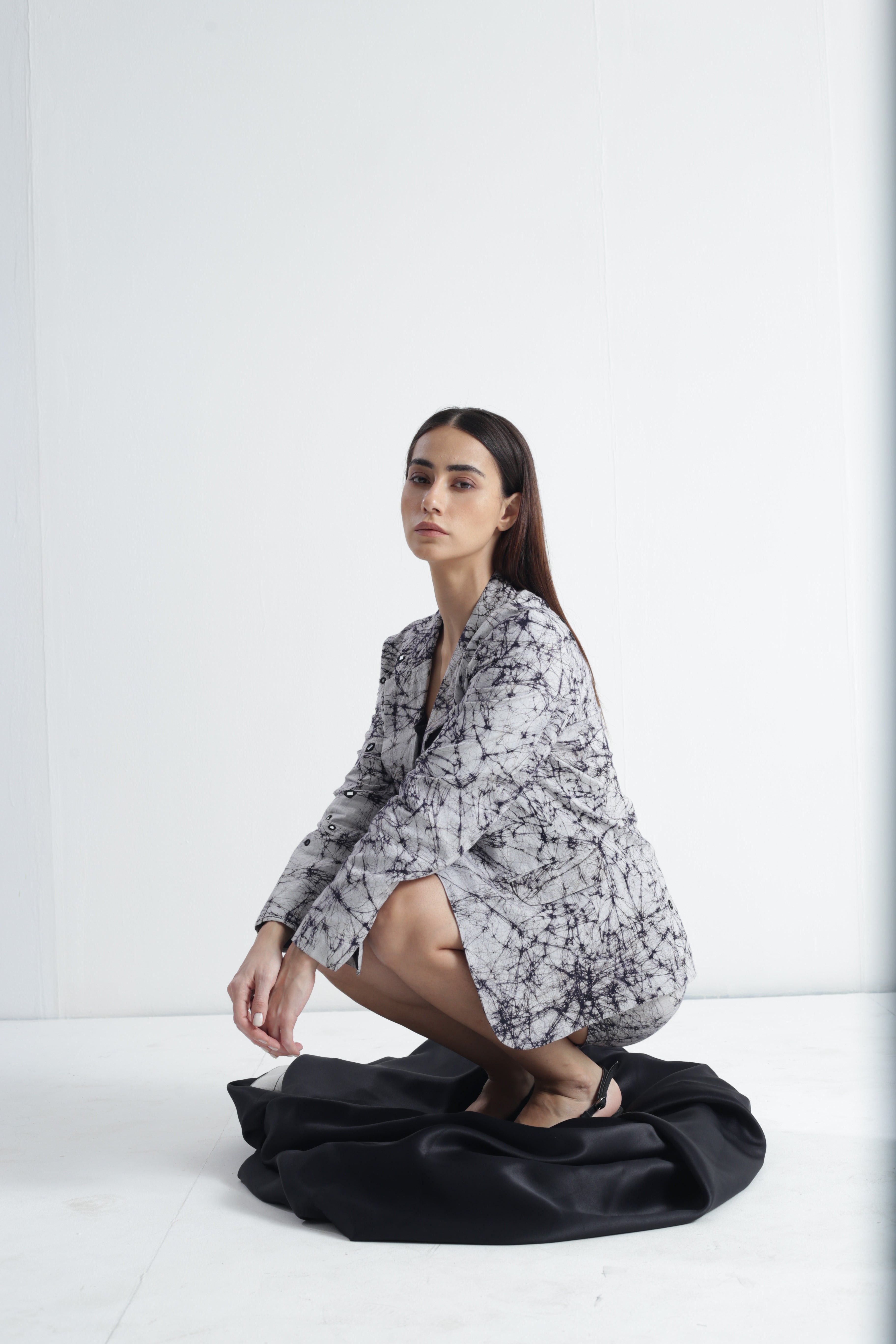 Swaroop Exclusive Design. Aji Co-ord Set is a marriage between Indian textile and modern silhouette. The Fabric of the co-ord set is hand printed in Gujarat using traditional technique of Batik. The blazer is in tailored fit. Embellished with hand embroidered mirror work all over. Paired with high-waisted shorts.
